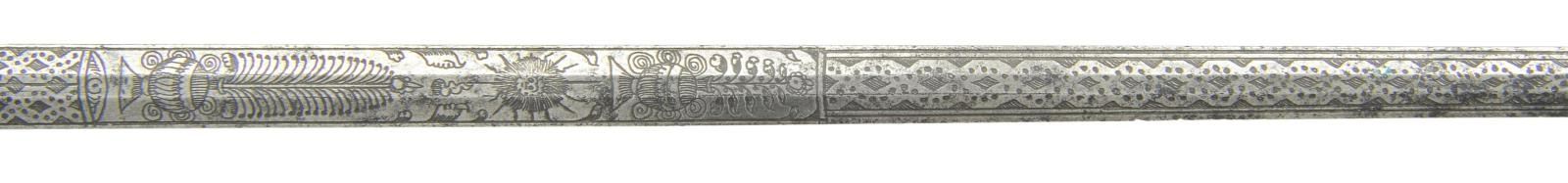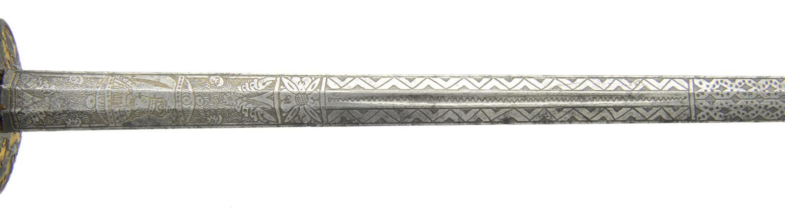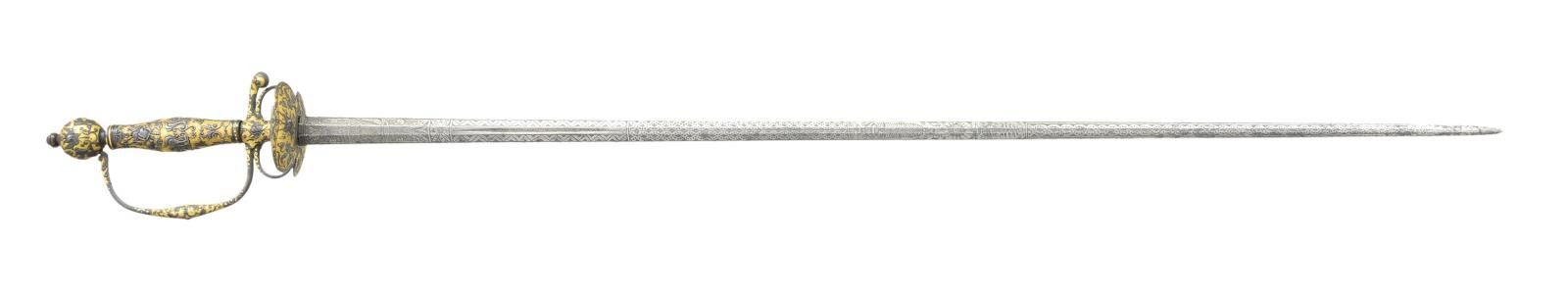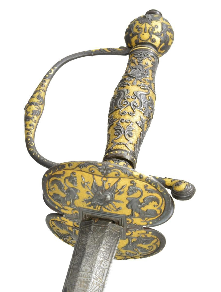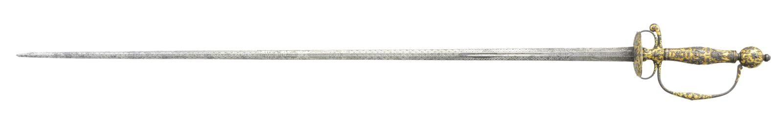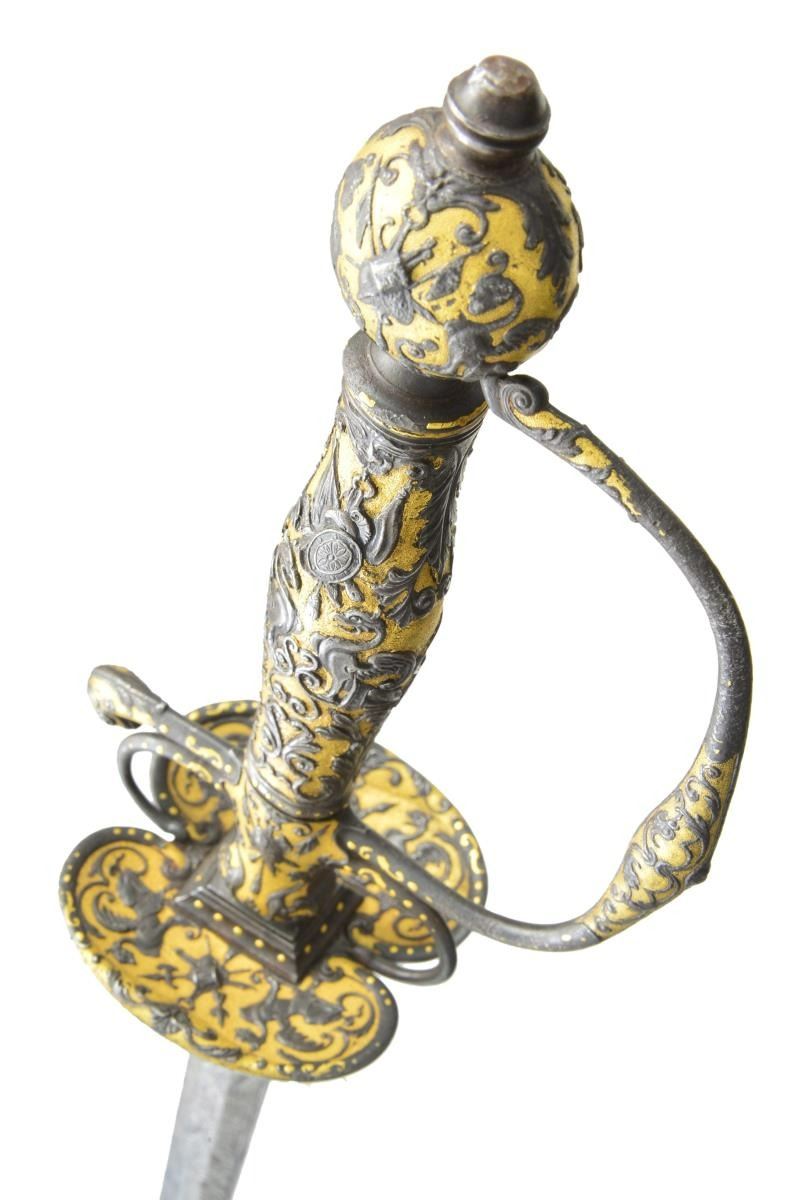 This fine quality early to mid-18th century French smallsword dates from the reign of Louis XV who took the French throne in 1715 and reigned until 1774. Overall length: 35 5/8". Blade length: 29 1/4". The early blade has 3 facets on each side with a short 4" central fuller beginning 4" from the hilt. The blade is engraved over nearly its entire length with fanciful geometric designs & scrollwork highlighted by floral & celestial motifs. Near the hilt, there is an engraving on each side of the blade featuring a king holding a scimitar. The artistically rendered iron hilt is highlighted with gold leaf & gold inlays throughout. The bottom of the double kidney guard has superior scrollwork with foliate motifs along with a stand of arms and 4-legged winged creatures. The top of the guard has very similar decoration to the underside. Tall pas d'ane with a downturned pendulous quillon. The knuckle bow is primarily decorated with scrollwork and the nearly spherical pommel again repeats the theme of stands of arms with winged 4-legged creatures. The exceptional grip has ample scrollwork combined with classical stands of arms and more winged 4-legged creatures. No scabbard. CONDITION: the blade shows light wear with a medium gray overall patina. The engraved decoration remains quite vivid & striking. The hilt is very tight and is exceptionally visually attractive with a rich patina on the iron that contrasts stunningly with the bright gold backgrounds. (02-19597/BF). $1,400-2,000.