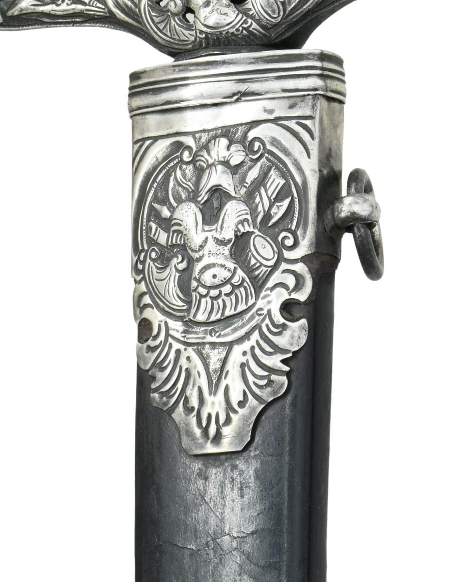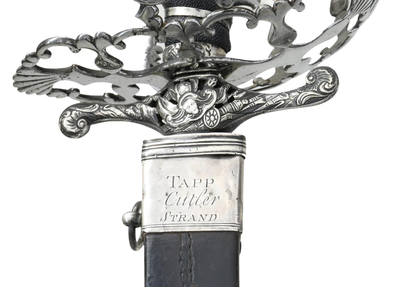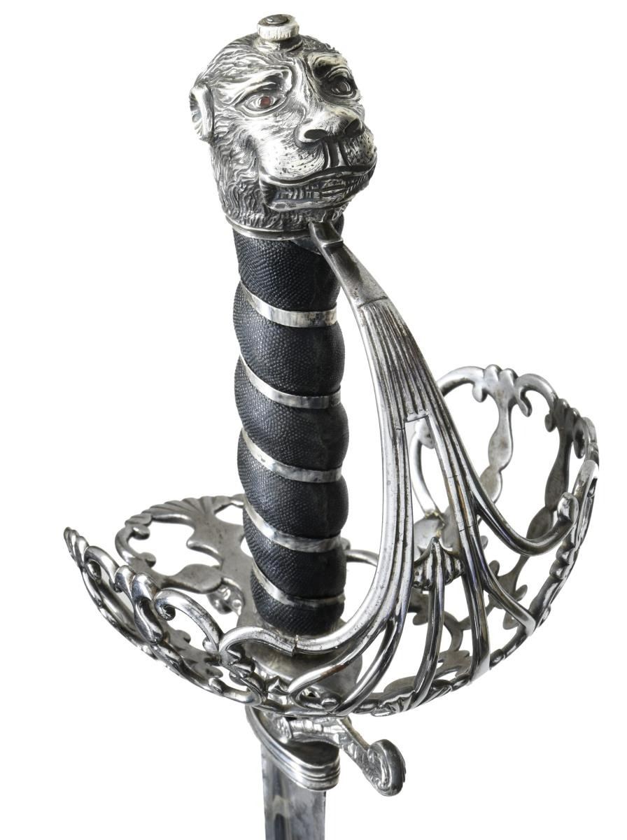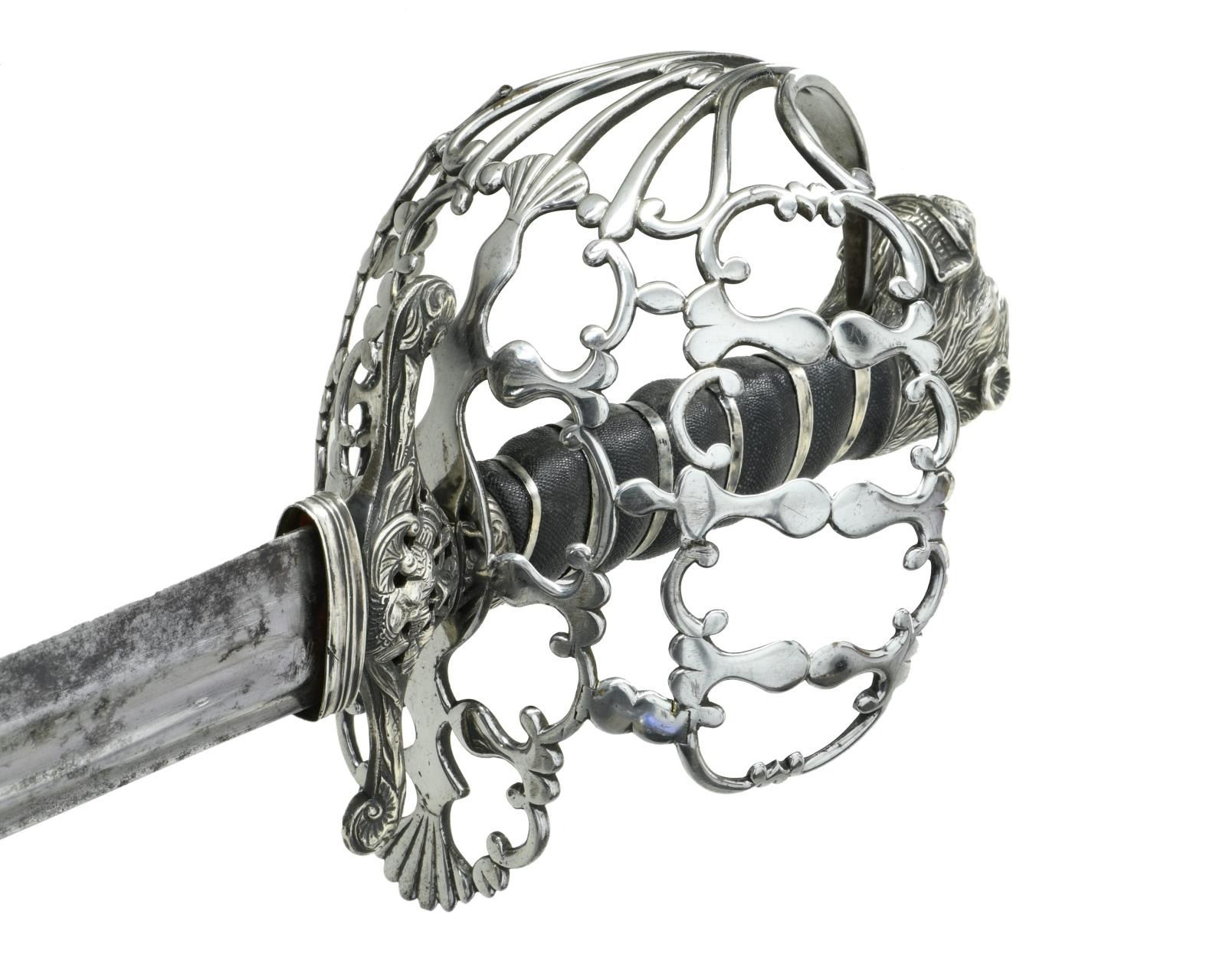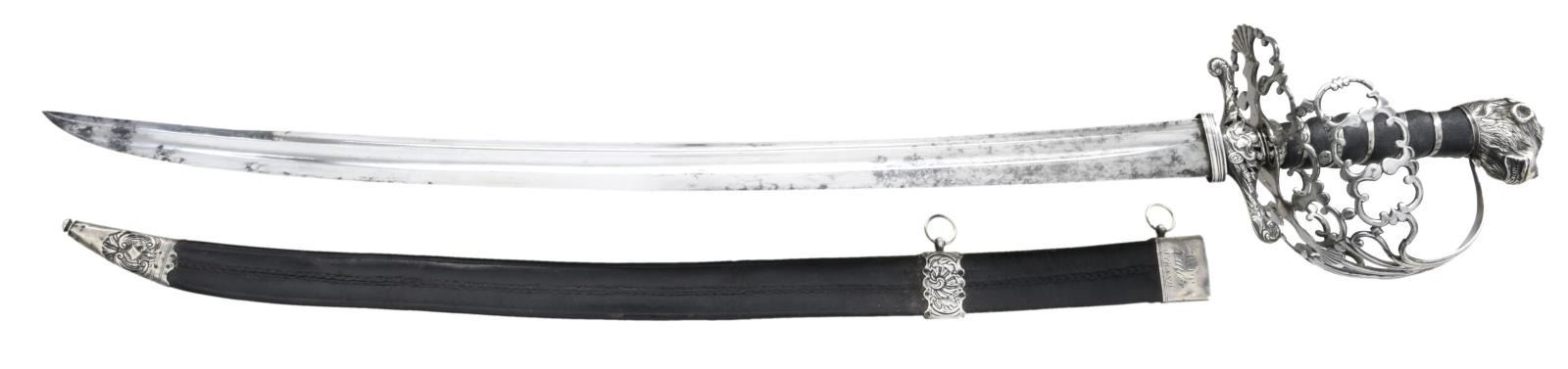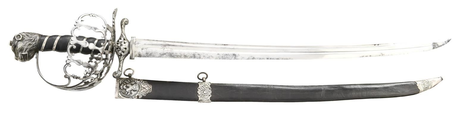 HUNTING SWORD. Overall length: 29 1/4". Blade length: 22 1/4". Plain blade has a single medium fuller with a secondary fuller near the spine. Large 4" solid silver cross guard with a downturned finial on one end and upturned on the other. The central part of the crossguard is pierced and decorated with sprays of arms on both sides. The basket-like guard is polished steel blending well with the silver mounts. The guard is quite ornate and exceptionally well done. The pommel is an unbelievably well-articulated lion's head in solid silver with ruby eyes. The black sharkskin grip has a silver tape wrap. The leather scabbard has 3 silver mounts embellished with sprays of arms. The reverse of the throat reads "TAPP Cutler STRAND". CONDITION: blade has a pleasing light gray finish with only the most minor staining. The hilt is quite solid with a few very small period repairs to a couple areas of the guard. The grip shows light wear as does the superb lion pommel. The scabbard remains quite solid, and the mounts are undamaged. A striking sword with visually impactful details & outstanding craftsmanship. (02-19592/BF). $2,400-3,200.