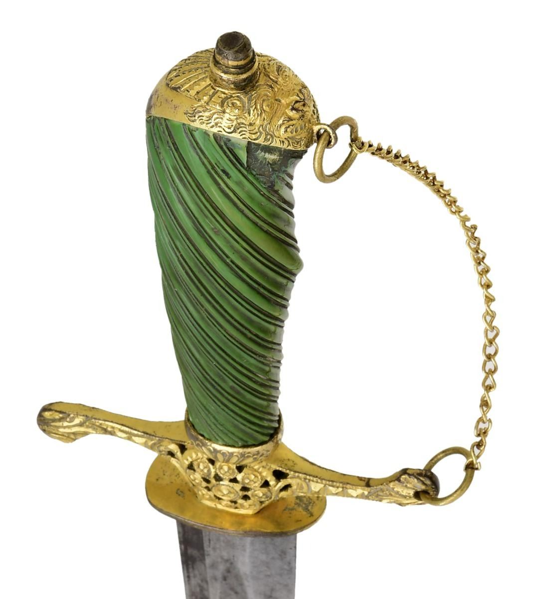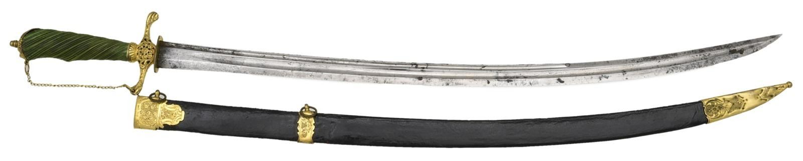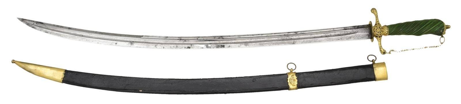 Overall length: 31 1/2". Blade length: 25". Blade has a single medium fuller with a secondary fuller near the spine. There are traces of engraving on the blade but not enough to be interpreted. Beautiful gilded brass hilt with a pierced crossguard showing facets & foliate motifs. Chain knuckle bow with small lion's head pommel. Very attractive green arsenic-dyed certifiably antique ivory grip with diagonally fluted carving. Black leather scabbard with gilded brass mounts. CONDITION: blade has been buffed and shows a light gray patina with some nicks to the edge. Original gilded finish is better than 90%. Grip has some minor chipping near the pommel. The scabbard body appears original but has been refinished. The tip of the scabbard may be a replacement. (02-20089/BF). $1,000-1,600.