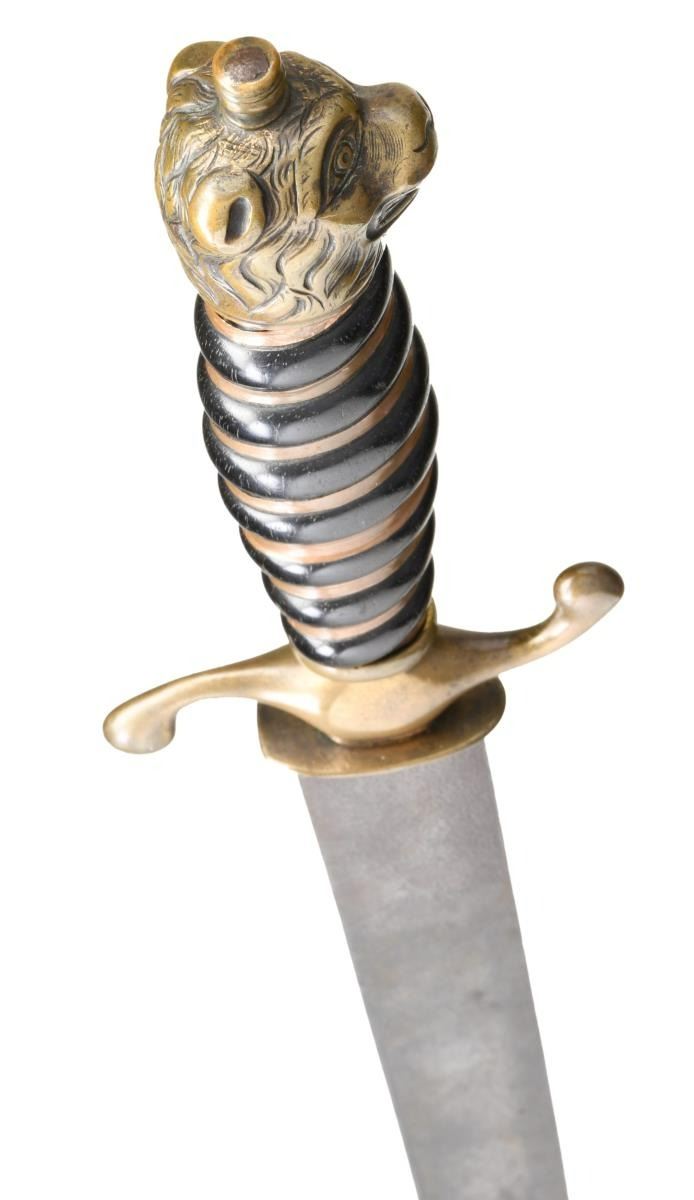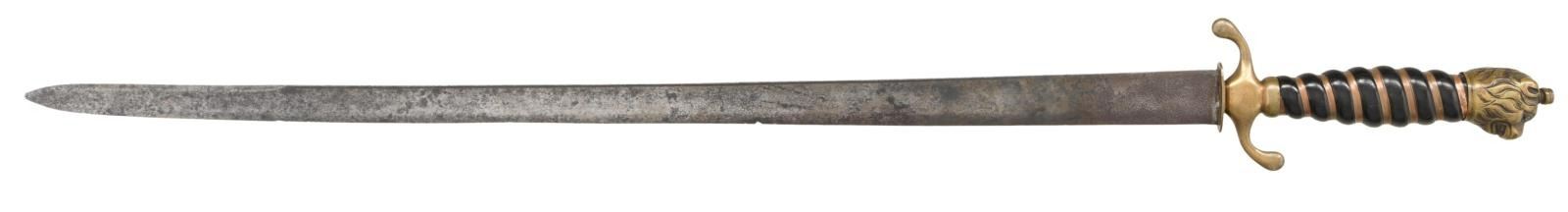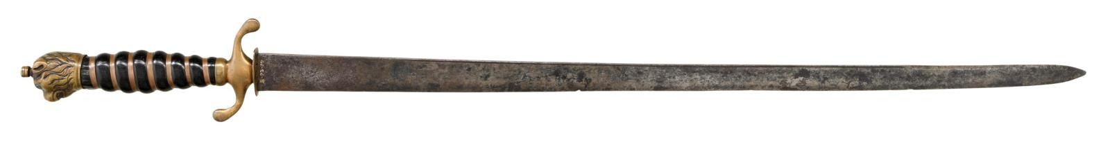 Overall length: 29 3/4". Blade length: 23 1/4". Plain blade with a 4 1/2" false edge and an exceptionally tiny fuller near the spine. Brass hilt with a plain S-shaped guard and large lion head pommel with pronounced capstan. The grip appears to be ebony with a copper tape wrap. No scabbard. CONDITION: blade has a dark, mottled overall patina. Hilt has a rich mustard patina. Grip is 98% complete. Copper tape is 100%. (02-20091/BF). $1,000-1,500.