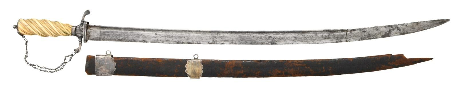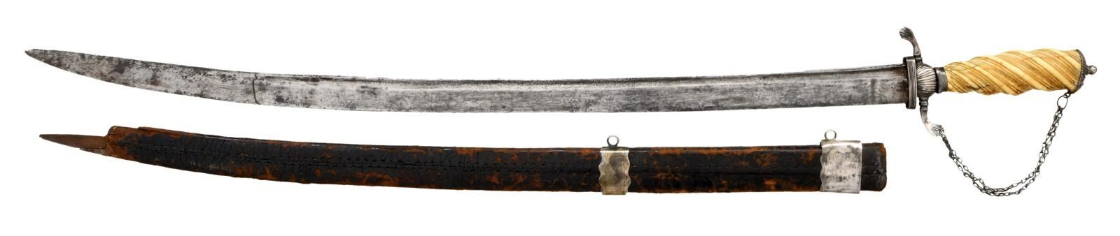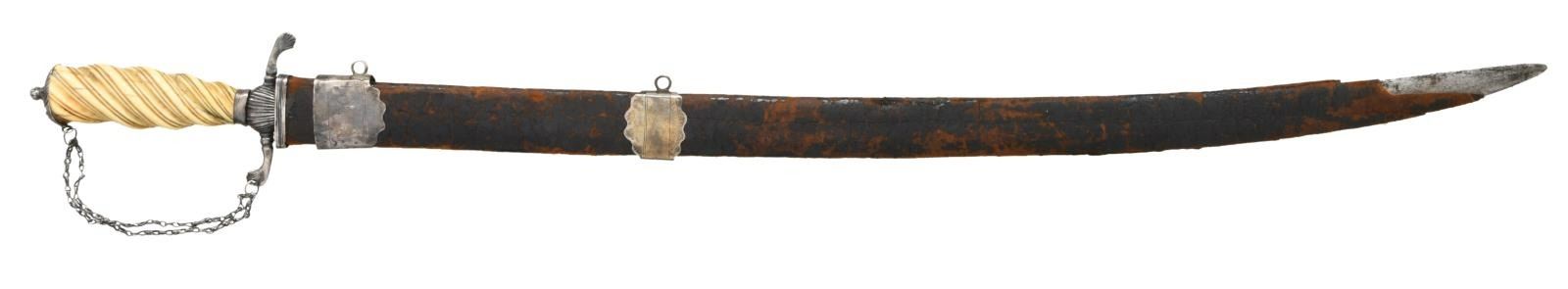 CUTTOE. Overall length: 31 1/2". Blade length: 26 1/4". Plain blade with a single narrow fuller near the spine. Silver hilt with simple S-shaped crossguard with incised ricasso. Silver chain knuckle bow with a silver pommel featuring a grotesque mask. Certifiably antique ivory grip with spiral carving. Silver mounted leather scabbard missing the tip. CONDITION: blade has a cleaned, medium gray finish. Hilt is complete but a bit loose. Silver has an attractive tarnish. Grip is nearly complete with a few tight age cracks. Scabbard is solid but quite flaked. As stated, the tip & part of the end of the scabbard is missing. (02-20090/BF). $1,000-1,500.
