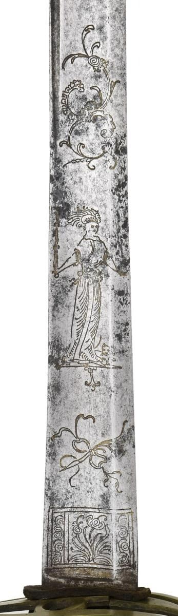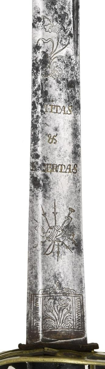 Overall length: 35". Blade length: 28". This grenadier saber appears to be from the late 18th century to the early 19th century. It is likely of French origin but may be from a neighboring country. Blade has a wide fuller with a secondary fuller near the spine. The blade is etched over the first 7 3/4" with foliate designs, a goddess, a spray of arms, and the motto "UNITAS & LIBERTAS". Brass hilt with a modified 4-slot counter guard & large semi-basket guard featuring a central flaming bomb with 3 fleur de lys. Plain knuckle bow with a plumed helmet pommel above a plain backstrap. Leather wrapped grip. Brass mounted leather scabbard. CONDITION: blade has a medium gray mottled patina. Hilt has a pleasing mustard patina with some verdigris. Grip is about 90% complete with a few period repairs. Scabbard mounts have a pleasing mustard patina; however, the bottom mount may be replaced. Leather body is a bit flaked and somewhat flexed. (02-20081/BF). $700-1,200.