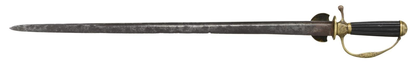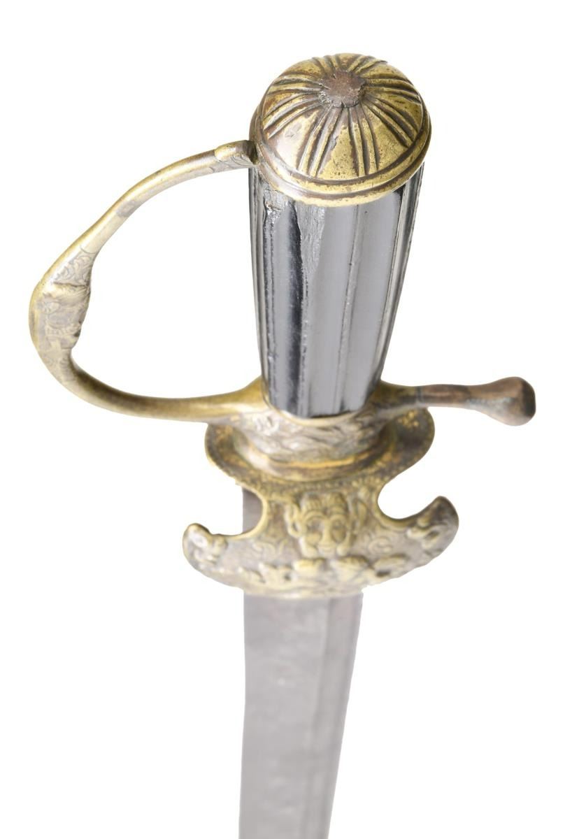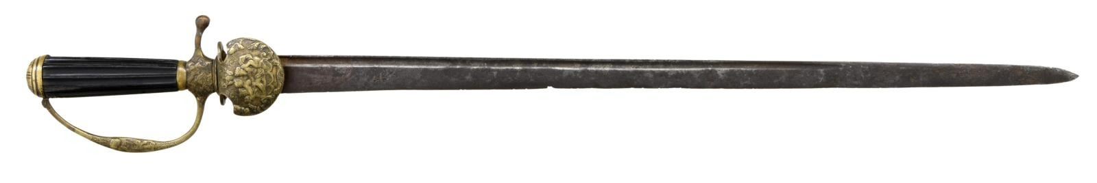 Overall length: 27 1/4". Blade length: 22 1/4". Plain blade with a single narrow fuller near the spine. There is a stamped fleur d'lis. Brass hilt with a sharply turned down counterguard featuring what appears to be Dionysus & Cupid. The ricasso shows a similar scene as noted on the counterguard. The sword has a replaced pendulous quillon and a knuckle bow that emulates the decoration on the rest of the sword. Brass pommel with linear decoration. Dark wood, fluted grip. No scabbard. CONDITION: blade has a dark overall patina with scattered spots of moderate pitting. Hilt has a deep patina and remains quite solid. (02-20092/BF). $600-1,000.