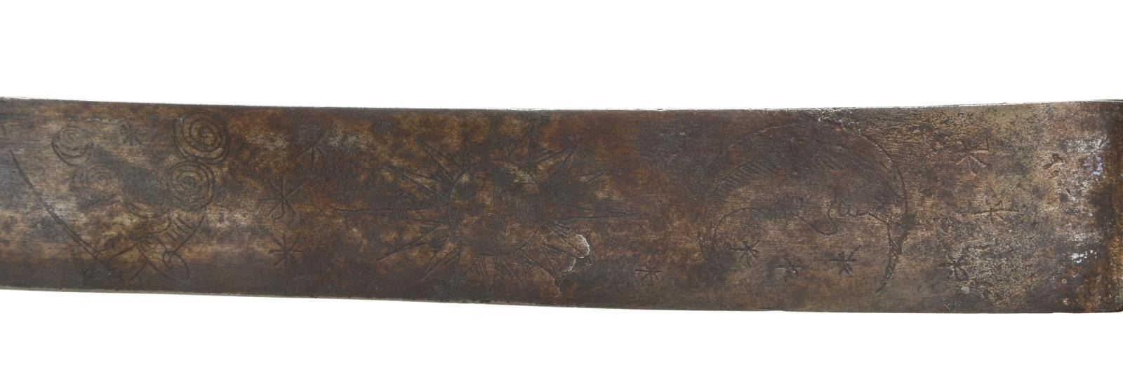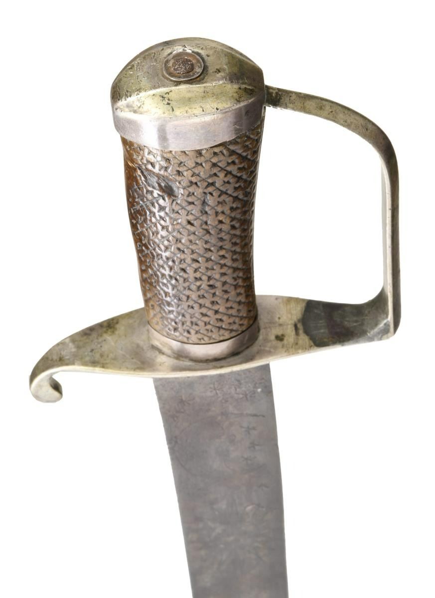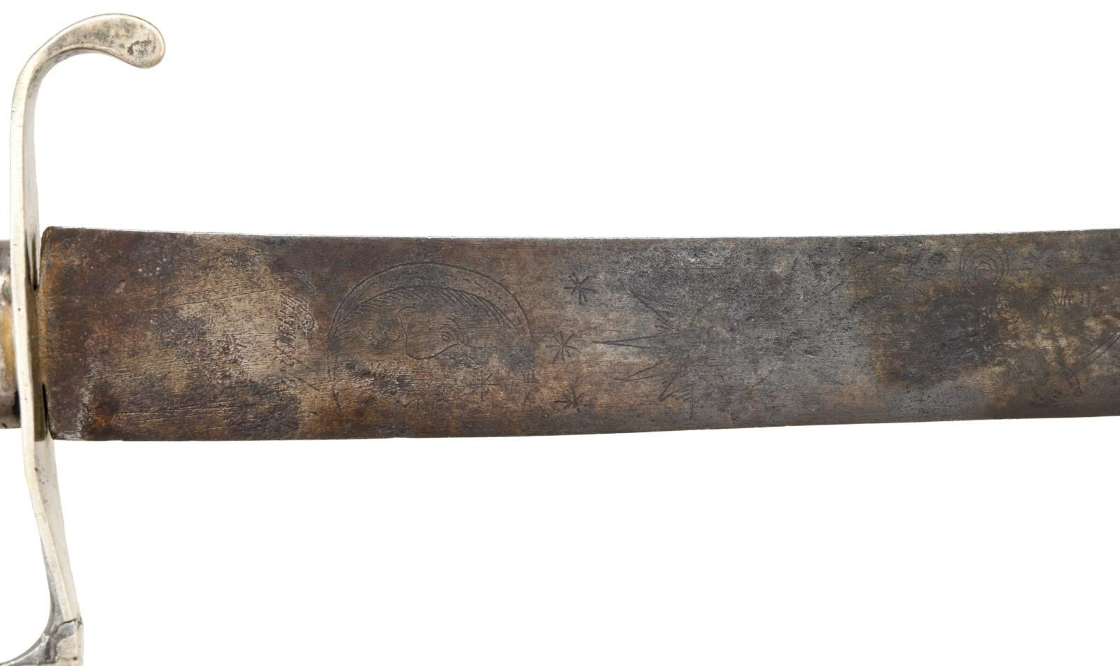 Overall length: 35 3/8". Blade length: 30 3/4". Blade has triple narrow fullers that have historically been associated with Spanish manufacture, but have been recently shown to be of German manufacture. These blades were imported in large numbers to this country during the Colonial and early Federal period. The blade is decorated near the hilt with several talismans including the sun, moon & stars, the arm & sword in a cloud, and more stars. The blade is signed but is somewhat illegible due to wear. The signature appears to be "V.HRSCHL___". Silver hilt with plain crossguard & downturned quillon. Plain chamfered knuckle bow leading to a plain pommel cap. Wood grip with carved checkered design. No scabbard. CONDITION: blade has a dark medium gray patina. Engravings remain generally clear. Hilt is loose and a bit misshaped. Grip shows light wear. PROVENANCE: From the Collection of James B. Taylor. (02-19885/BF). $600-900.