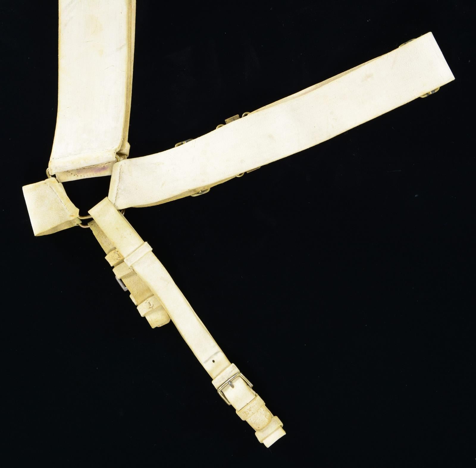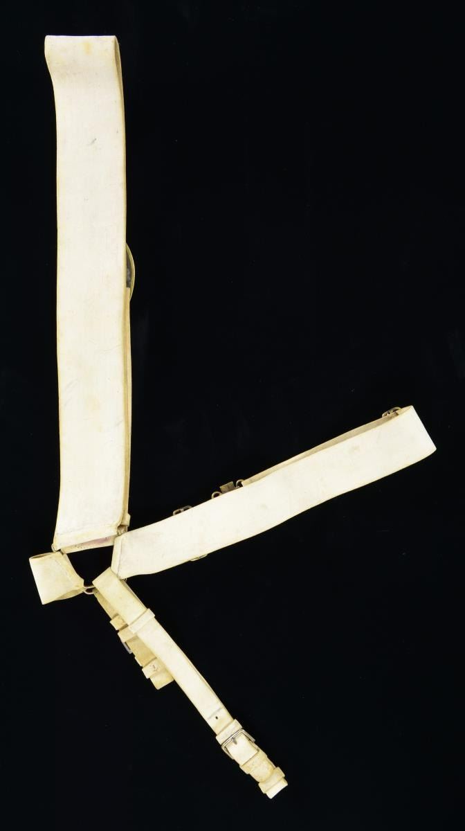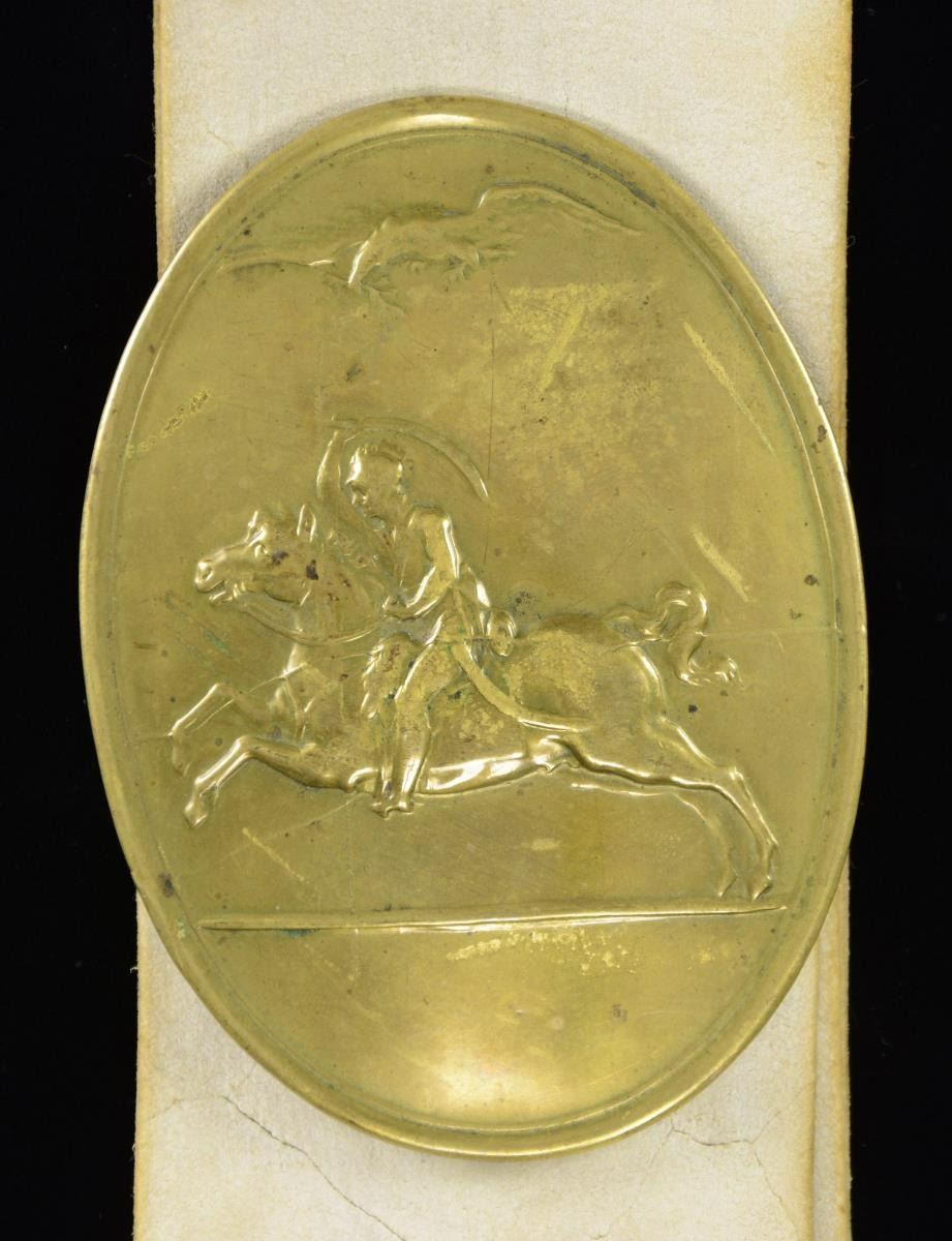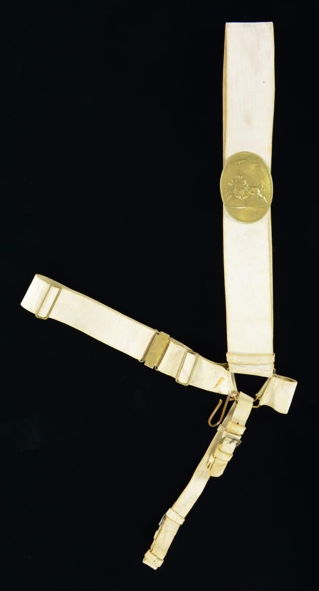 BELT, WAIST BELT, & SWORD HANGERS. This rare plate was originally designed in 1804 and saw significant use during the war of 1812. This, and similar dies, can be found on various cross belt plates, as well as hat plates used throughout the first half of the 19th century. This plate likely dates to the 1820s or 1830s. Since it shows light die cracks in the 3 o'clock & 9 o'clock positions. The plate is a gilded brass skin over an iron body. There are 3 hooks in the back positioned, as seen on most cross-belt plates. The cross belt, waist belt, & saber hangers are fine quality white buff leather. The waist belt has a simple unadorned buckle closure. This is likely a militia dragoon officer's belt rig that probably carried an exceptionally high-grade eagle head mounted officer's sword. CONDITION: buckle shows light overall wear with no damage to the front or back. The belts are in solid condition and remain quite pliable & strong. (02-20958/BF). $3,500-4,250.