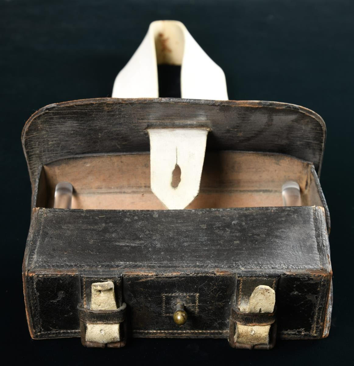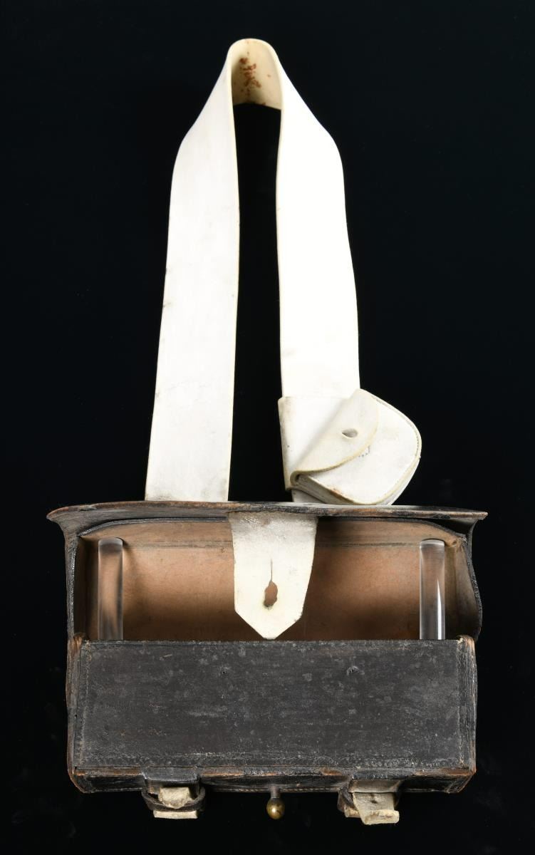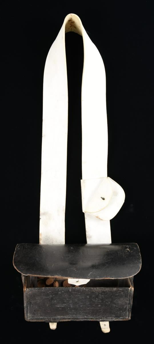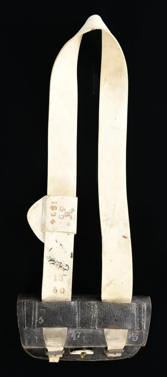 SLING & CAP BOX. This is a fine example of a British Enfield cartridge box of the Civil War period. The large box measures approx. 10 3/4" x 5" x 3 1/2". It has an outer & inner flap with a large white buff securing tongue. There is no insert in the box but it does contain a number of small leather discs. Box is complete with original white buff leather shoulder sling and its white buff small sliding cap box. There are a number of numerical markings on the back of the box, as well as the sling & cap box. CONDITION: surprisingly, the box, sling & cap box show very light overall wear. PROVENANCE: From the Collection of James B. Taylor. (02-19905/BF). $1,400-1,800.