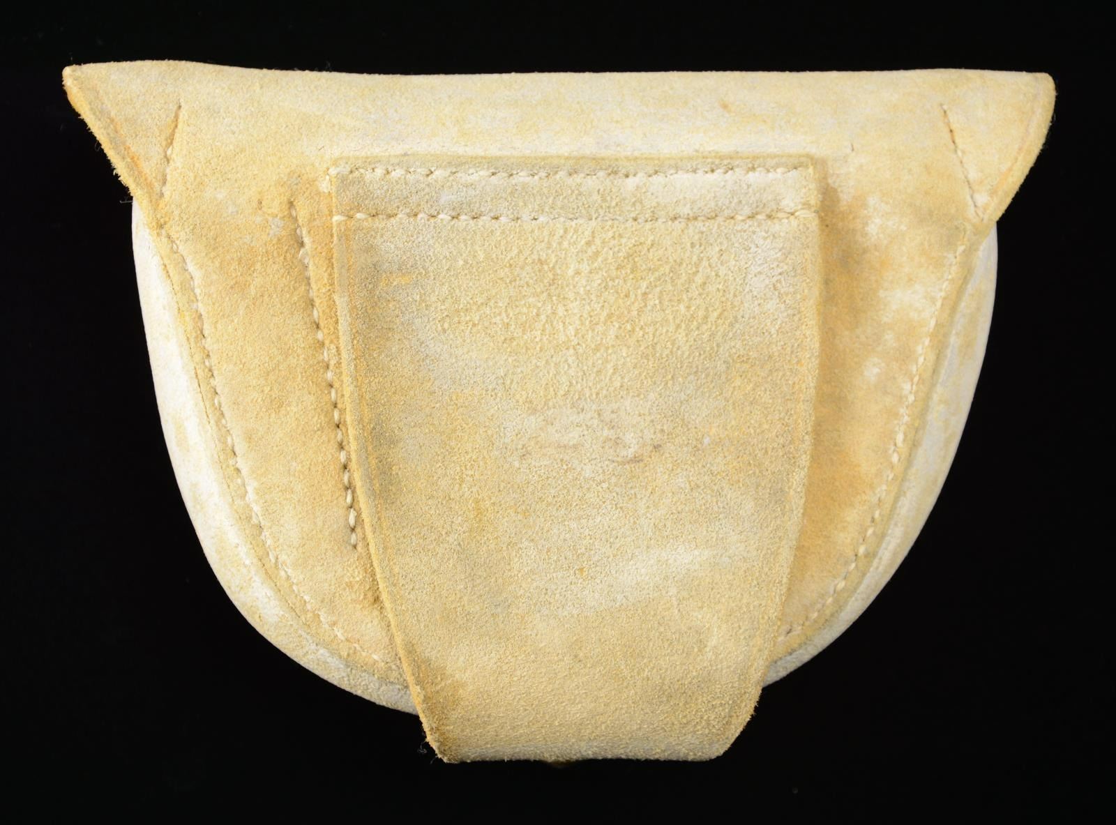 A fine example of a P1859 British ball pouch for the P1853 Enfield rifle. The Enfield rifle was imported in large quantities by both the Confederacy and the Union. The pouch is made of heavy white buff leather with a top flap that secures with a closing strap. The interior is lightly marked with a broad arrow & initials. The reverse has a single wide belt loop secured at the base in a similar manner to the top flap. CONDITION: this example has seen some use but remains in nice condition with flexible leather & substantial white finish remaining. (02-20108/BF). $800-1,200.