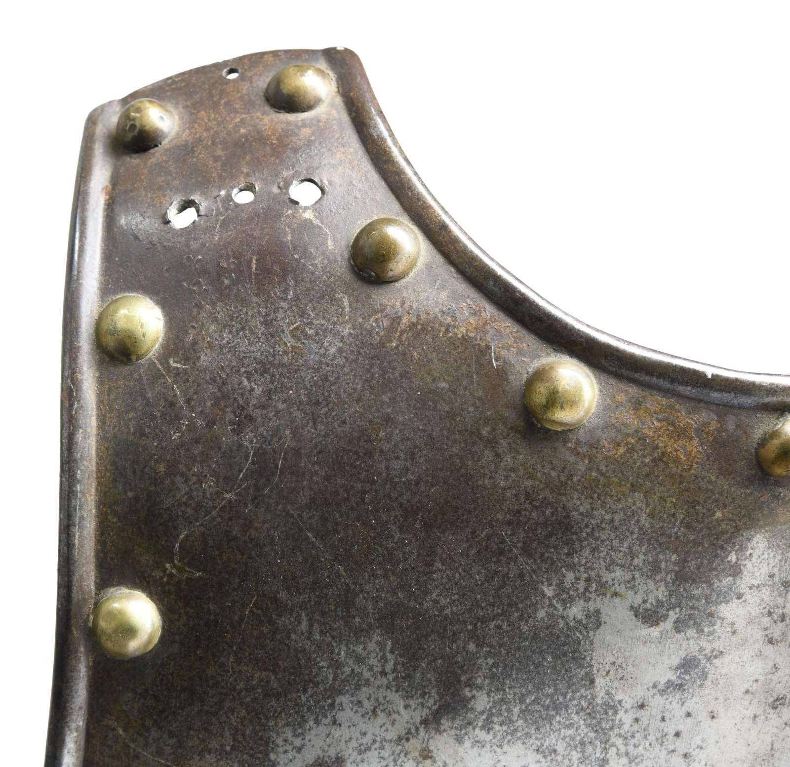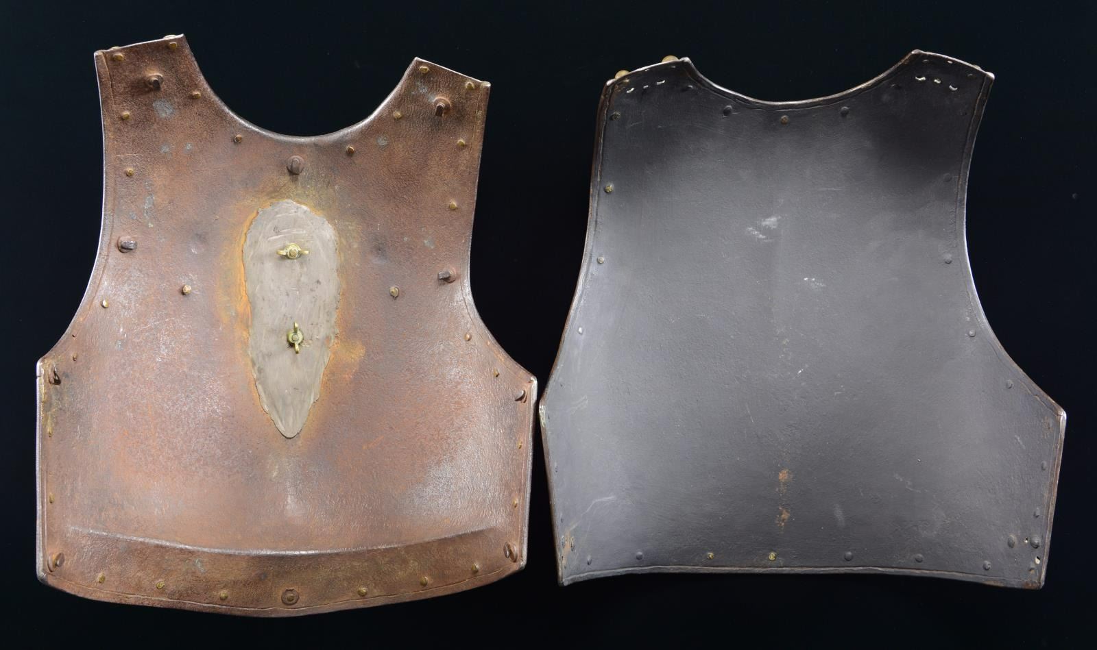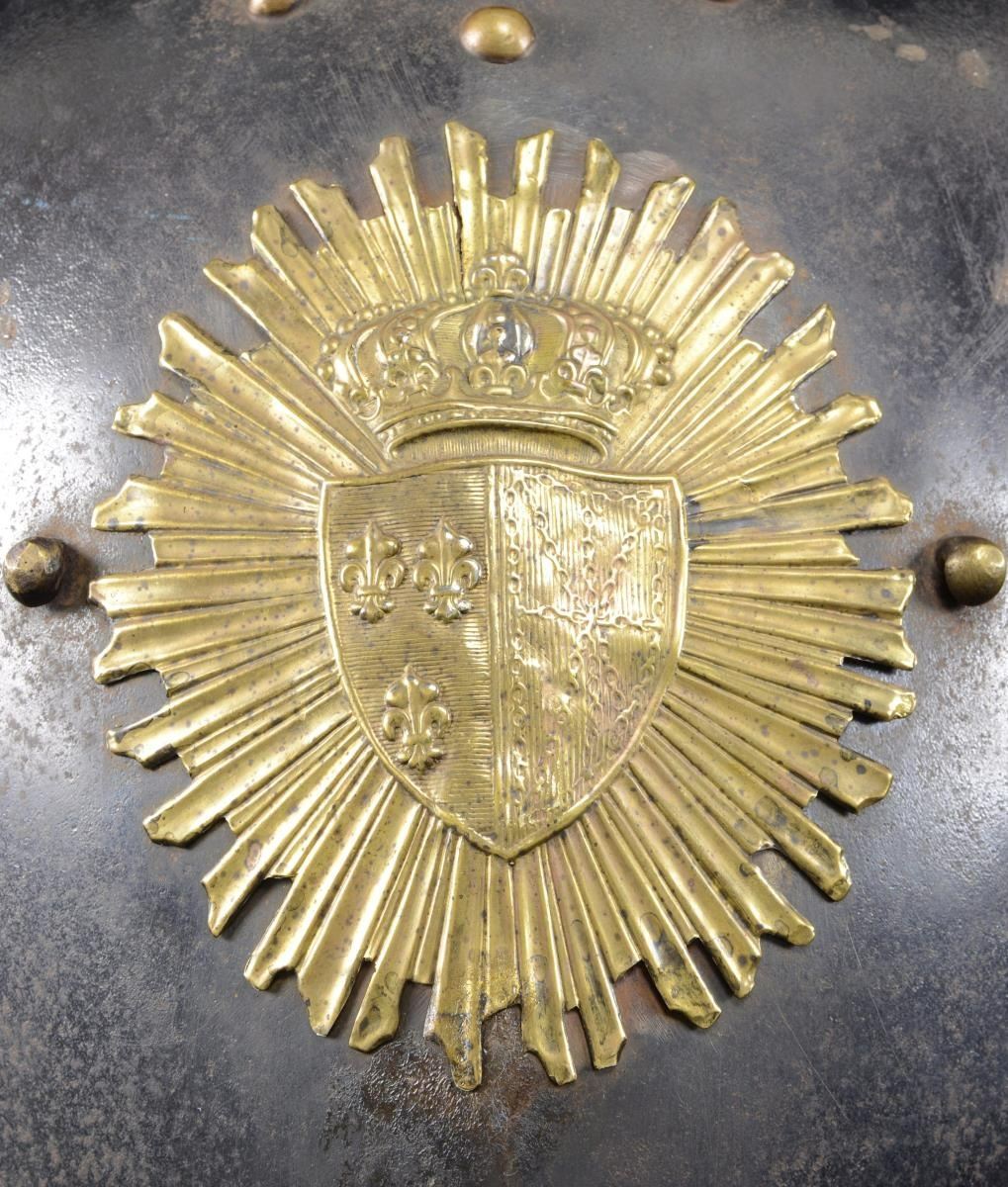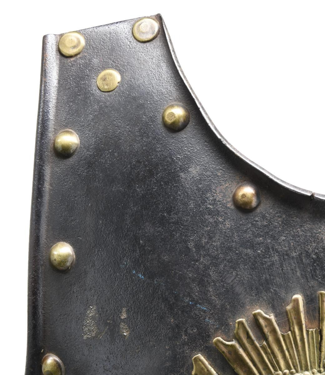 BACK PLATE. This iron & brass set of Royal Guard Cuirassier armor appears to date between 1815 & 1848. The chest plate measures approx. 14" x 15", and the back plate measures approx. 14" x 16". The front plate is bordered by large brass domed rivets with 3 flat brass rivets on each side of the top. The center of the chest plate has a large starburst superimposed by a royal shield with crown above. The interior has 5 iron hooks around the body and 2 similar iron hooks at the shoulders. The front plate appears to be held on by 2 large brass wingnuts. The back plate is relatively plain but is also bordered with domed brass rivets all the way around the plate. CONDITION: iron has a general dark patina. The brass has a mellow patina. The armor shows expected wear but has no major faults. (02-20128/BF). $1,500-2,000.