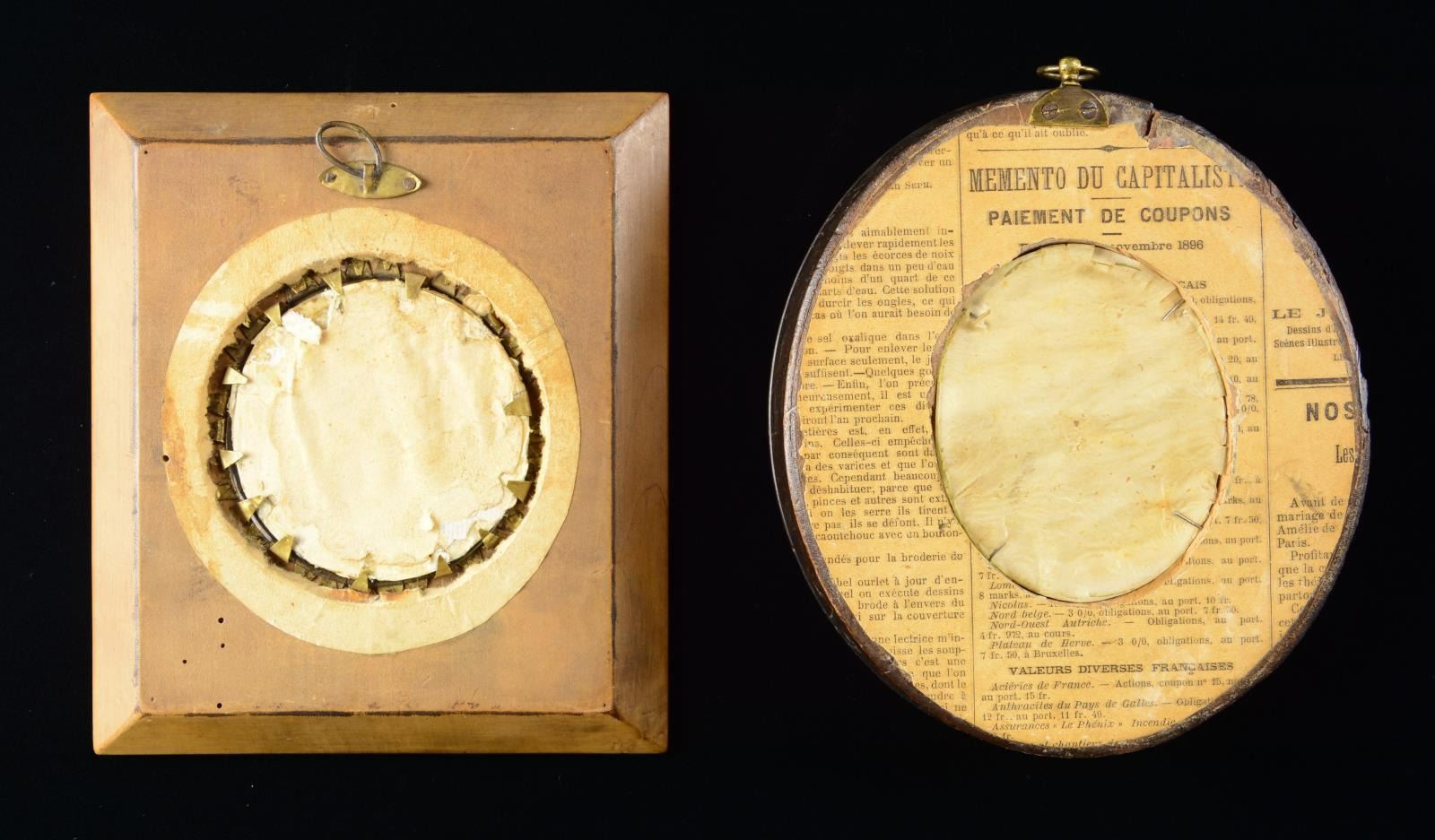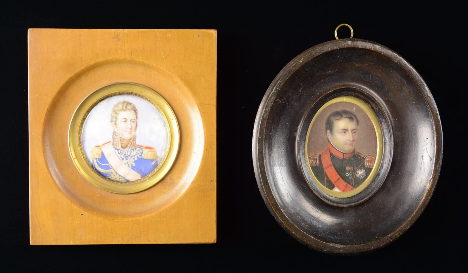 1) NAPOLEON. This is a portrait of a fairly young Napoleon Bonaparte in full-dress military uniform wearing a red over-the-shoulder sash, along with 2 medals & one badge. It is a mid-chest up view of Napoleon looking to his left. The portrait measures approx. 3" x 2 1/4", and the oval frame measures 6 1/4" x 5 1/2". The portrait is signed on the right side "Grandeau 1815". There is a portion of newspaper covering the reverse that has the date "1896" visible. CONDITION: frame shows light wear with a few minor chips & scratches. Portrait remains undamaged & quite vivid. 2) MARSHAL. This is a portrait that appears to be a Marshal of France, possibly of the Napoleonic period. The gentleman wears a blue coat with elaborate gold embroidery on the chest and the exceptionally high collar. He has a 3-strand gold aiguilette and red & gold epaulettes. He also has been painted wearing a white sash. It is a mid-chest up view of the Marshal looking to his left. The round portrait is approx. 3" in diameter, and the rectangular frame measures 6 1/4" x 5 3/8". CONDITION: portrait is quite crisp & sharp. There appears to be minor discoloration to the extreme edges. The frame shows light overall wear. (02-20138/BF). $800-1,200.