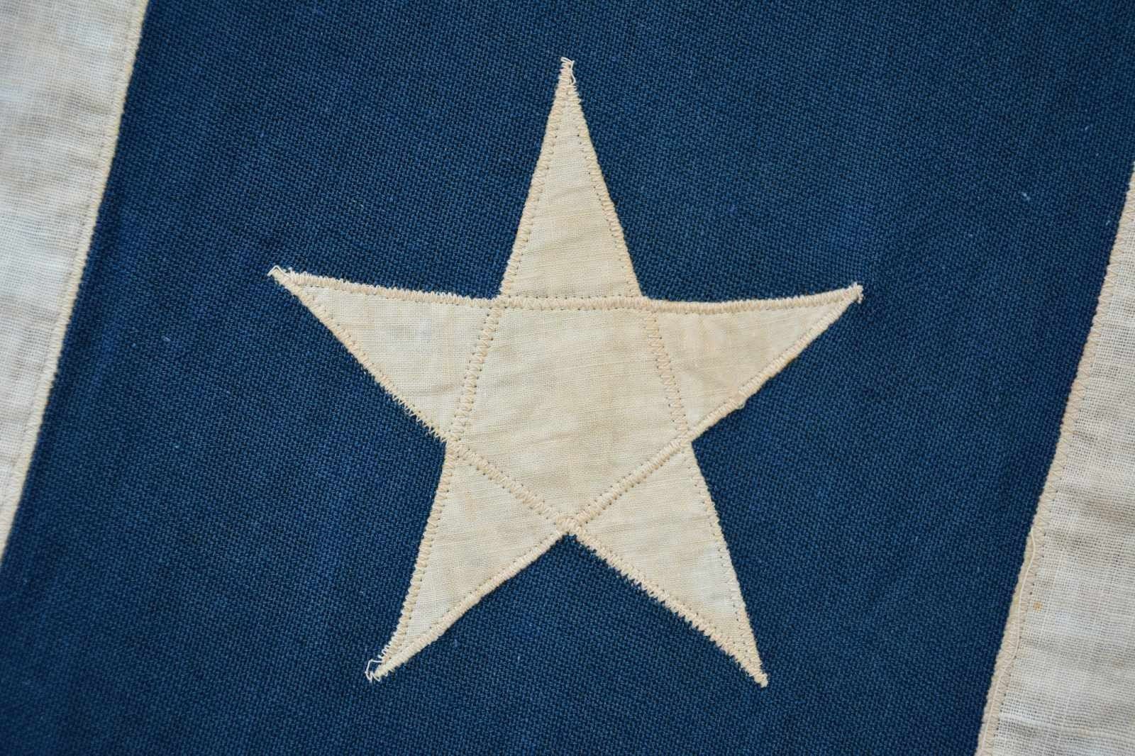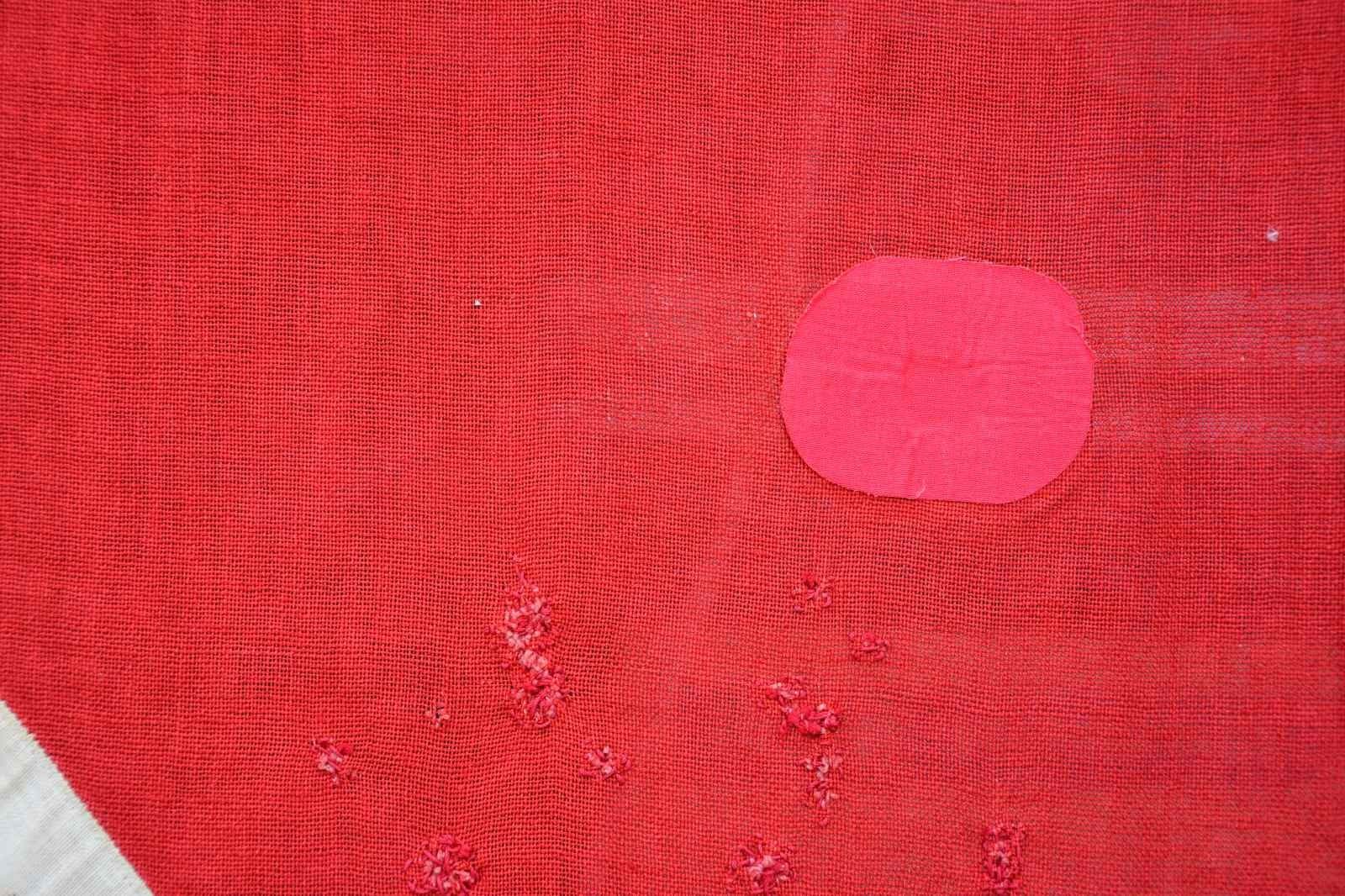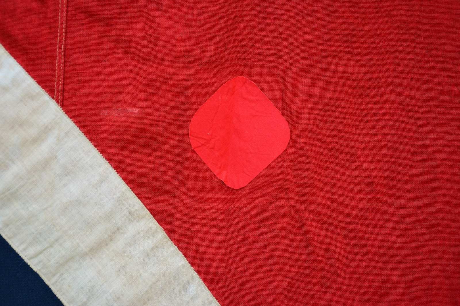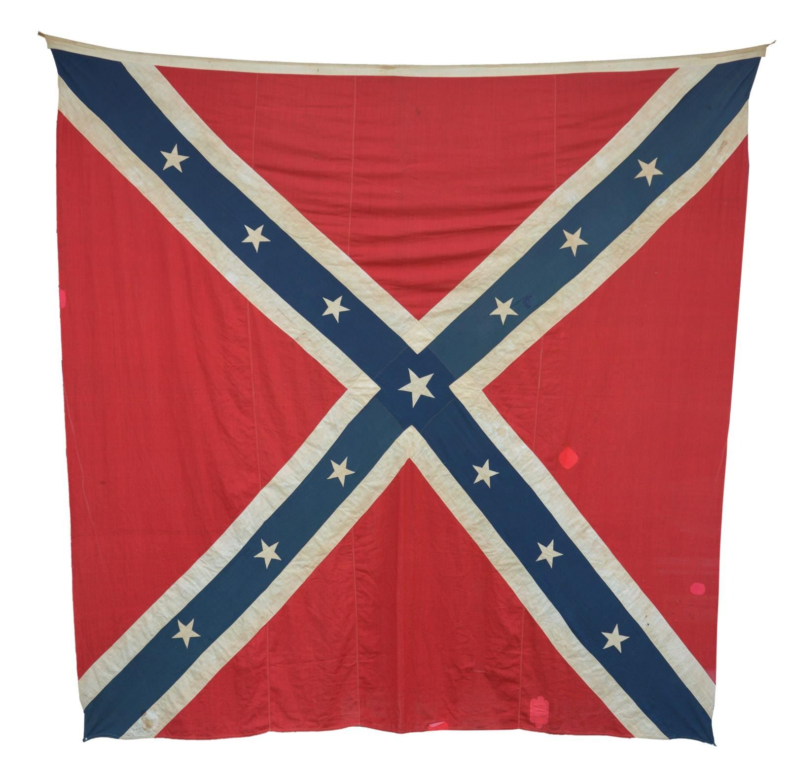 BATTLE FLAG. This battle flag measures approximately 119" x 116", and its basically square measurements identify it as an Army of Northern Virginia battle flag. This size flag would have been flown from a large pole or possibly used as a casket flag. The construction & material used on this flag indicate manufacture in the early to mid-20th century. The flag has a white-bordered blue cross with 13 stars all on a red field. It has a sewn white hoist with a rope halyard. CONDITION: the flag is substantially quite solid with a few small holes from use and a few other holes repaired with red iron-on patches. (02-20123/BF). $400-600.