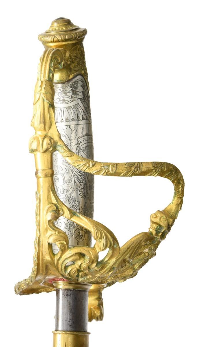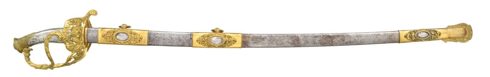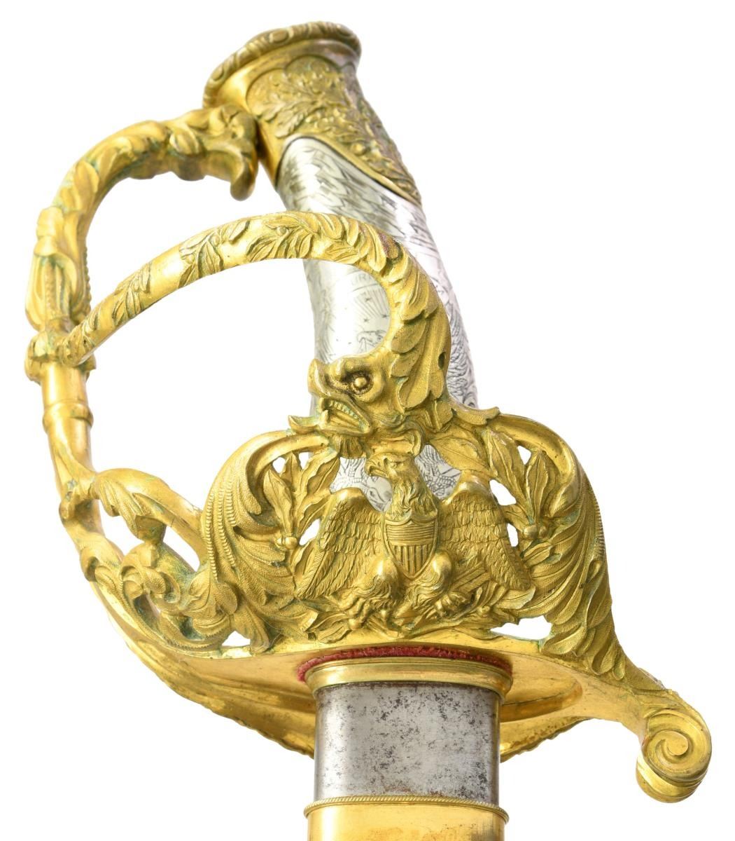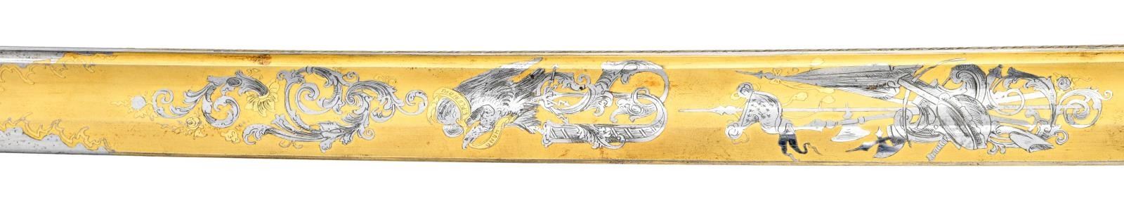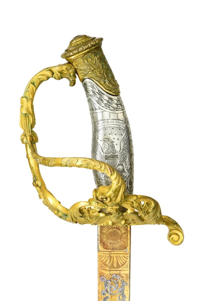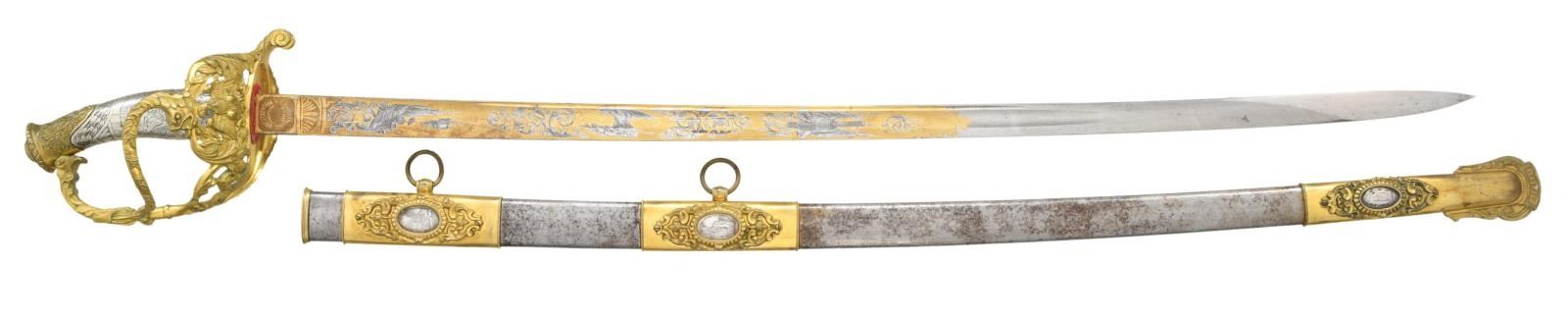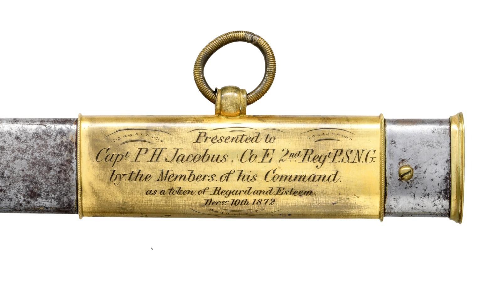 PRESENTATION SWORD BY HORSTMANN TO CAPTAIN JACOBUS. The sword's overall length is 40 1/4" with a stunning 33", gold embellished blade. The blade has a single wide fuller and a single narrow fuller near the spine. The first 19" of the blade are covered in gold with white etching. The etched motifs include stands of arms, an American eagle, a large "US", and various foliate motifs. The ricasso is etched "W.H. HORSTMANN & SONS PHILADELPHIA" on one side. The other side is stamped "CLAUBERG (knight) SOLINGEN". The exuberant heavily gilded brass Civil War style hilt features a semi-basket guard with well-articulated acanthus & laurel leaves surrounding a spread-wing American eagle with shield on chest. The single branch terminates at the guard with a sea monster's head. The tail is wrapped with a vine and extends to the mid-point of the knuckle bow. The knuckle bow is highly adorned with a leaf motif. The pommel has an American shield on the front with deeply carved acanthus leaves. The silver grip is completely etched in a staggard leaf design with various flourishes surrounding a large engraved spread-wing American eagle under glory with a ribbon that reads "E PLURIBUS UNUM". The red wool pad is still present at the base of the ricasso. The gilded brass mounted iron scabbard has 3 heavily gilded mounts. Each mount has a 1 1/2" engraved silver oval embellishment. The top oval pictures and eagle on shield, the middle mount oval features a Greek goddess, and the silver panel at the drag mount appears to depict Columbus. The rear of the top mount is engraved "Presented to Capt P H Jacobus, Co E 2nd Regt P.S.N.G. by the members of his command. As a token of Regard and Esteem. DECER 10th 1872". Captain Peter Henry Jacobus served honorably in the Pennsylvania National Guard from 1857 through 1895, a total of 38 years. He first enlisted for 3 months in Company E of the 19th Pennsylvania Volunteers as a First Sergeant, and subsequently moved to the 90th Pennsylvania as a Captain. On August 30th of 1862 he was wounded in his right leg at the 2nd battle of Bull Run. Because of his wound, he was discharged in April of 1863. Jacobus joined the 2nd Regiment of the Pennsylvania National Guard in 1867 and remained Captain of the unit until his retirement. Captain Jacobus had the distinction of being the Senior Captain in the entire Pennsylvania National Guard. By profession, Jacobus was a die sinker and engraver credited with many well-known medals. Examples of his work are housed at Mount Vernon and the Yale University art gallery. UNATTACHED ACCESSORIES: information gathered on Captain Jacobus and his service to the state of Pennsylvania. A copy of a photograph of a young Captain Jacobus. CONDITION: the sword blade retains significant original factory polish, and the gold plating is bright & crisp. The hilt retains nearly all of its original gilded finish, and even the finest details remain sharp & well-defined. The grip is exquisitely etched likely by a master engraver. The scabbard mounts retain 90% of the original gilded finish. The presentation shows little wear and is quite legible. The iron body has a mottled gray-brown finish. (02-19868/BF). $4,500-7,000.