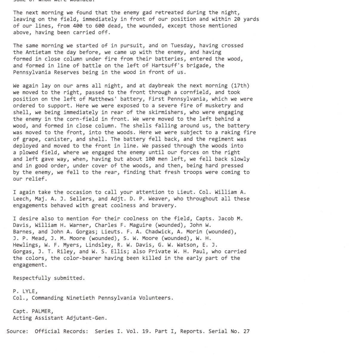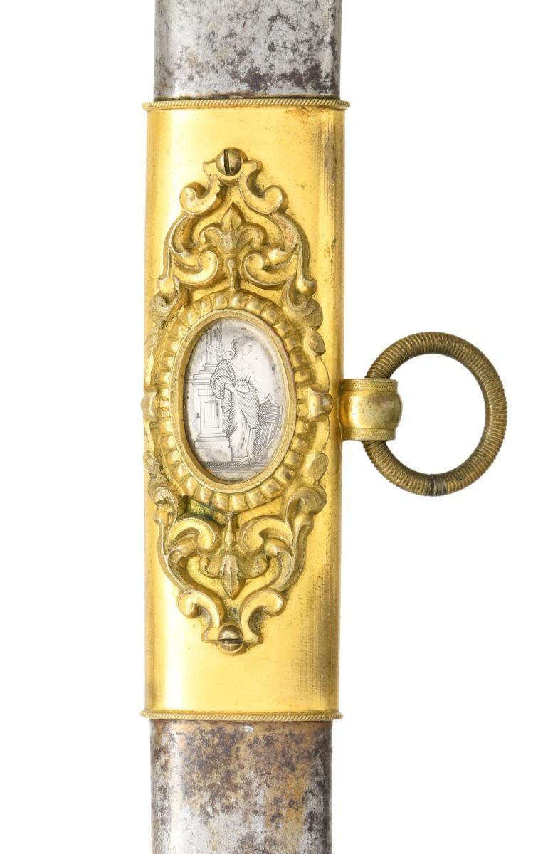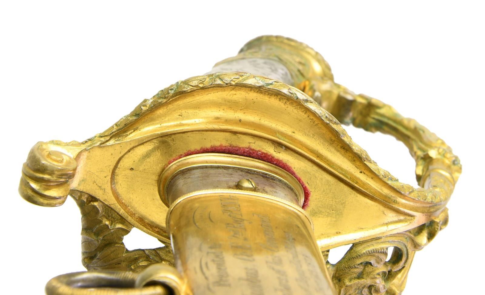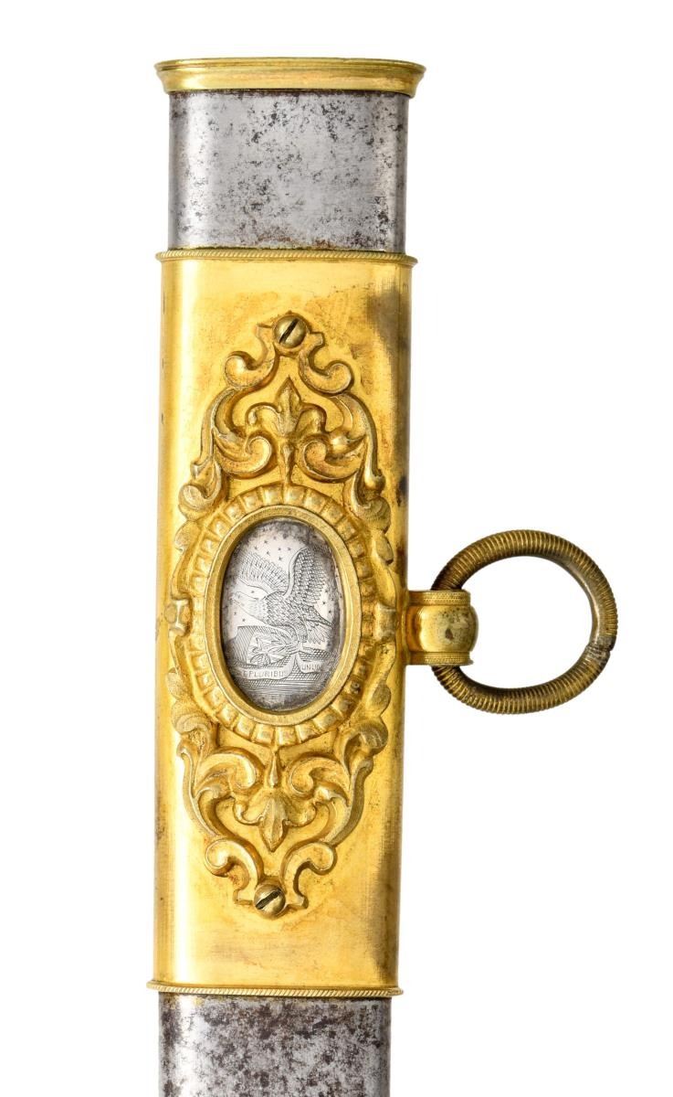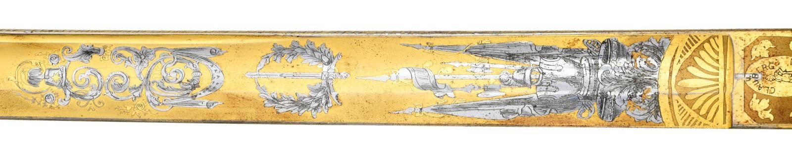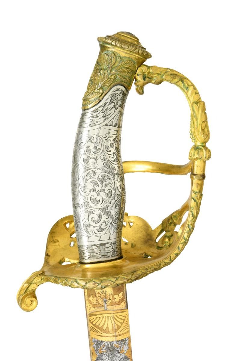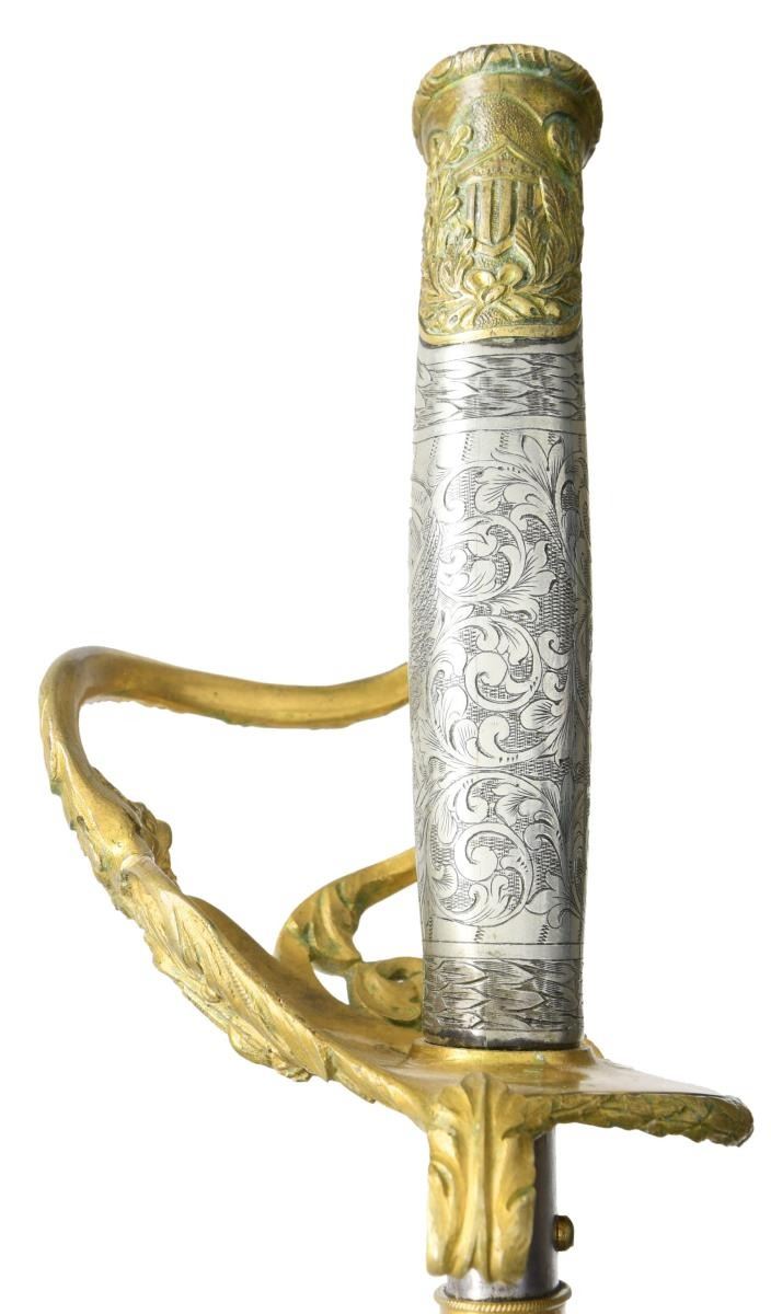 PRESENTATION SWORD BY HORSTMANN TO CAPTAIN JACOBUS. The sword's overall length is 40 1/4" with a stunning 33", gold embellished blade. The blade has a single wide fuller and a single narrow fuller near the spine. The first 19" of the blade are covered in gold with white etching. The etched motifs include stands of arms, an American eagle, a large "US", and various foliate motifs. The ricasso is etched "W.H. HORSTMANN & SONS PHILADELPHIA" on one side. The other side is stamped "CLAUBERG (knight) SOLINGEN". The exuberant heavily gilded brass Civil War style hilt features a semi-basket guard with well-articulated acanthus & laurel leaves surrounding a spread-wing American eagle with shield on chest. The single branch terminates at the guard with a sea monster's head. The tail is wrapped with a vine and extends to the mid-point of the knuckle bow. The knuckle bow is highly adorned with a leaf motif. The pommel has an American shield on the front with deeply carved acanthus leaves. The silver grip is completely etched in a staggard leaf design with various flourishes surrounding a large engraved spread-wing American eagle under glory with a ribbon that reads "E PLURIBUS UNUM". The red wool pad is still present at the base of the ricasso. The gilded brass mounted iron scabbard has 3 heavily gilded mounts. Each mount has a 1 1/2" engraved silver oval embellishment. The top oval pictures and eagle on shield, the middle mount oval features a Greek goddess, and the silver panel at the drag mount appears to depict Columbus. The rear of the top mount is engraved "Presented to Capt P H Jacobus, Co E 2nd Regt P.S.N.G. by the members of his command. As a token of Regard and Esteem. DECER 10th 1872". Captain Peter Henry Jacobus served honorably in the Pennsylvania National Guard from 1857 through 1895, a total of 38 years. He first enlisted for 3 months in Company E of the 19th Pennsylvania Volunteers as a First Sergeant, and subsequently moved to the 90th Pennsylvania as a Captain. On August 30th of 1862 he was wounded in his right leg at the 2nd battle of Bull Run. Because of his wound, he was discharged in April of 1863. Jacobus joined the 2nd Regiment of the Pennsylvania National Guard in 1867 and remained Captain of the unit until his retirement. Captain Jacobus had the distinction of being the Senior Captain in the entire Pennsylvania National Guard. By profession, Jacobus was a die sinker and engraver credited with many well-known medals. Examples of his work are housed at Mount Vernon and the Yale University art gallery. UNATTACHED ACCESSORIES: information gathered on Captain Jacobus and his service to the state of Pennsylvania. A copy of a photograph of a young Captain Jacobus. CONDITION: the sword blade retains significant original factory polish, and the gold plating is bright & crisp. The hilt retains nearly all of its original gilded finish, and even the finest details remain sharp & well-defined. The grip is exquisitely etched likely by a master engraver. The scabbard mounts retain 90% of the original gilded finish. The presentation shows little wear and is quite legible. The iron body has a mottled gray-brown finish. (02-19868/BF). $4,500-7,000.