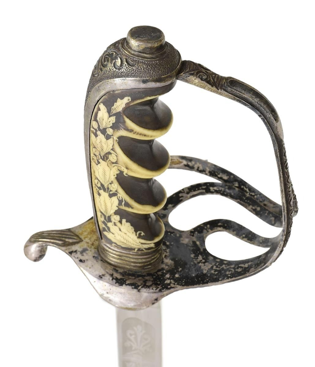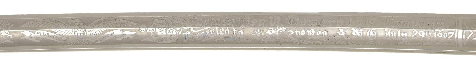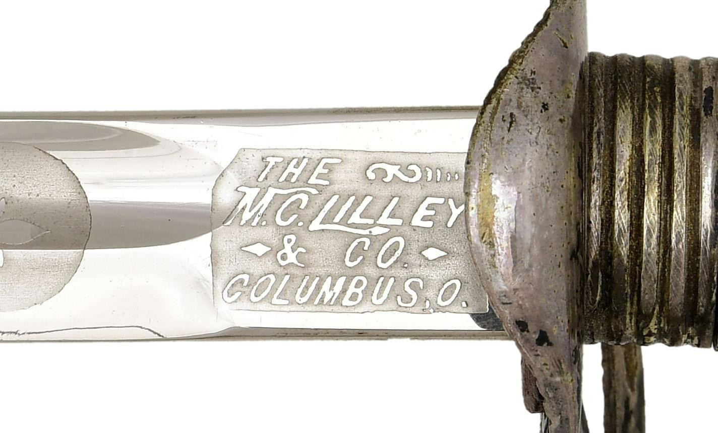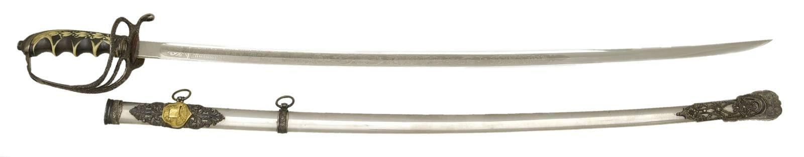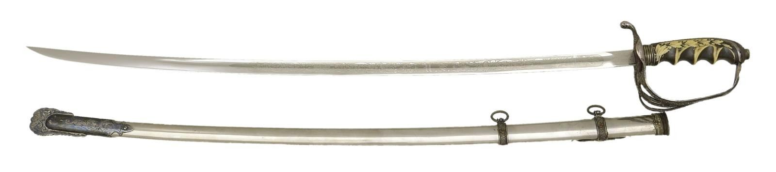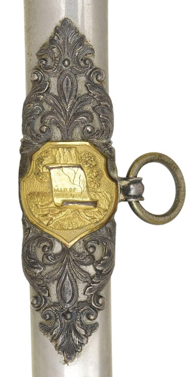 WITH ALABAMA CREST. Overall length: 37". Blade length: 30". Blade has a single medium fuller and is marked at the ricasso "THE M. C. LILLEY & CO. COLUMBUS, O.". The blade is etched over 18 1/2" of its length with various foliate motifs, patriotic motifs, and a large "US" on one side. The other side has patriotic & foliate motifs, including a large spread-wing American eagle and a 7" panel that reads "Presented to Captain Ben R. Howard by "C." Company, 2nd Reg, A.N.G. July, 29th 1907". Captain Howard was an officer in the Alabama National Guard. Silver plated hilt with superbly engraved guard, knuckle bow, and backstrap, featuring various geometric & foliate motifs. The grip is an off-white composite material with a darkened background highlighting a spray oak leaves & acorns up one side with the other side having a spray of acanthus leaves & berries. The plated scabbard has heavily silvered mounts with an elaborate top mount bearing a gold-plated arm of the state of Alabama. The drag has elaborate engraved & chased foliate engraving. An exceptionally attractive presentation sword of the pre-WWI decade. CONDITION: blade shows original factory polish. Hilt shows light wear with tarnish to the silvered areas. Scabbard shows very light wear. (02-20186/BF). $1,500-2,500.
