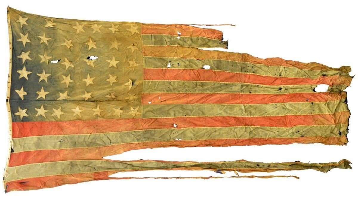 The 37-star American flag was authorized in 1867 when Nebraska joined the Union as the 37th state. It was regulation until 1876 when the state of Colorado became the 38th state. This flag measures approximately 48" x 96", and the canton measures 29" x 34". The canton has 5 rows of 6 stars and a 6th row with 7 stars. The stars are sewn in a variety of manners, but most are point-sewn. Others have tack stitches in the center, while still others are partially cross-sewn. The star, canton, and red stripes appear to be cotton; however, the white stripes and the hoist appear to be wool bunting. Consignor history states that the flag flew at Fort Halifax in Winslow, Maine. The flag was discovered in the attic of the old Post Office building by Francis Cassidy. SUPPORTING DOCUMENTS: a handwritten letter from the son of the man who discovered in the flag in the old Post Office attic. CONDITION: the flag is in poor condition with losses and staining throughout. The end of the flag is quite tattered, and the hoist shows rust stains from being tacked to a wall or pole. The bottom 2 stripes are nearly detached. (02-19647/BF). $300-500.