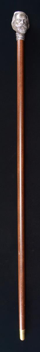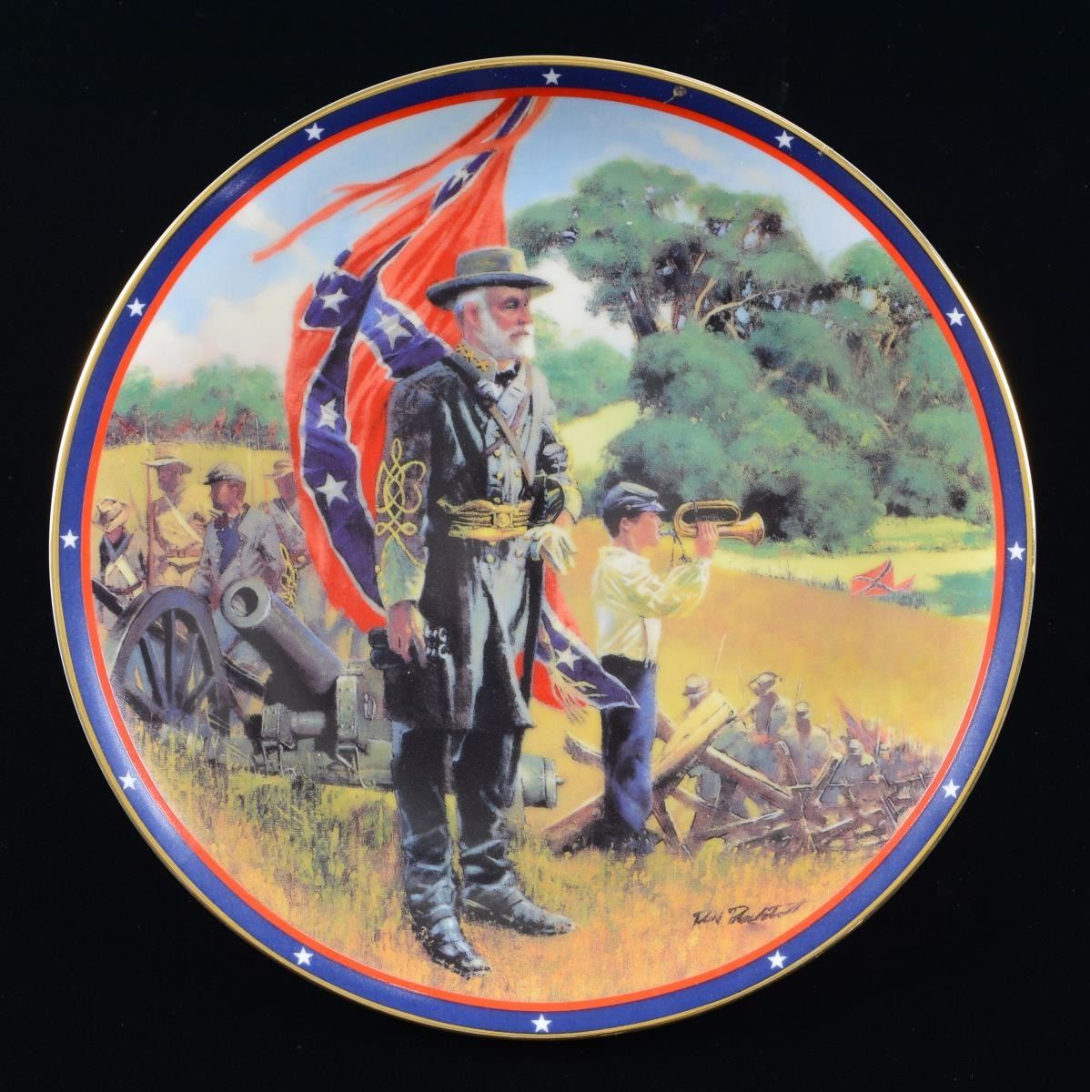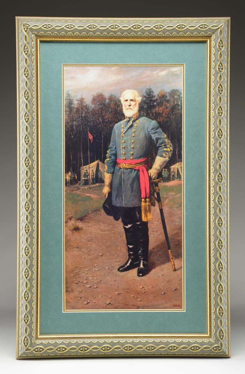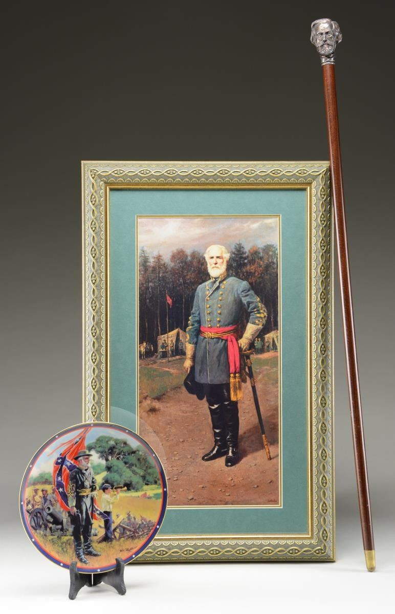 1) CANE. A modern cane measuring 36 1/2" in length with a brass tip, hardwood shaft, and silver plated bust of Robert E. Lee as the pommel. CONDITION: cane shows light wear overall. 2) PRINT. A modern print of a full-standing Robert E. Lee in uniform. Sight size of the print is 19 1/2" x 9 3/4". Frame size is 27" x 17 1/4". The polychromatic print depicts Lee in full-dress uniform, leaning on his sword in front of a Confederate camp with officers in the background. CONDITION: very light wear. 3) PLATE. A modern collector's plate measuring 9 1/4" in diameter depicting General Lee standing in front of the bugler, cannon, and various confederate troops. The back of the plate is titled "General Robert E. Lee from the American Civil War Plate Collection". CONDITION: no notable wear. (02-19764/BF). $100-150.