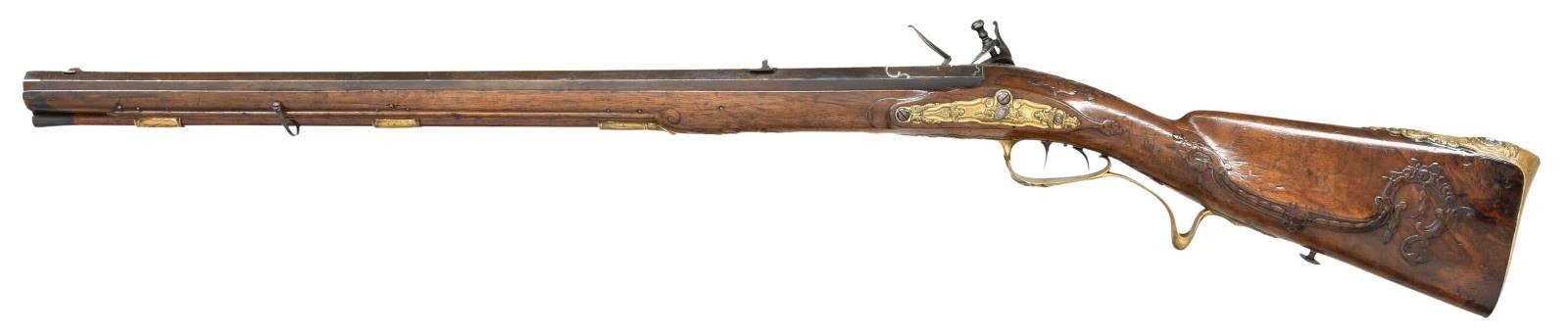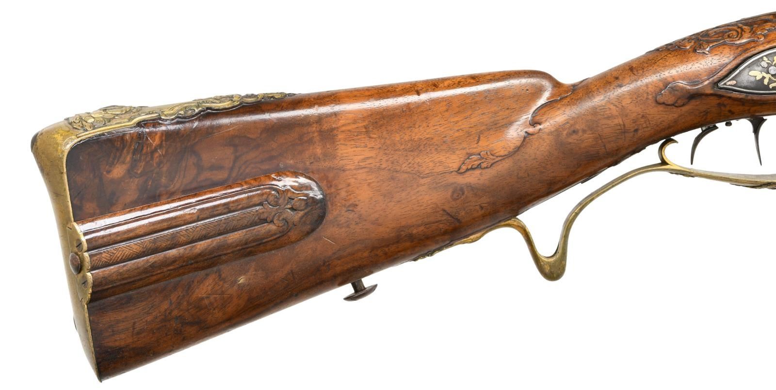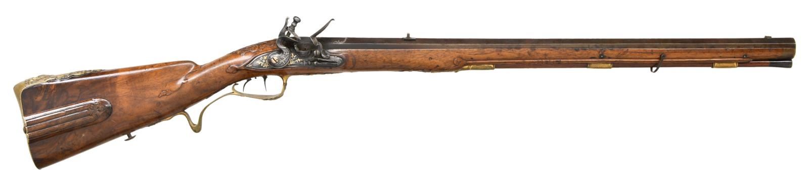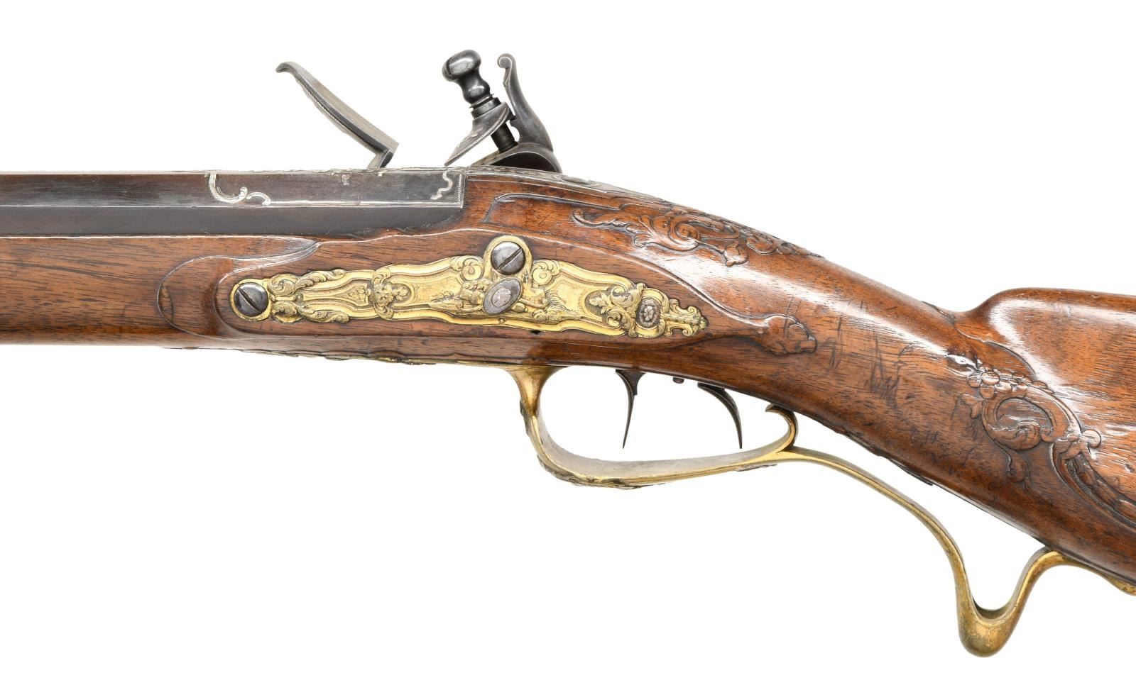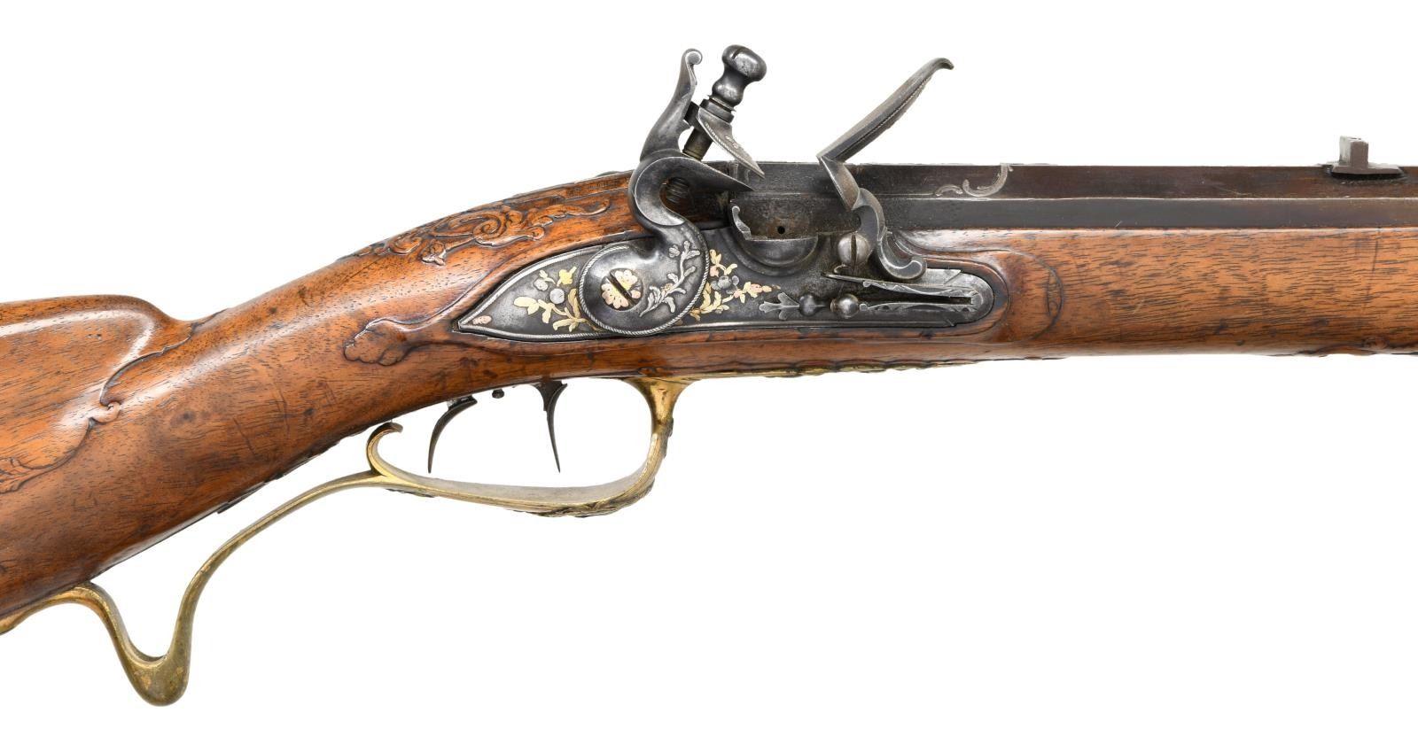 INLAID FLINTLOCK JAEGER RIFLE. Cal. 60 (7 groove rifling). S# NSN. This high quality Germanic rifle is not maker marked. It has 28" swamped octagon barrel Fitted with one standing rear and silver blade front sights. Three inches of breech area and breech plug tang are relief silver inlaid with ribbons and leaves. Leaf stems and vines are inlaid in gold. Lock with slightly arched and rounded plate has serpentine cock, inset rounded pan and unbridled friction frizzen. File decorated feather spring has large bulbous finial with fleur-de-lis tip. Lockplate has raised silver inlaid border and fields are red and yellow relief gold inlaid in floral motif. Matching silver inlay with some gold accents extends to face of cock, top jaw and frizzen. Stock of somewhat marbled European walnut extends to muzzle with horn tip and has raised scroll carvings around barrel tang and as accent for right hand cheekpiece. There are decorative mouldings surrounding lock, sideplate, buttplate tang and thimble. A patchbox with sliding wood cover is on right side of butt. Furniture is of heavy cast gilded brass with relief embellishments of scrolls, arms and other elements accented by relief silver inlays depicting human busts on shields, which are found on tang of buttplate and trigger guard bow. Other floral accents are found at tip of buttplate tang, front of trigger guard finial and rear of sideplate. All work is exceptionally well done and the whole composition exudes opulence. Stock is pinned to barrel and a hickory ramrod with horn tip is held by two beaded pipes and matching thimble. CONDITION: very good to fine. Barrel retains an overall smooth brown patina with a light overlay of varnish. This varnish also appears to have been applied to the stock over a good number of marks, scratches and dings. Fittings retain most of their gilded finish. Bore although dusty appears to be bright and shiny. Lock is good. Set triggers work. An eye catching Jaeger rifle. (01-21984/MGM). ANTIQUE. $3,000-5,000.