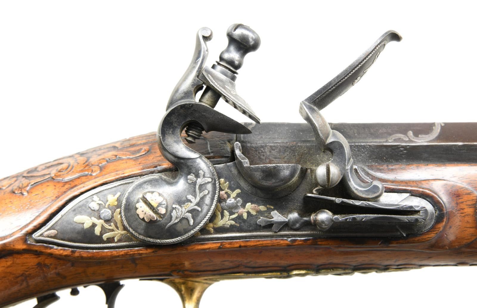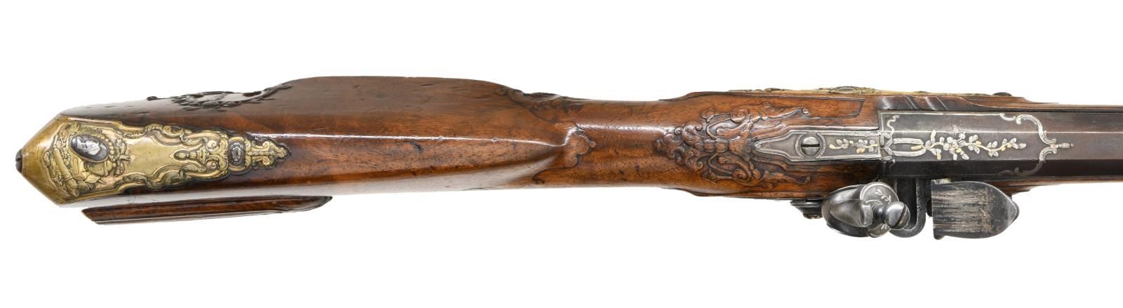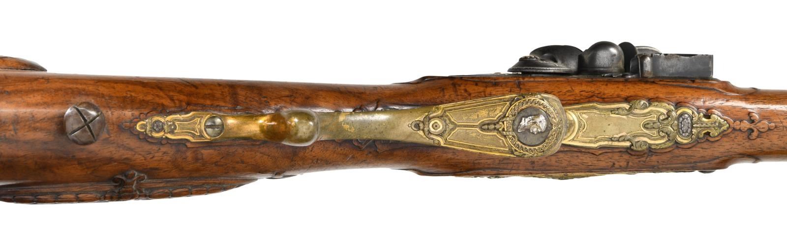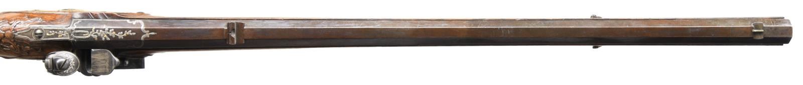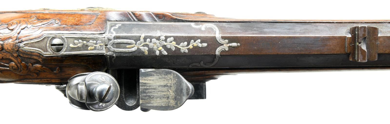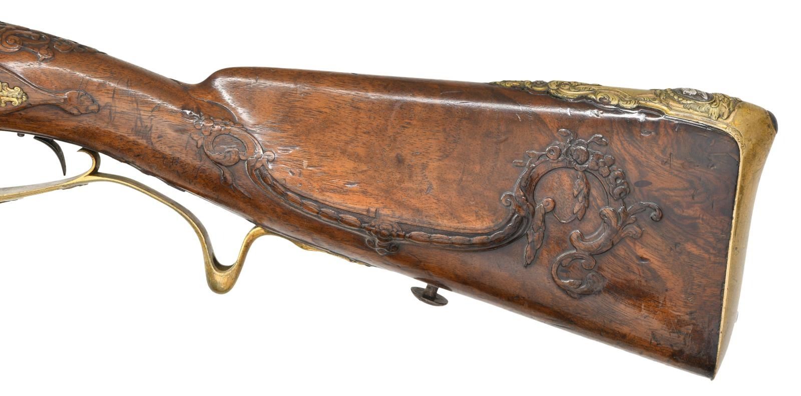 INLAID FLINTLOCK JAEGER RIFLE. Cal. 60 (7 groove rifling). S# NSN. This high quality Germanic rifle is not maker marked. It has 28" swamped octagon barrel Fitted with one standing rear and silver blade front sights. Three inches of breech area and breech plug tang are relief silver inlaid with ribbons and leaves. Leaf stems and vines are inlaid in gold. Lock with slightly arched and rounded plate has serpentine cock, inset rounded pan and unbridled friction frizzen. File decorated feather spring has large bulbous finial with fleur-de-lis tip. Lockplate has raised silver inlaid border and fields are red and yellow relief gold inlaid in floral motif. Matching silver inlay with some gold accents extends to face of cock, top jaw and frizzen. Stock of somewhat marbled European walnut extends to muzzle with horn tip and has raised scroll carvings around barrel tang and as accent for right hand cheekpiece. There are decorative mouldings surrounding lock, sideplate, buttplate tang and thimble. A patchbox with sliding wood cover is on right side of butt. Furniture is of heavy cast gilded brass with relief embellishments of scrolls, arms and other elements accented by relief silver inlays depicting human busts on shields, which are found on tang of buttplate and trigger guard bow. Other floral accents are found at tip of buttplate tang, front of trigger guard finial and rear of sideplate. All work is exceptionally well done and the whole composition exudes opulence. Stock is pinned to barrel and a hickory ramrod with horn tip is held by two beaded pipes and matching thimble. CONDITION: very good to fine. Barrel retains an overall smooth brown patina with a light overlay of varnish. This varnish also appears to have been applied to the stock over a good number of marks, scratches and dings. Fittings retain most of their gilded finish. Bore although dusty appears to be bright and shiny. Lock is good. Set triggers work. An eye catching Jaeger rifle. (01-21984/MGM). ANTIQUE. $3,000-5,000.