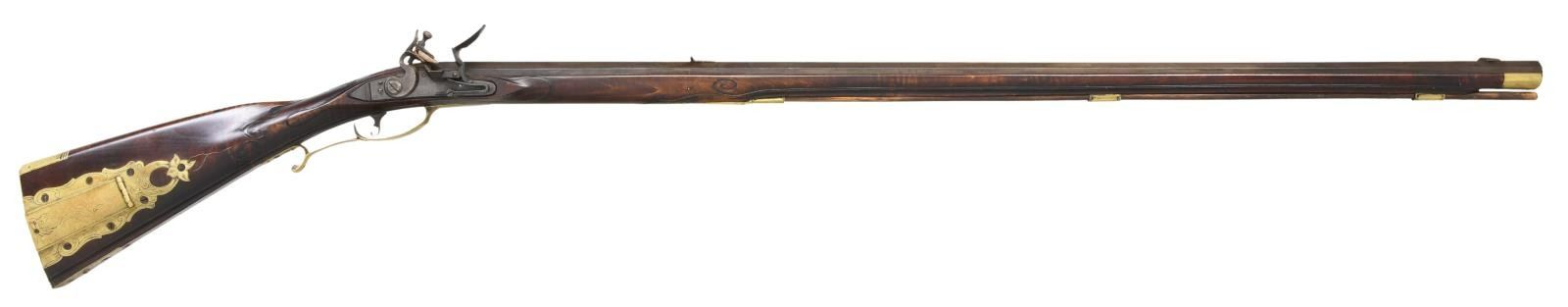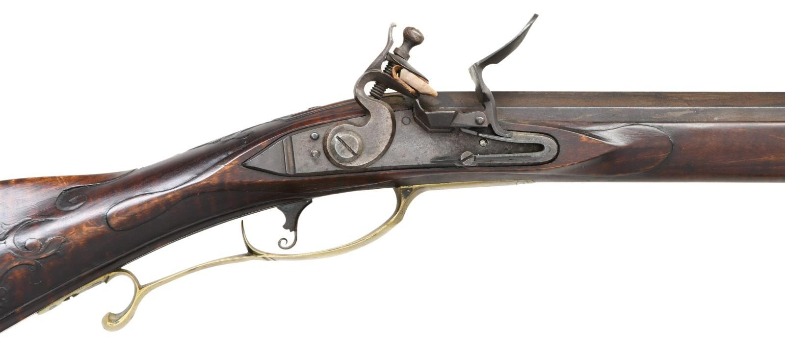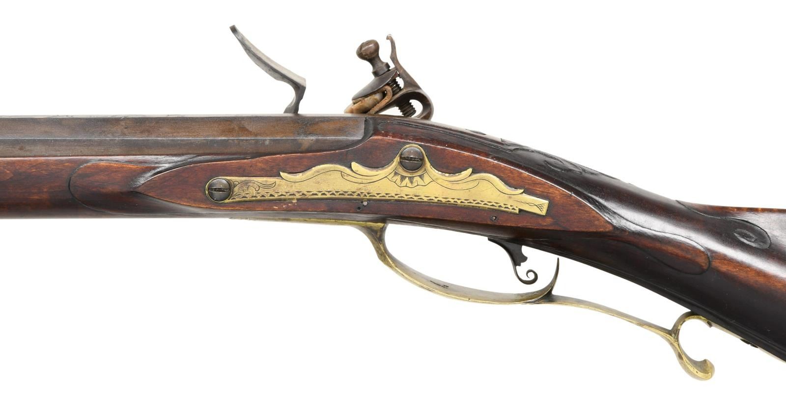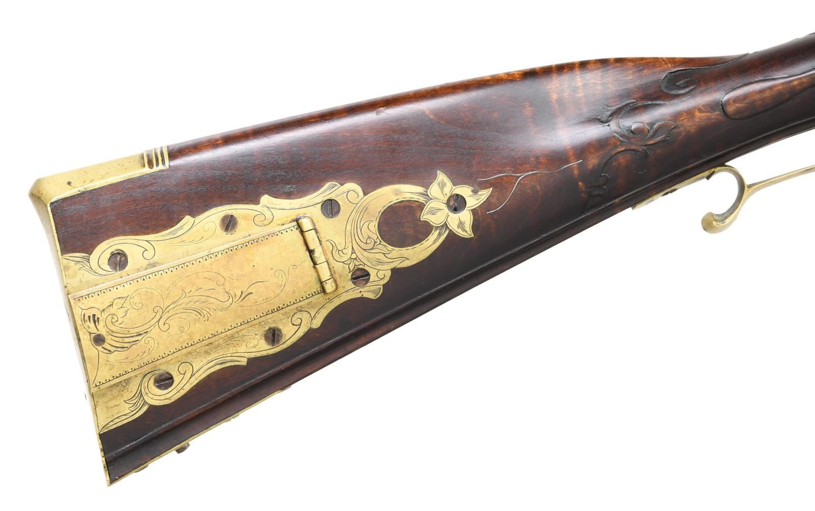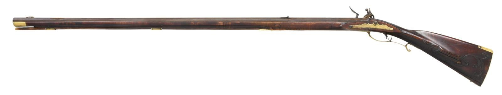 FLINTLOCK KENTUCKY RIFLE. Cal. 50. NSN. Bbl. 42 1/2" of double taper octagon. Top flat is engraved "W. GUSLER Williamsburg. Va". Wallace Gusler was the master gunsmith at Colonial Williamsburg producing fine handmade rifles under he retired in 2004. German silver blade front sight w/ fixed rear sight, sight base is engraved 1969. Plain unmarked lock. Curled plain trigger. Full length pin fastened cheekpiece maple stock. Right side has a rectangular lid pierced & engraved daisy finial brass patchbox. Brass finger curled trigger guard. Wide brass buttplate & toe plate w/ floral engraving. Engraved brass side plate. Cheekpiece has a molded edge that is bordered by vine type relief floral carving. Vine type relief carving is also found around top tang & thimble. Lower edge of stock & ramrod channel have molded borders w/ highlights of incise carving. Hardwood ramrod is held by a brass thimble & 2 faceted brass pipes. WEIGHT: 8 lbs, 15.6 oz. CONDITION: bbl. & lock retain over 90% brown finish showing slight edge wear w/ scattered spotting. Brass fittings have acquired a mild patina. Stock has very good finish showing small marks. Bore retains sharp rifling. (01-21955/DS). ANTIQUE. $4500-6500.