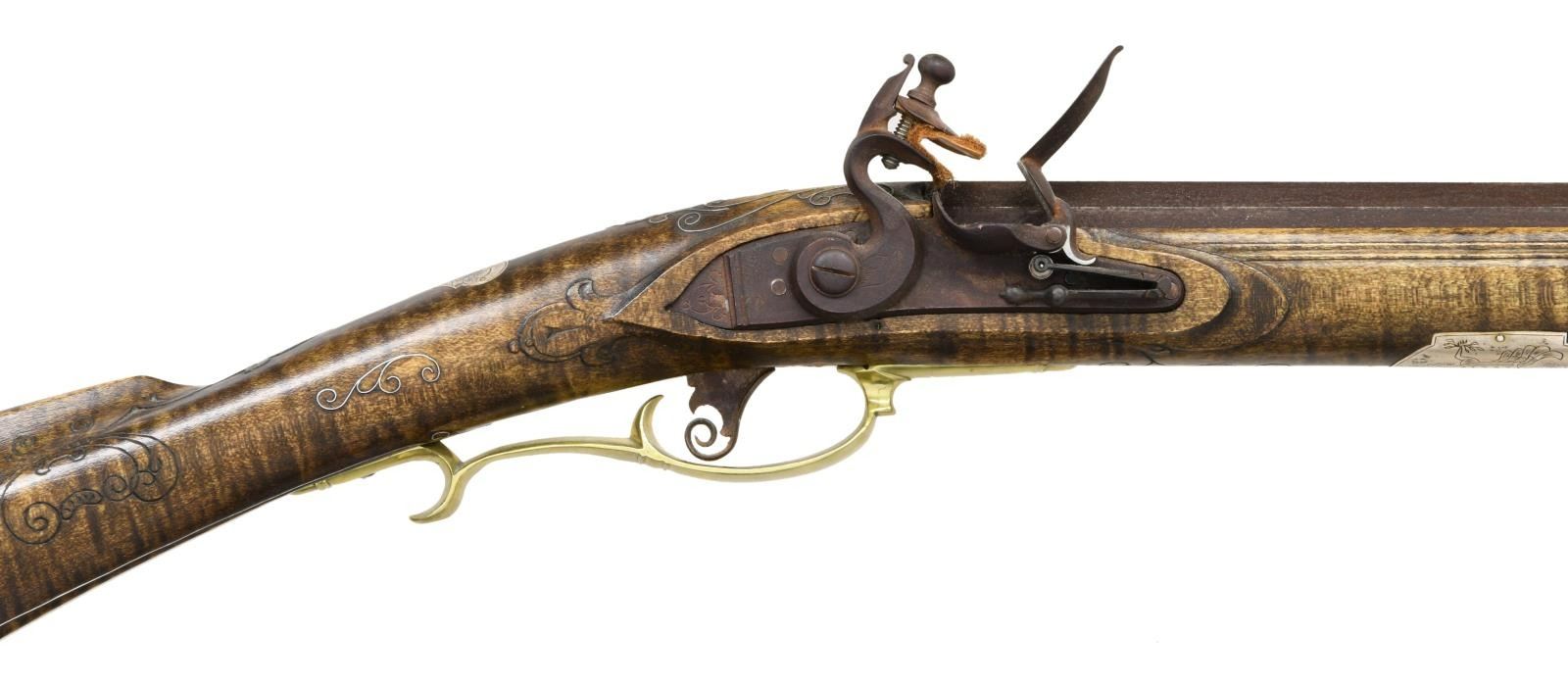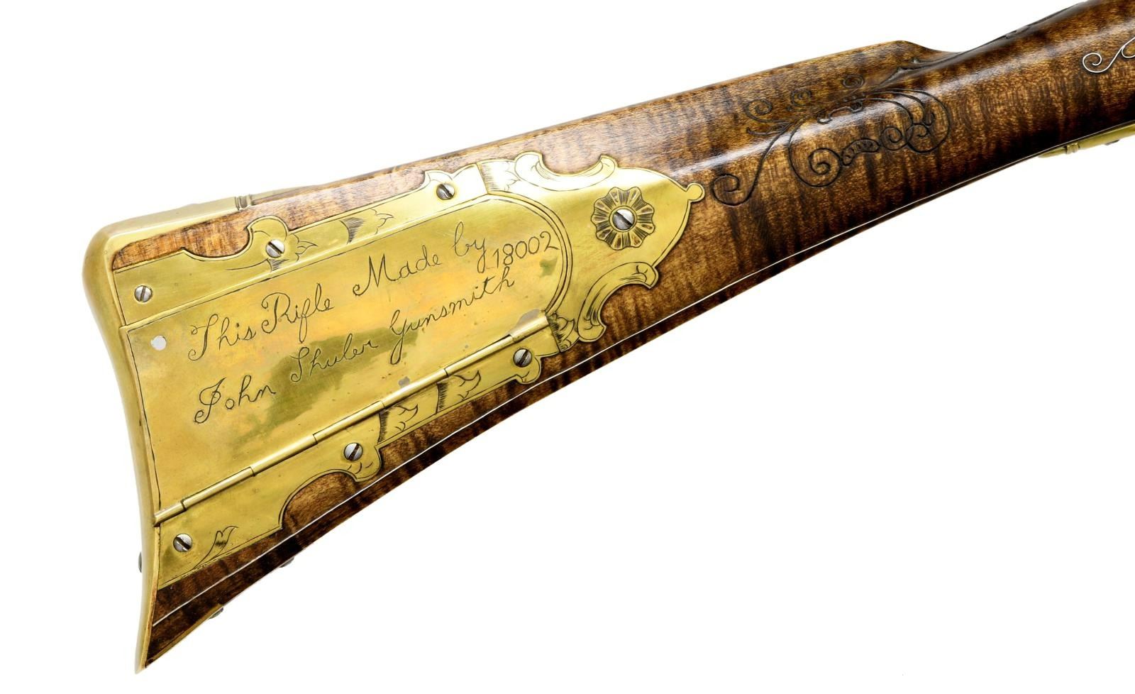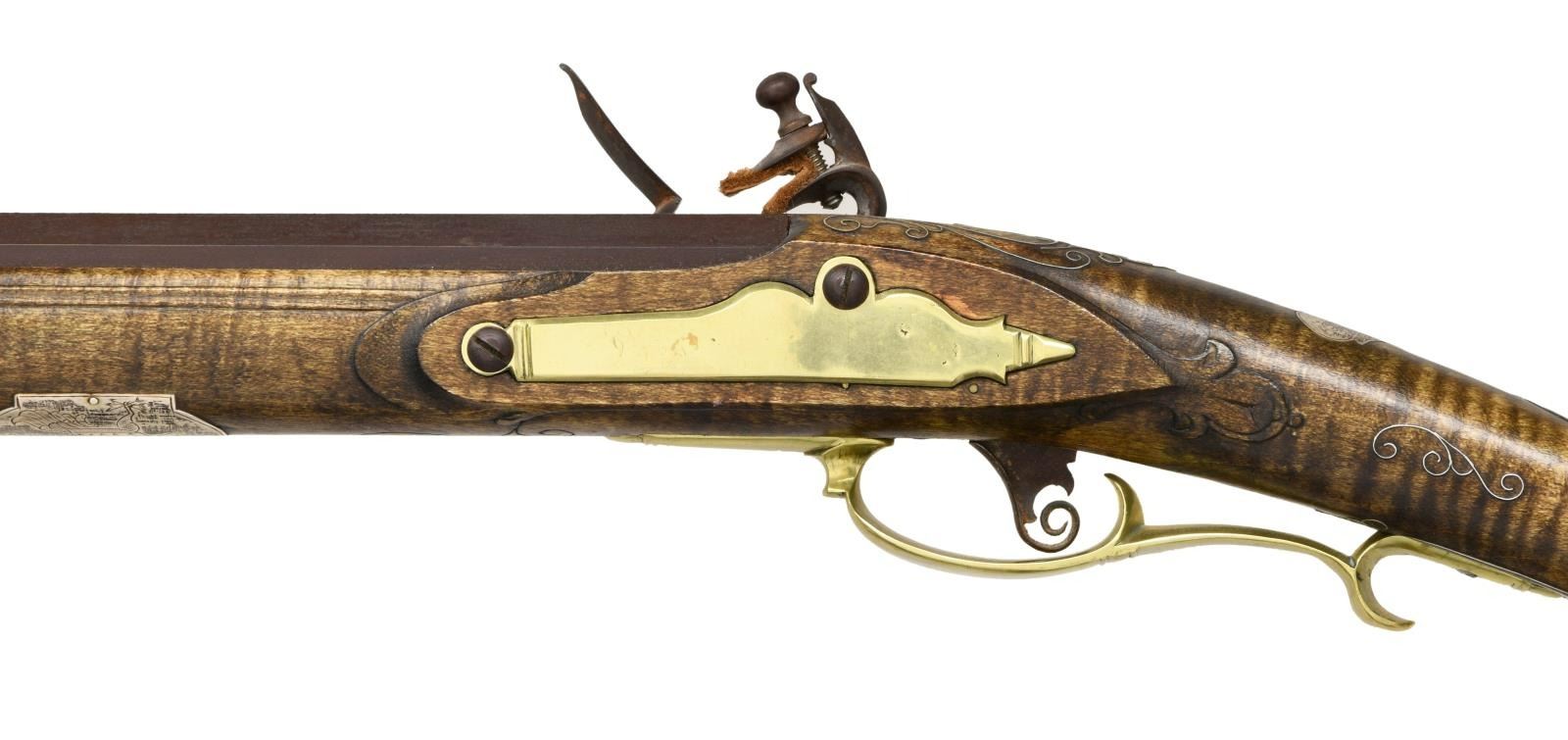 RIFLE IN THE MANNER OF JOHN SCHULER. Cal. 50. S# NSN. The 48" slightly swamped octagon barrel has "1 W. Watson 1" (made 2011) engraved on top flat. Lock with chamfered plate having rebated tail has serpentine cock, rounded integral pan, bridled roller frizzen and feather spring with bulbous finial. Stock of curly grain hard maple extends to muzzle and attaches to barrel with four steel sidebolts through ovate silver escutheons. Stock has mouldings around lock and chamfered sideplate as well as ramrod channel and rear of barrel channel. There is semi-relief carving of scrolls around classic cheekpiece, scrolled silver wire inlay is around barrel tang and with flourishes on left side of butt and with accent wire along toeline. Brass mounts include heavy wide buttplate, fairly simple patchbox with cover hinged at bottom which is engraved "This Rifle Made By" "John Schuler Gunsmith" "18002". Release is well hidden; not found by this cataloger. Trigger guard has spur at grip. Silver mounts include: 8 pointed star with compass rose at center on cheekpiece, heart shaped crest plate and hand wear plate at pivot point engraved with an eagle. Hickory ramrod mounts through two beaded octagonal pipes and matching thimble with long broad finial. CONDITION: very fine. Appears unfired although there are some flint strikes on frizzen. (01-23929/MGM). ANTIQUE. $3,000-5,000.