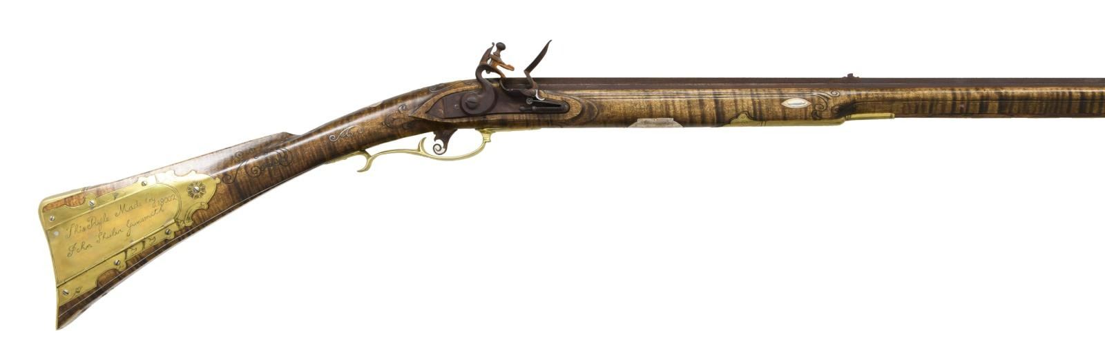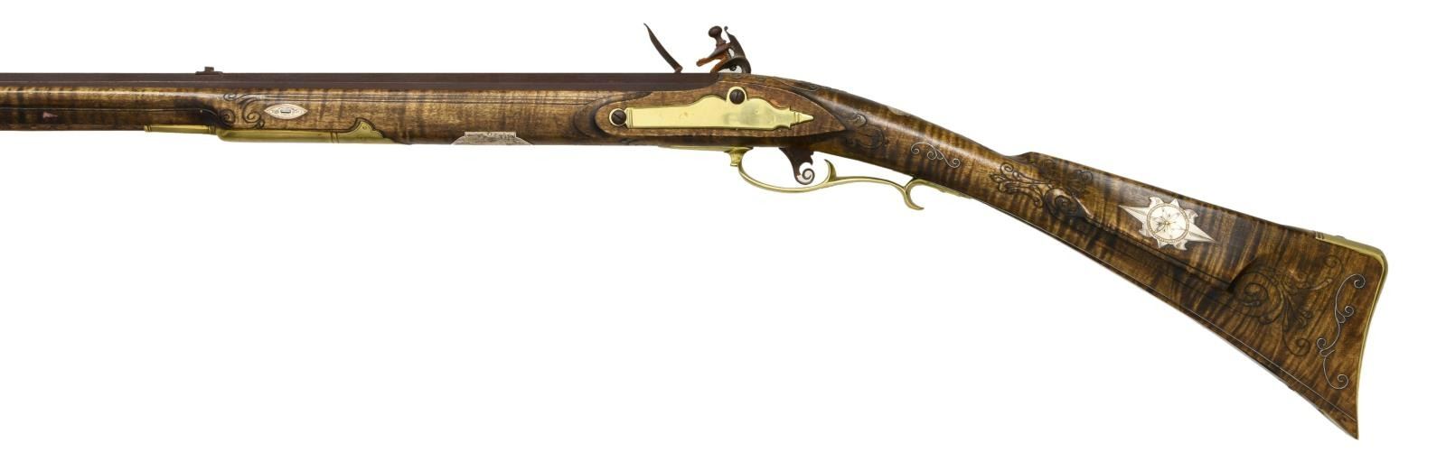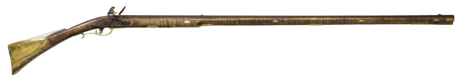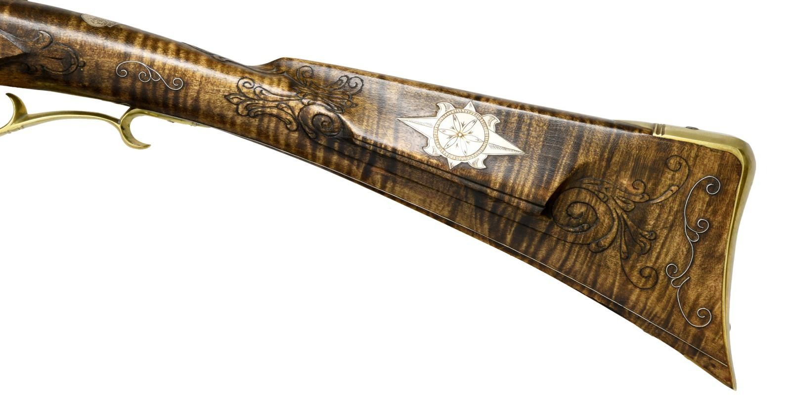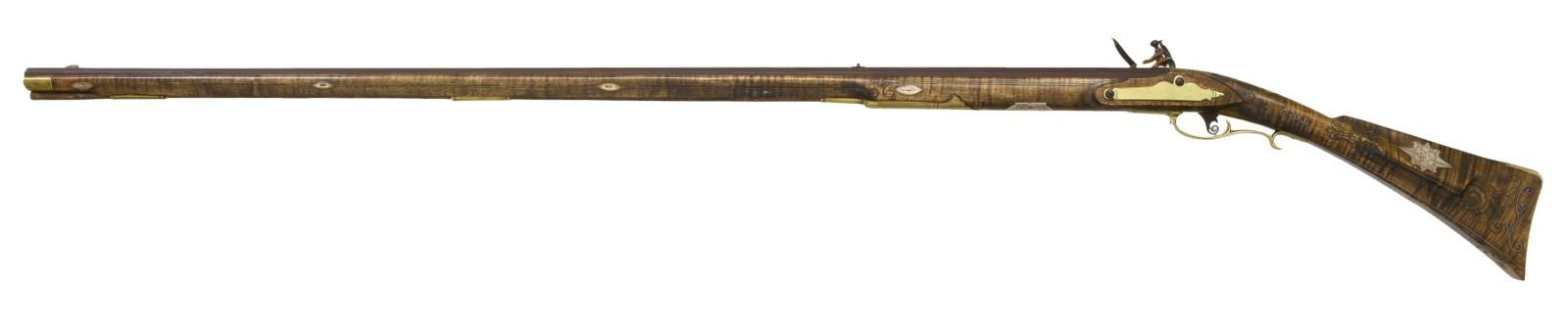RIFLE IN THE MANNER OF JOHN SCHULER. Cal. 50. S# NSN. The 48" slightly swamped octagon barrel has "1 W. Watson 1" (made 2011) engraved on top flat. Lock with chamfered plate having rebated tail has serpentine cock, rounded integral pan, bridled roller frizzen and feather spring with bulbous finial. Stock of curly grain hard maple extends to muzzle and attaches to barrel with four steel sidebolts through ovate silver escutheons. Stock has mouldings around lock and chamfered sideplate as well as ramrod channel and rear of barrel channel. There is semi-relief carving of scrolls around classic cheekpiece, scrolled silver wire inlay is around barrel tang and with flourishes on left side of butt and with accent wire along toeline. Brass mounts include heavy wide buttplate, fairly simple patchbox with cover hinged at bottom which is engraved "This Rifle Made By" "John Schuler Gunsmith" "18002". Release is well hidden; not found by this cataloger. Trigger guard has spur at grip. Silver mounts include: 8 pointed star with compass rose at center on cheekpiece, heart shaped crest plate and hand wear plate at pivot point engraved with an eagle. Hickory ramrod mounts through two beaded octagonal pipes and matching thimble with long broad finial. CONDITION: very fine. Appears unfired although there are some flint strikes on frizzen. (01-23929/MGM). ANTIQUE. $3,000-5,000.