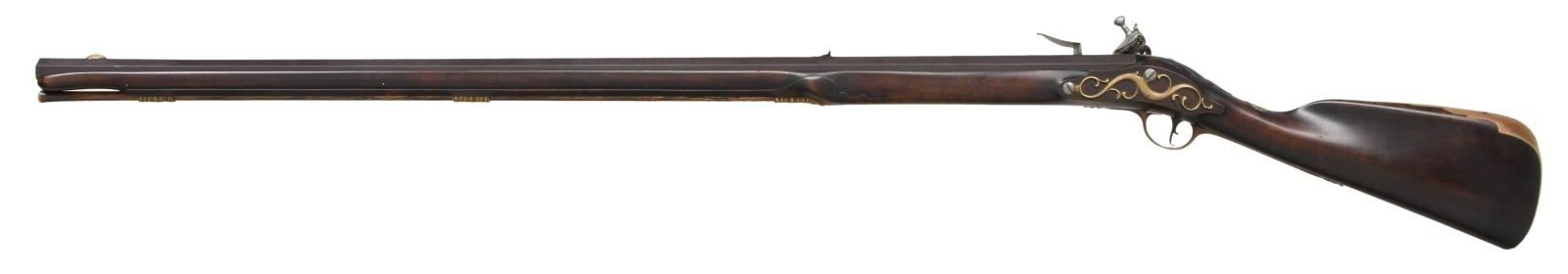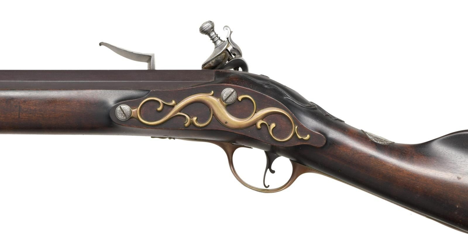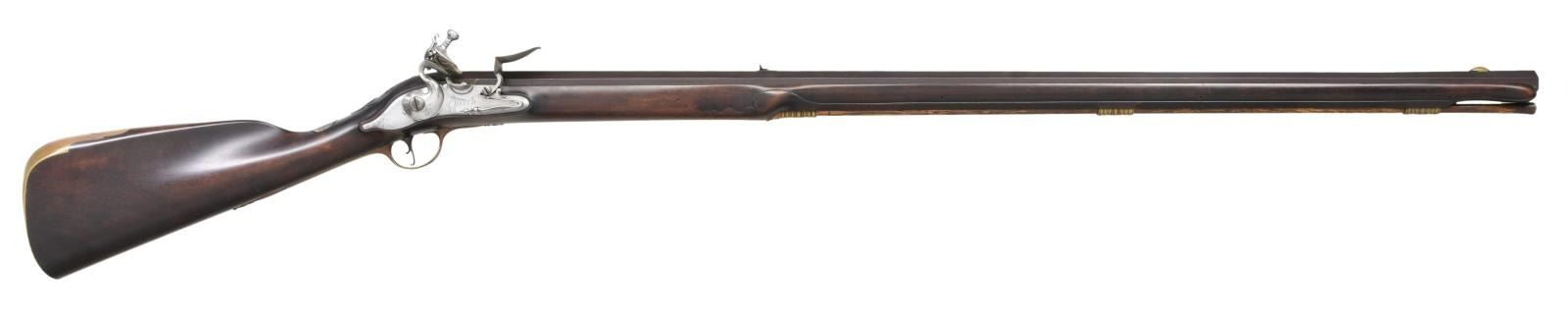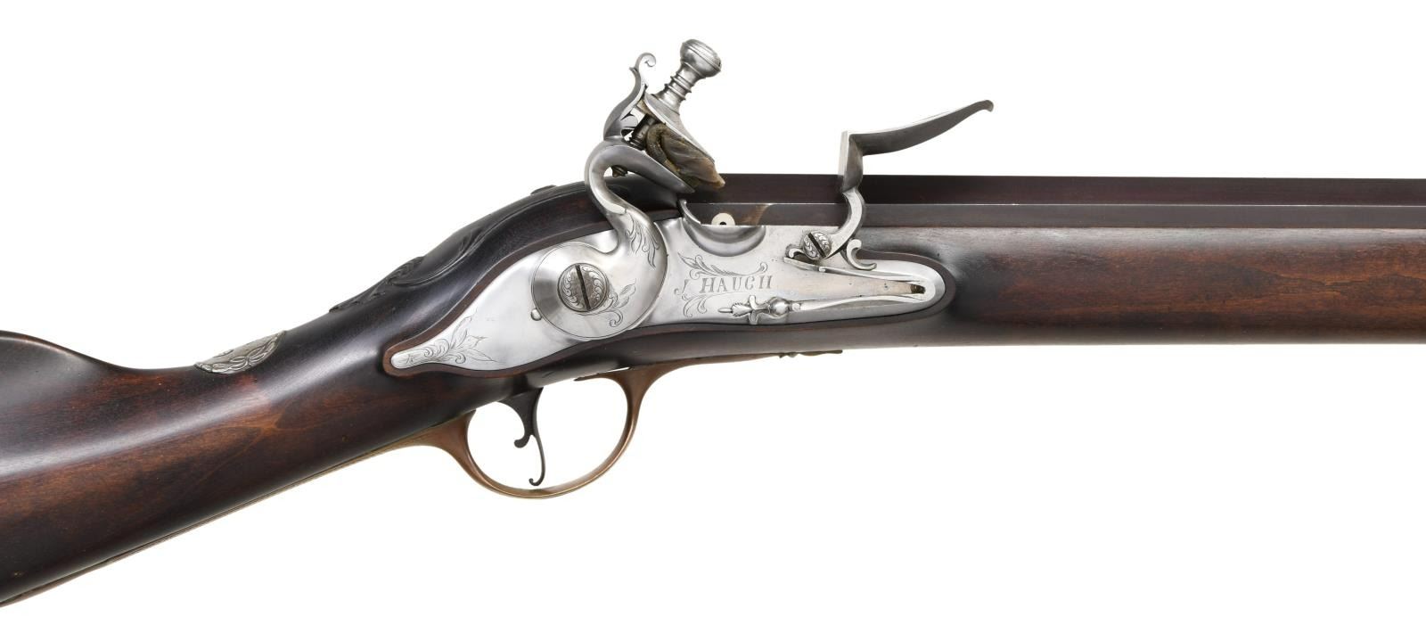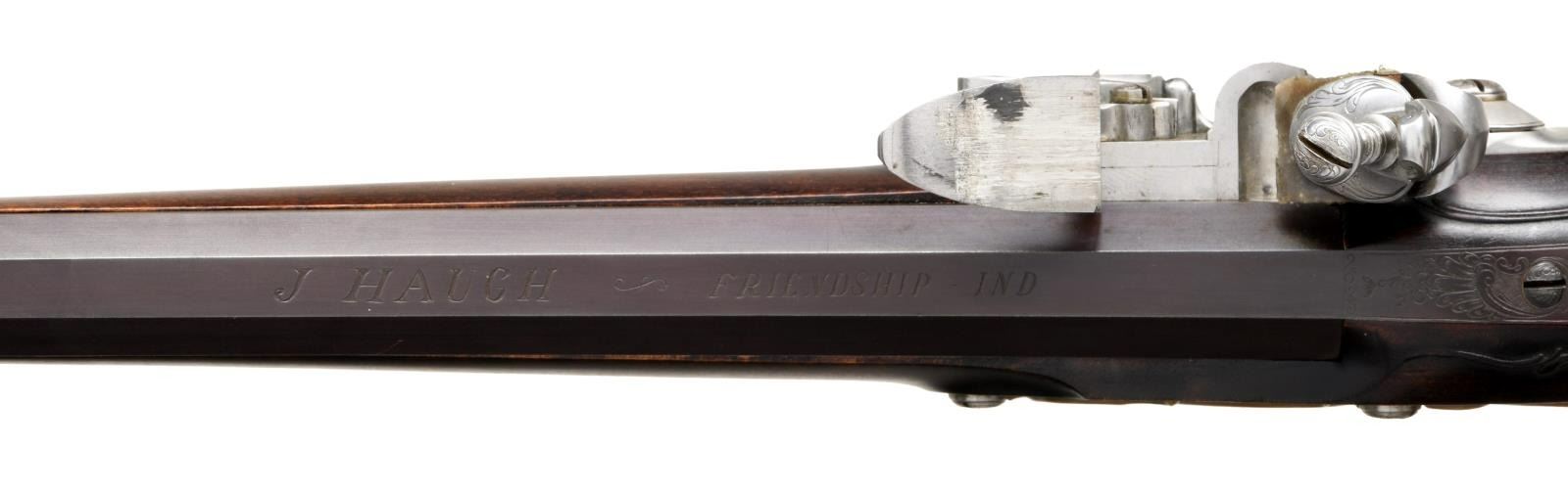 RIFLE. Cal. 62. NSN. Bbl. 39" of double taper octagon. Top flat is marked "J. HAUGH FRIENDSHIP-IND". Jack Theodore Haugh of Milan, Indiana is widely renowned as an outstanding builder & restorer. Early in his career, he focused on European fowler, Jeager & English rifles. His trademark is his excellent hand-forged flintlocks. German silver blade front sight w/ fixed V notch rear sight. Curved lock plate & hammer are finished in the white & have simple floral engraving w/ the builder's name "J. HAUGH". Top tang has complimenting floral engraving. Plain trigger. Pin fastened full length heavy maple stock w/ wide butt. Wide brass buttplate w/ long peak & long tang trigger guard have floral hand engraving. Brass serpentine side plate. Wreath engraved German silver oval wrist plate w/ initials that may read "KM". Relief carving is found around the top tang. Incise carving is found around the wide bulge at the thimble w/ a mouldered border extending past the front pipe. Stock has a wide rounded nose. Horn tipped hardwood ramrod is held by a brass thimble & 2 pipes w/ deeply ringed surfaces. WEIGHT: 8 lbs, 11.8 oz. CONDITION: near excellent. Bbl. retains over 98% brown finish. Lock has very good white finish. Stock has very good finish showing scattered scratches & marks. Brass fittings are acquiring a pleasing mild patina. Bore retains sharp rifling. (01-21956/DS). ANTIQUE. $4500-6500.
