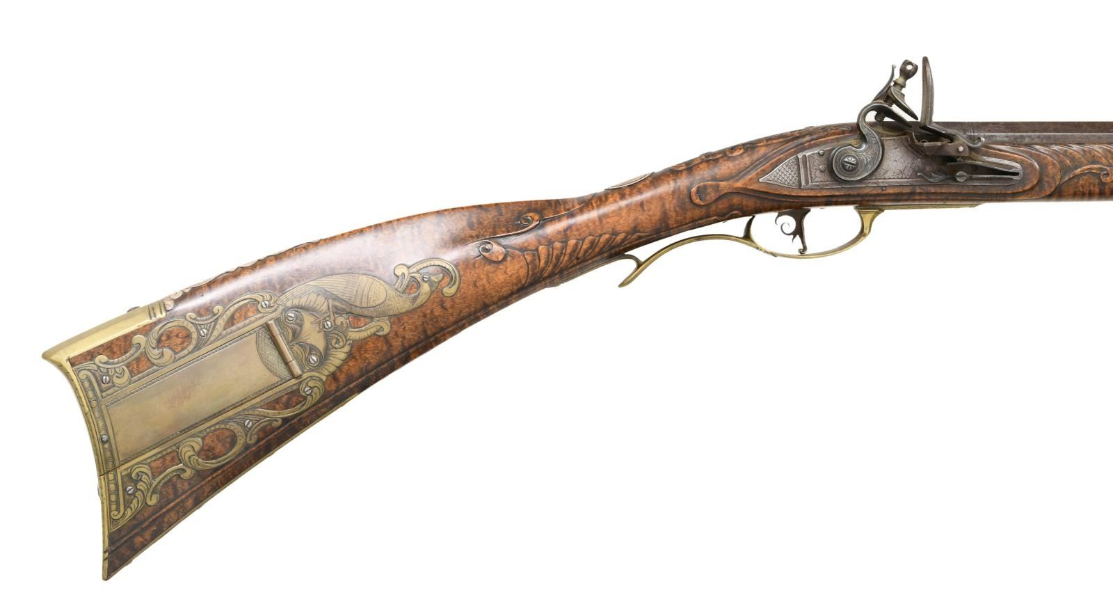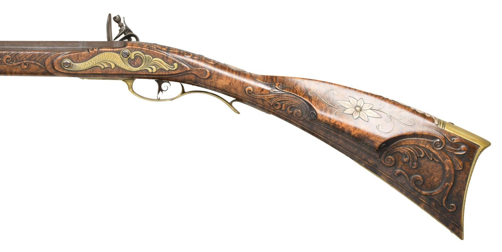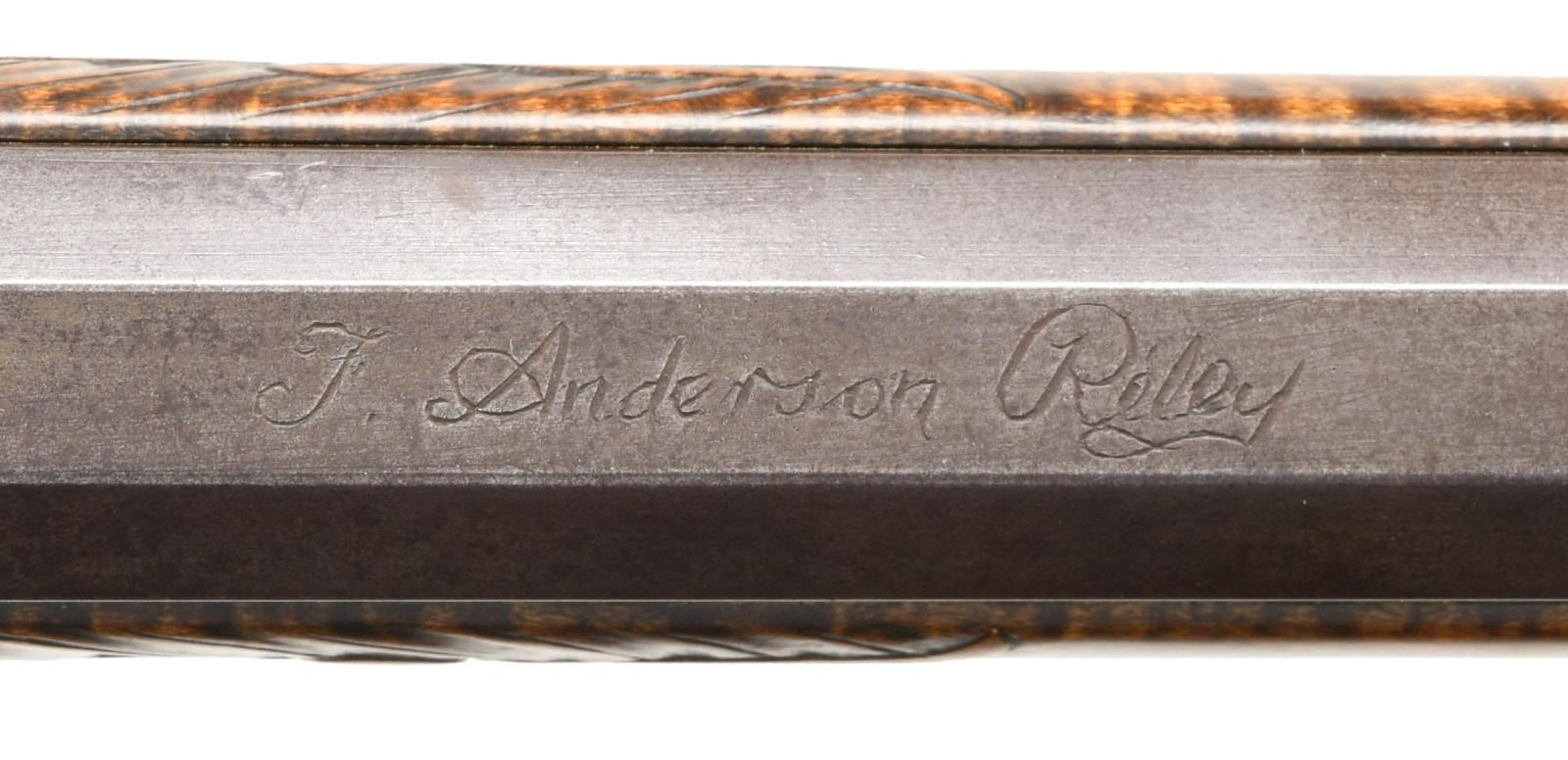 PENNSYLVANIA LONG RIFLE. Cal. 45. NSN. Bbl. 42" octagon measuring 13/16" across flats at muzzle. German silver blade rocky mountain front sight w/ fixed V notch rear sight. Top flat is engraved "F. Anderson Riley", a contemporary maker of fine flintlock rifles. Lock, hammer, top tang & breech end of bbl. are lightly engraved. Plain trigger w/ webbed rear design. Full length Roman nose cheekpiece stock of curly maple is held by 4 brass wedges. Rectangular lid, pierced segmented highly engraved patchbox w/ wild turkey finial. Wide brass buttplate w/ borderline engraving having long German silver vine type peak plate. Brass toe plate is heavily engraved w/ vine type finial. Brass finger curled trigger guard w/ borderline & geometric engraving. Engraved serpentine side plate. Oval German silver wedge escutcheons are floral engraved. Cheekpiece is adorned w/ an 8 point German silver flower having a brass center w/ flowing German silver wire inlays on each side. Oval German silver wrist plate. Stock has extensive relief carving on either side of molded cheekpiece around top tang, side plate, lock & thimble areas. Incise carved borders extend the full length of the forearm. Toeline has molded borders. Brass nose cap has borderline engraving. Horn tipped hardwood ramrod held by an engraved faceted thimble & 2 faceted brass pipes. WEIGHT: 8 lbs, 4 oz. CONDITION: bbl. & lock retain thinning brown finish showing spotted corrosion. Brass fittings have acquired a pleasing dark patina. Stock has very good finish showing a few small marks. Very good bore. (01-21952/DS). ANTIQUE. $5000-8000.