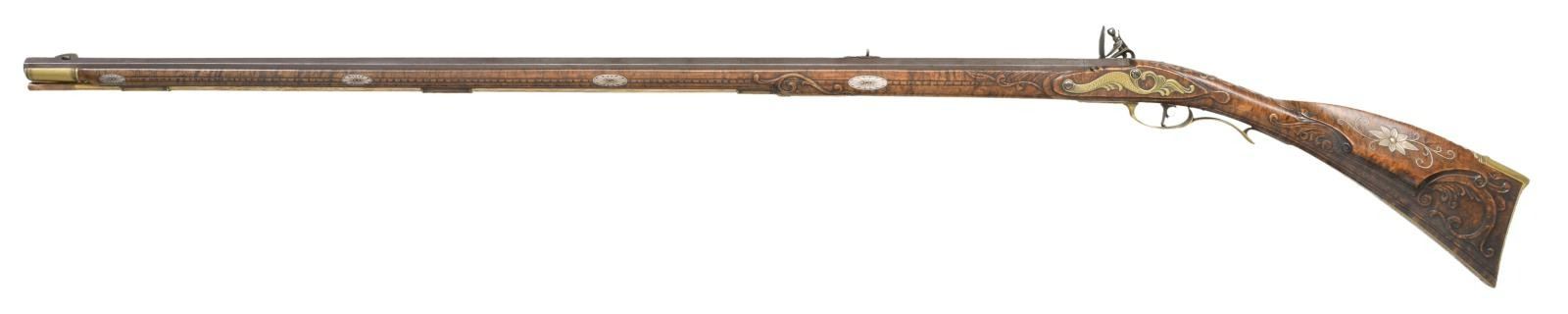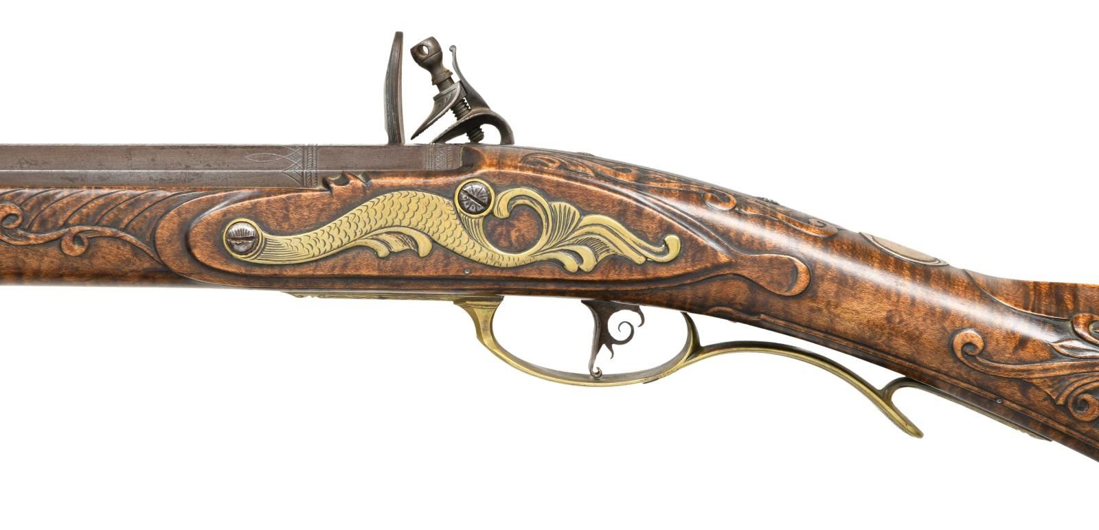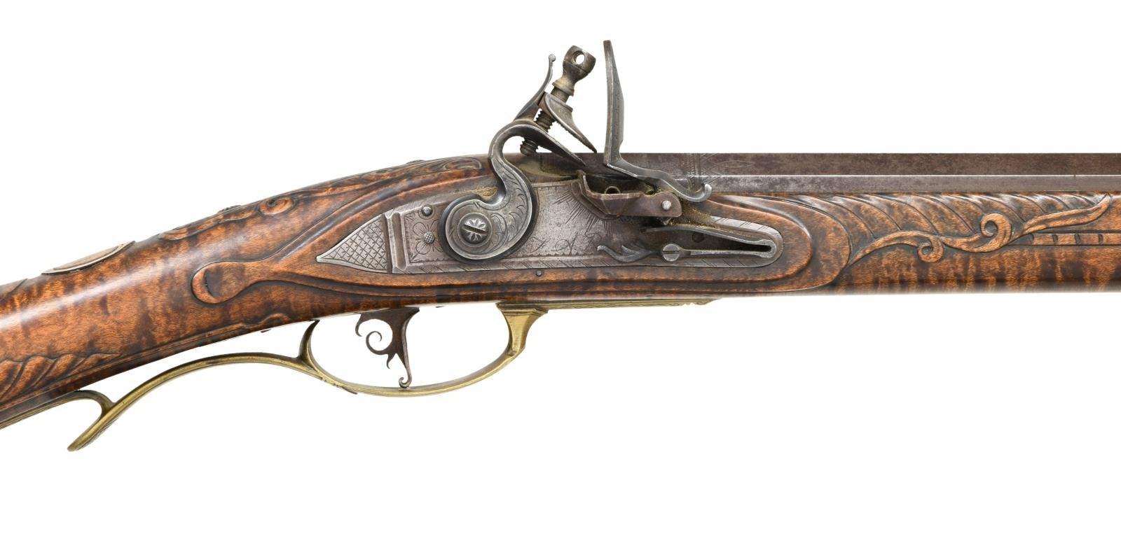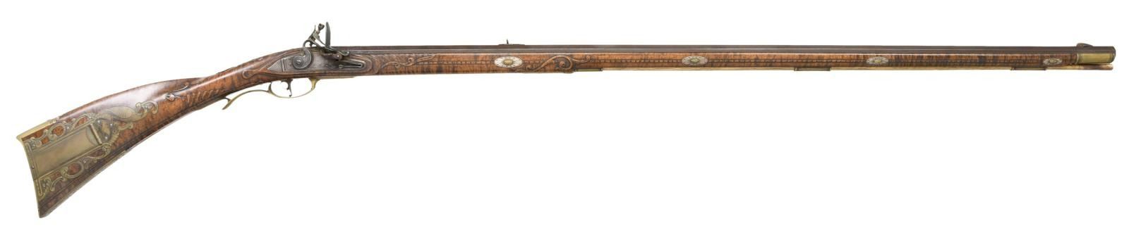 PENNSYLVANIA LONG RIFLE. Cal. 45. NSN. Bbl. 42" octagon measuring 13/16" across flats at muzzle. German silver blade rocky mountain front sight w/ fixed V notch rear sight. Top flat is engraved "F. Anderson Riley", a contemporary maker of fine flintlock rifles. Lock, hammer, top tang & breech end of bbl. are lightly engraved. Plain trigger w/ webbed rear design. Full length Roman nose cheekpiece stock of curly maple is held by 4 brass wedges. Rectangular lid, pierced segmented highly engraved patchbox w/ wild turkey finial. Wide brass buttplate w/ borderline engraving having long German silver vine type peak plate. Brass toe plate is heavily engraved w/ vine type finial. Brass finger curled trigger guard w/ borderline & geometric engraving. Engraved serpentine side plate. Oval German silver wedge escutcheons are floral engraved. Cheekpiece is adorned w/ an 8 point German silver flower having a brass center w/ flowing German silver wire inlays on each side. Oval German silver wrist plate. Stock has extensive relief carving on either side of molded cheekpiece around top tang, side plate, lock & thimble areas. Incise carved borders extend the full length of the forearm. Toeline has molded borders. Brass nose cap has borderline engraving. Horn tipped hardwood ramrod held by an engraved faceted thimble & 2 faceted brass pipes. WEIGHT: 8 lbs, 4 oz. CONDITION: bbl. & lock retain thinning brown finish showing spotted corrosion. Brass fittings have acquired a pleasing dark patina. Stock has very good finish showing a few small marks. Very good bore. (01-21952/DS). ANTIQUE. $5000-8000.