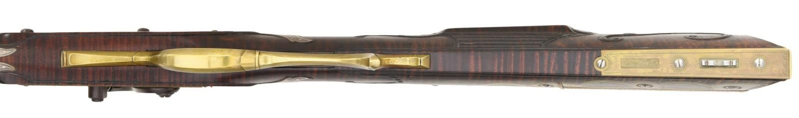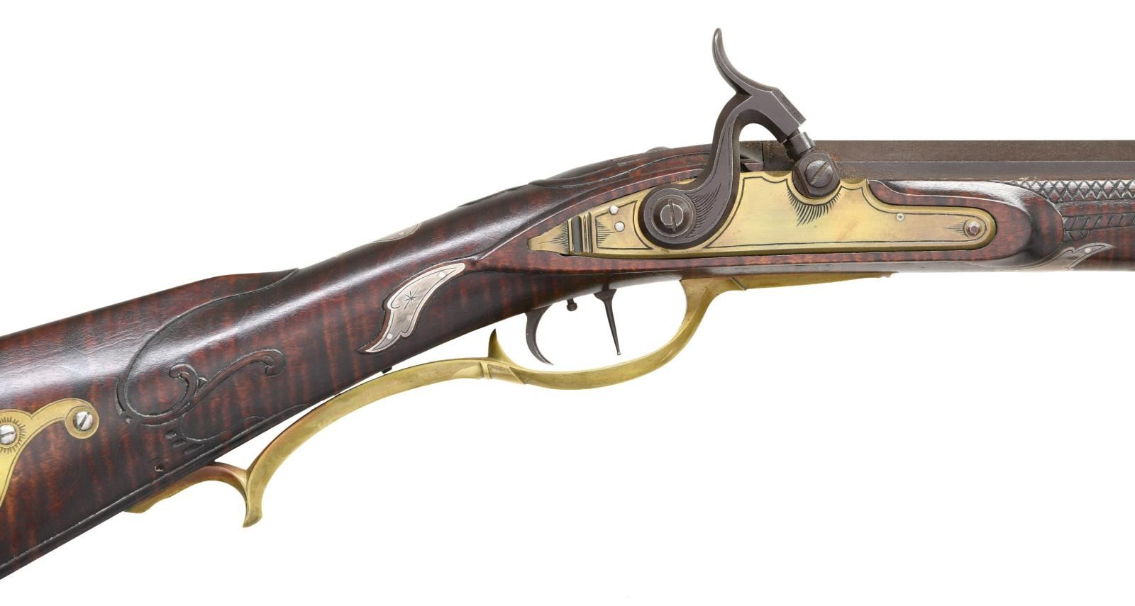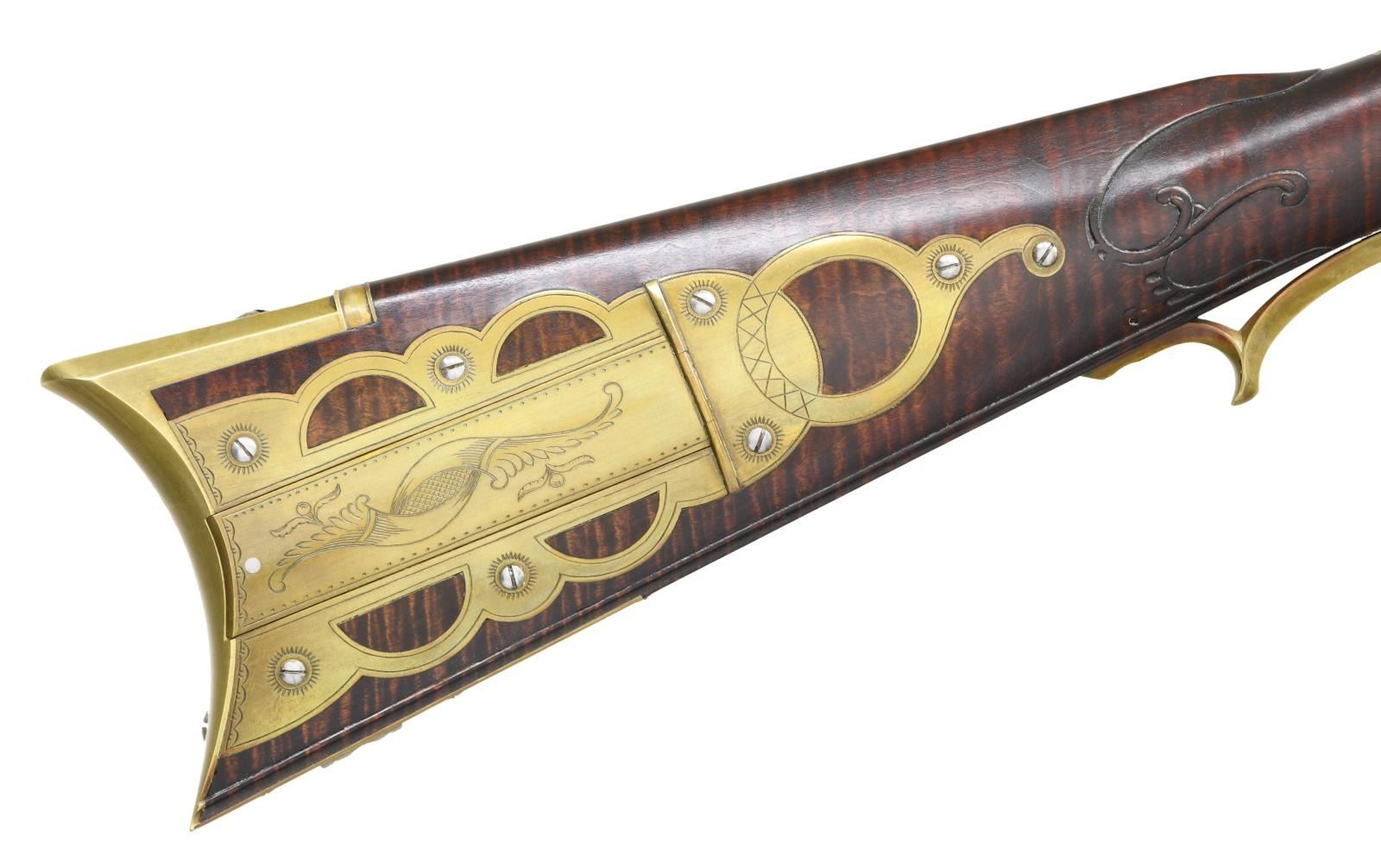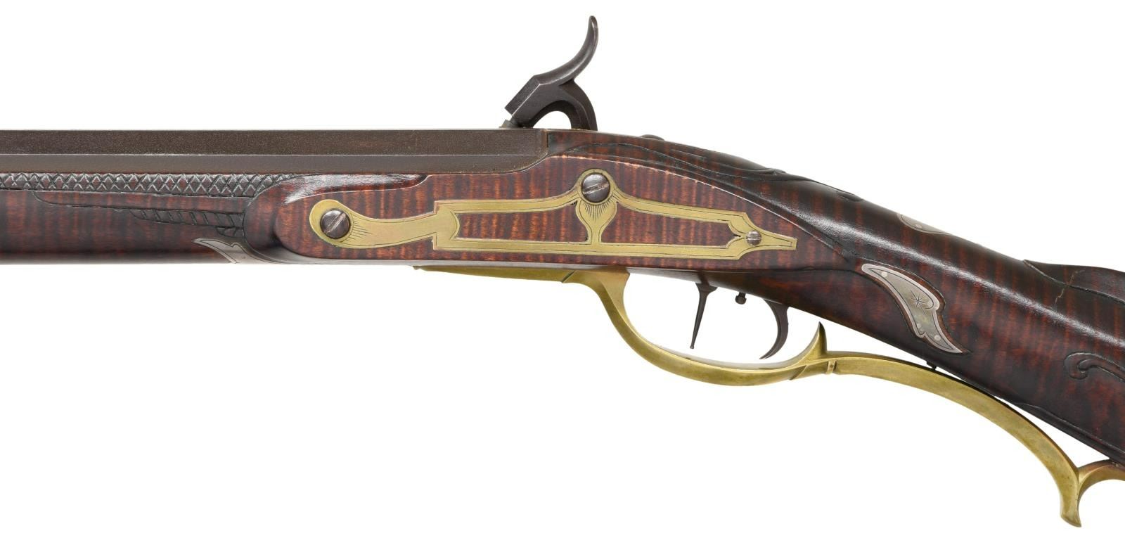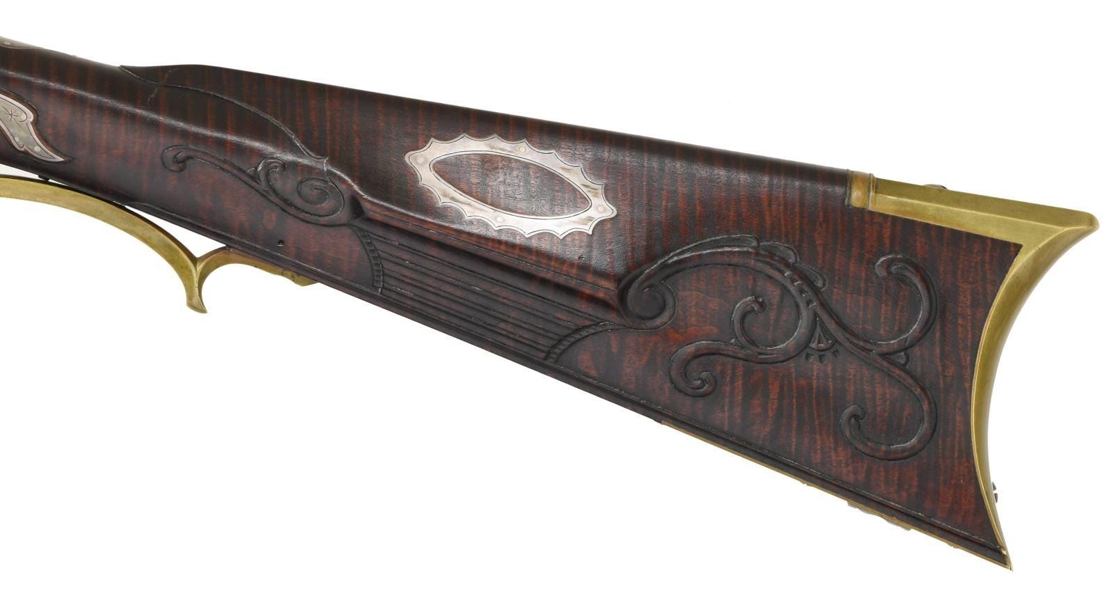 Cal. 45. S# NSN. Bbl. 44" octagon w/ dovetailed front sight having brass Rocky Mountain blade; dovetailed raised V notch rear. Fiddleback maple stock to include carvings, silver scalloped oval inlay on cheek piece, light engraving on patchbox lid, brass inletting to include patch box plus faceted tail pipe & browned rough textured barrel. Single action double set trigger. Overall length of 60", 13" LOP & weight of only 7 lbs. Silver inlay on each side & top of wrist area. Brass lock plate. Patchbox screws are bright oval headed; release is at rear of flat bottom by push button. All wood ramrod w/ jag shaped captive end. CONDITION: near excellent w/ proper recreated vintage look; appears old yet bright Maple showing in patch box. Near excellent shiny bore. PROVENANCE STATEMENT: From the Harold Prucha Collection. (01-23224/NW). ANTIQUE. $1,500-2,500.