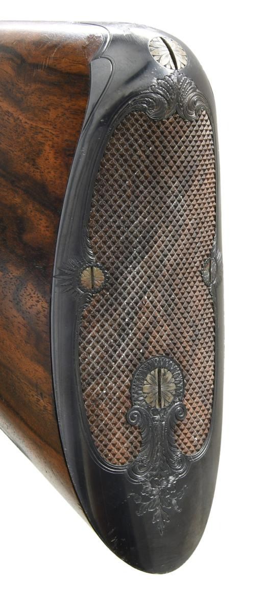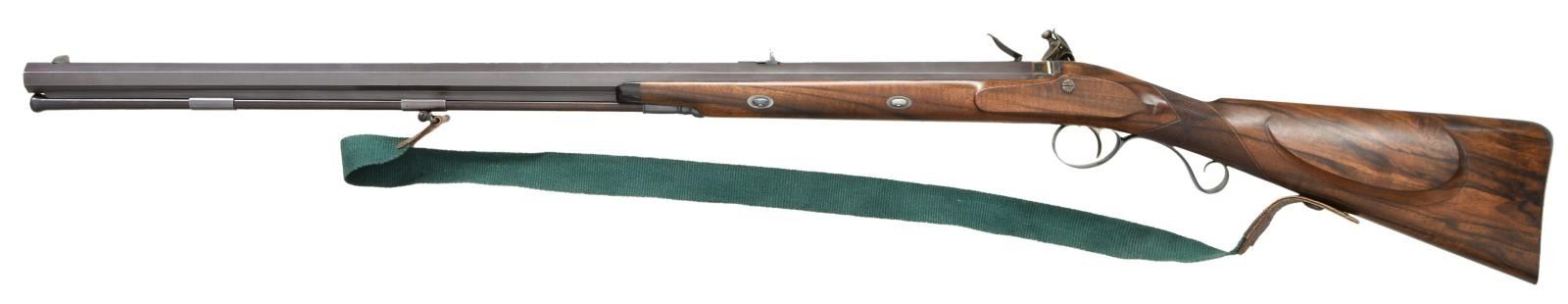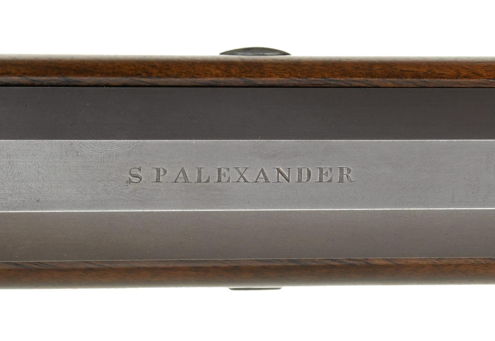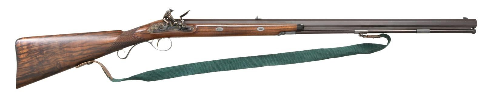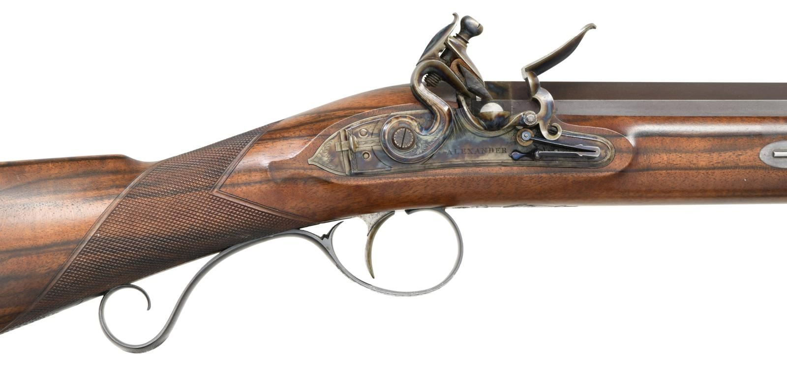 RIFLE. Cal. 58. NSN. Bbl. 31 3/4" double taper octagon. Top flat & lock are engraved "S. P. ALEXANDER", builder of the gun. Steven P. Alexander of Tucson, AZ is a contemporary of custom flintlock rifles. Blade front sight w/ express rear sight having one standing & one folding leaf. Case colored lock, hammer & top tang w/ floral engraving. Plain trigger. Wedge fastened half length cheekpiece stock of fancy European walnut w/ vivid dark streaking. Horn forearm tip. Case colored trigger plate has pineapple finial. Finger curl trigger guard has floral & sunburst engraving. Checkered skeleton butt w/ engraved blued steel long peak wide shotgun butt. Hardwood ramrod is held in iron underrib by an engraved faceted thimble & 2 plain iron pipes. Leather trimmed green web sling is held by a swivel on rear pipe & button on toeline. WEIGHT: 8 lbs, 15 oz. CONDITION: brown bbl. finish shows slight edge wear. Lock, top tang & trigger plate retain over 90% visible case colors. Original stock finish shows scattered scratches & marks. Bright near excellent bore. (01-21886/DS). ANTIQUE. $3500-5500.