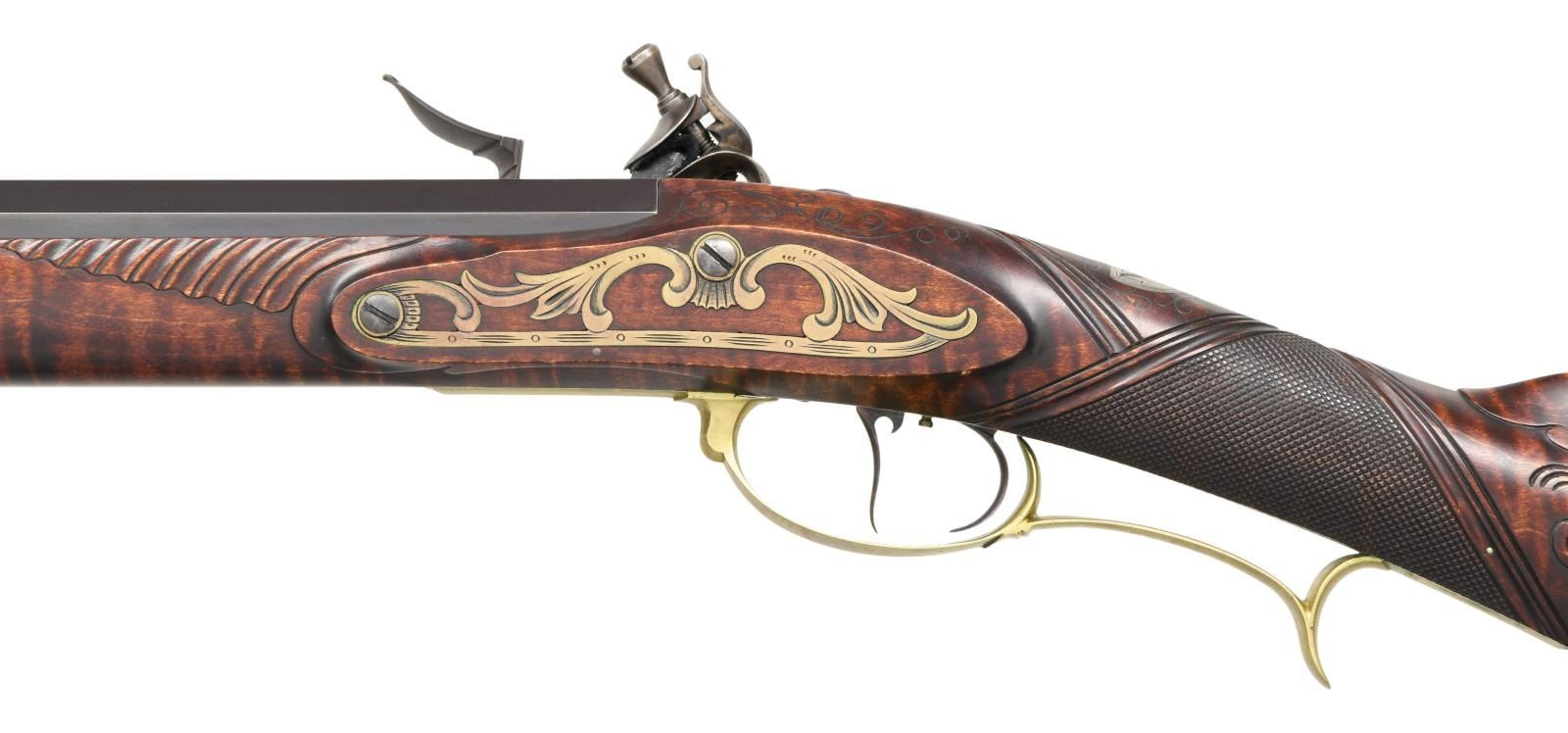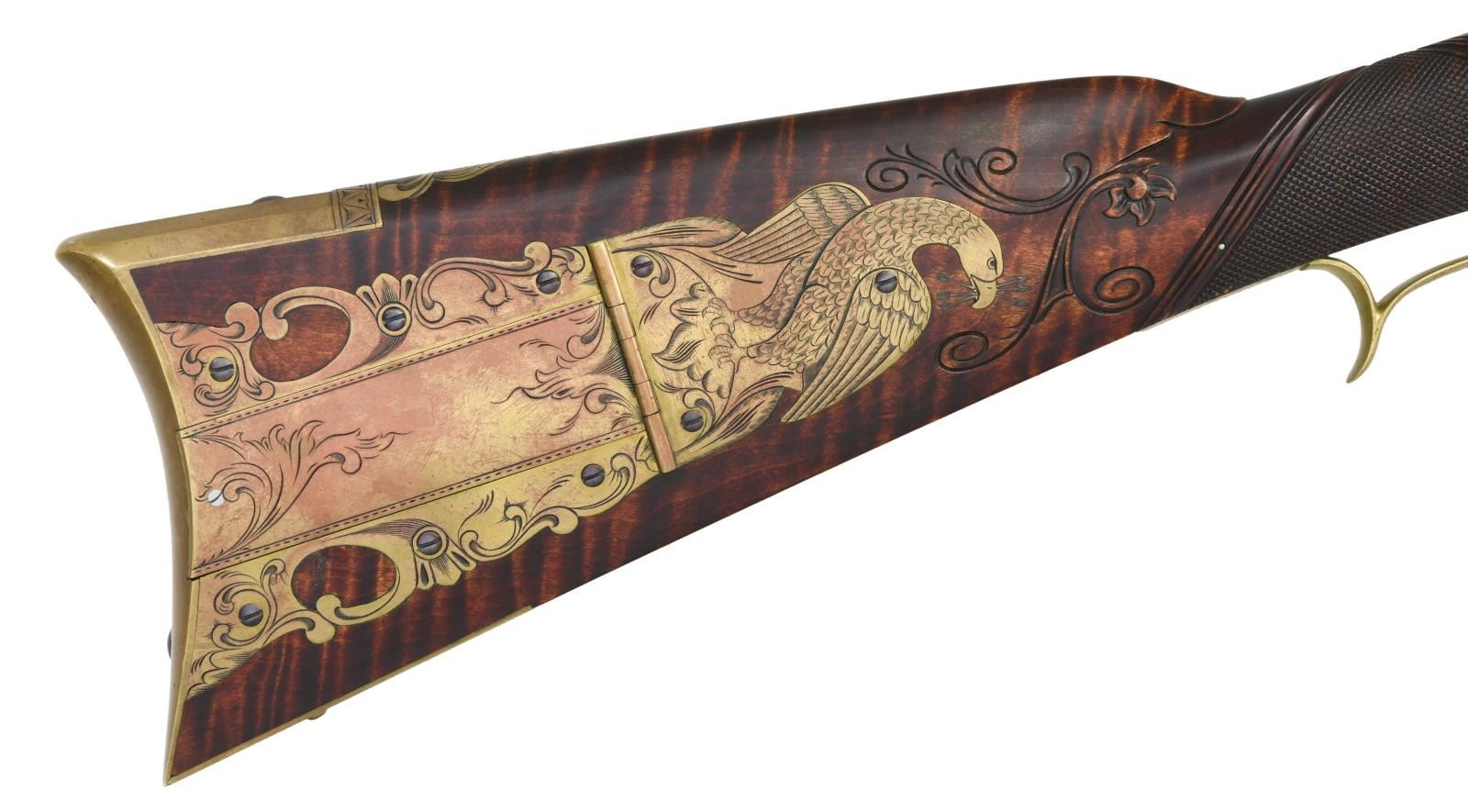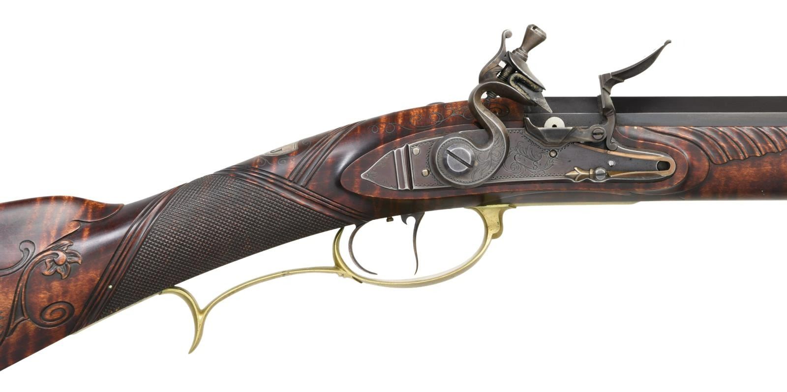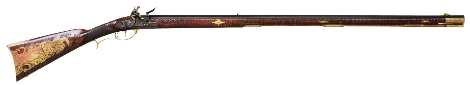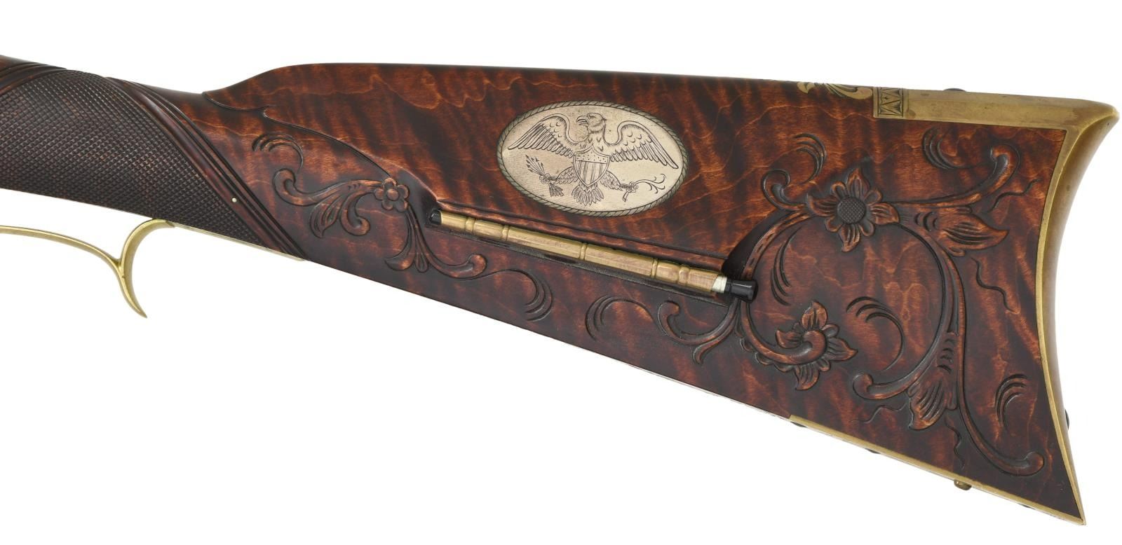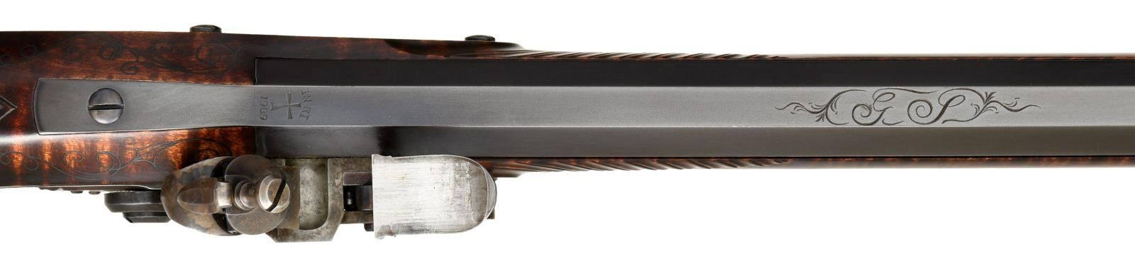 KENTUCKY RIFLE. Cal. 45. NSN. Bbl. 38 3/4" double taper octagon. Top flat is marked "GS" & "IN RI" over a cross w/ 1969 date. Brass blade front sight w/ fixed square notch rear sight. Lightly engraved lock is marked w/ builder's initials "GS". Double set triggers. Key fastened full length curly maple cheekpiece stock. Pierced segmented engraved brass eagle finial patchbox. Other engraved brass fittings include crescent buttplate w/ pierced finial, engraved toe plate, engraved pierced side plate & finger curled trigger guard. Forward trigger guard tang is marked "12". Molded cheekpiece has brass holder for a horn tipped flashhole pick. German silver oval plate on cheekpiece features an American eagle. Cheekpiece is surrounded by floral relief carving that matches carving around the patchbox. Wrist is finely checkered w/ double wide molded borders. German silver shield wrist plate w/ initials "NEJ" surrounded by silver wire inlay. Areas forward of lock & side plates have relief carved wedges. Forearm has star & geometric shaped key escutcheons surrounded by highlights of silver wire inlay. Brass tipped hardwood ramrod held by faceted brass thimble & 2 faceted brass pipes. Ramrod channel has molded borders w/ relief carving alongside the thimble. Brass forearm cap has spiral ornamentation. WEIGHT: 7 lbs, 11 oz. CONDITION: near excellent. Bbl. & lock retain 98% rust blued finish. Stock has very good finish showing a few small marks. Brass is beginning to acquire a light tarnish w/ areas showing a crimson tone. Bright near excellent bore w/ sharp rifling. (01-21925/DS). ANTIQUE. $4500-6500.