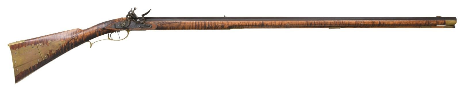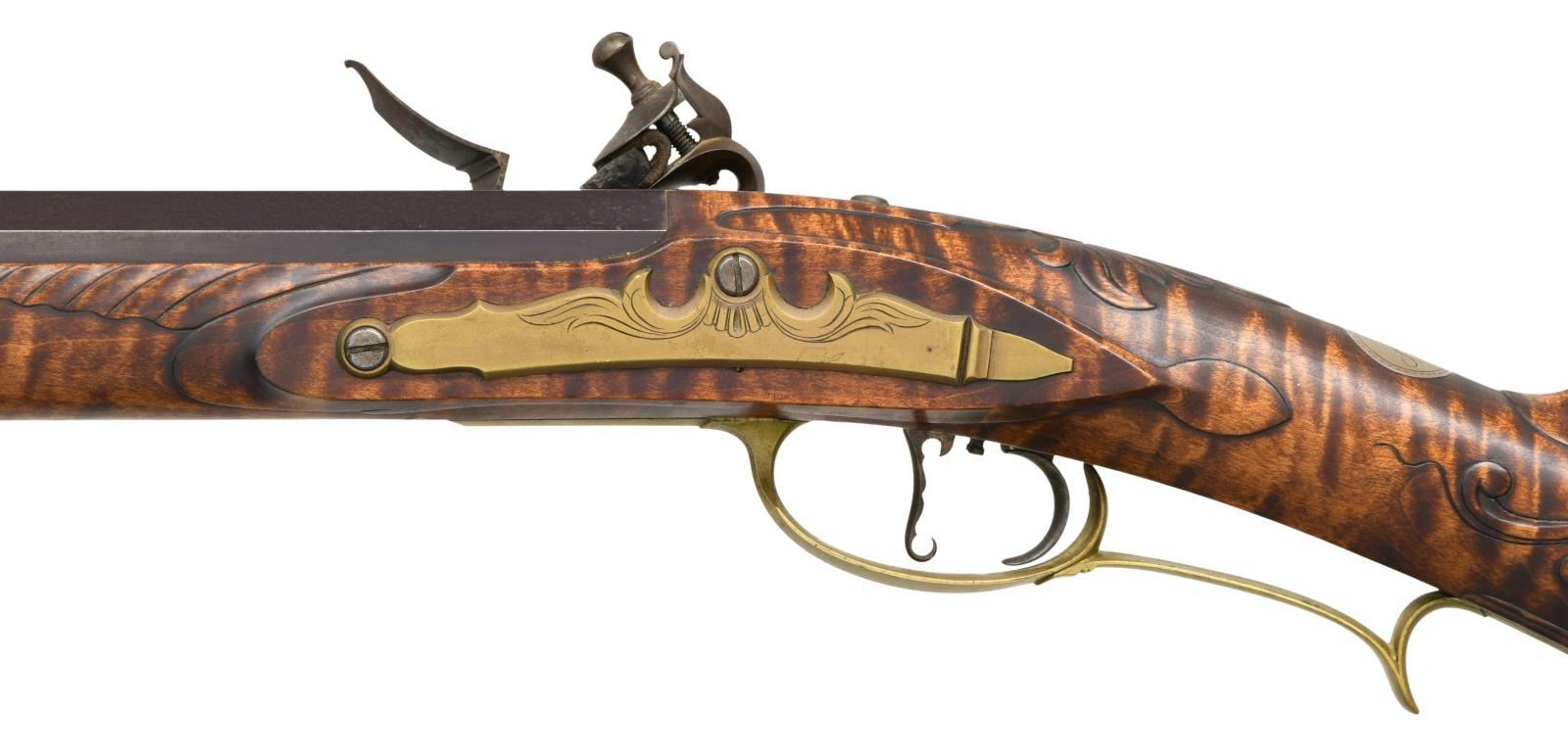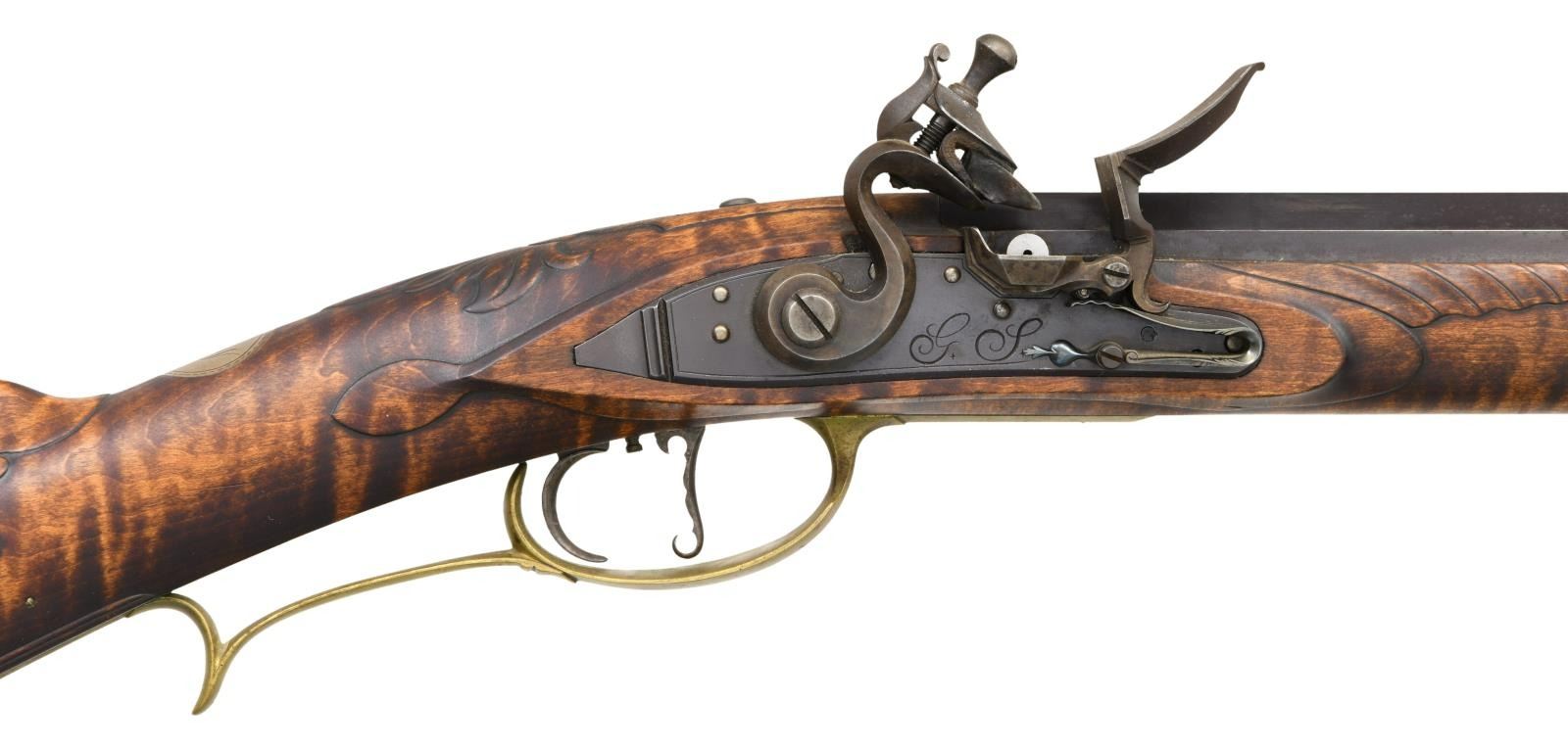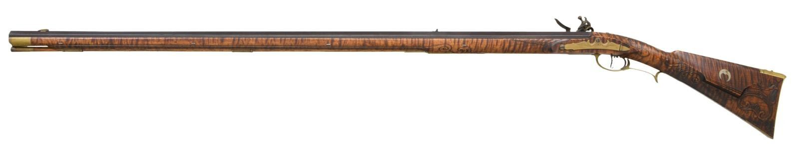 KENTUCKY FLINTLOCK RIFLE. Cal. 50. NSN. Bbl. 42" of double taper octagon. Top flat of bbl. & plain browned lock plate are marked w/ builder's initials "GS". Breech end of bbl. is marked "IN RI" over cross & initials "GS". Brass blade front sight w/ fixed square notch rear sight. Double set triggers. Wedge fastened full length curly maple cheekpiece stock. Brass segmented rectangular lid patchbox w/ open pattern engraving. Toe plate & side plate have complimentary engraving. Wide brass crescent buttplate, finger curled trigger guard & forearm cap. Circular wrist plate has initials "RW". Cheekpiece is ornamented w/ a German silver old man in the moon inlay. Cheekpiece has a lower molded border & is surrounded by relief carving that extends to top tang & wrist areas. Wedges of relief carving are found along the bbl. channel forward of the lock area & around the thimble. The ramrod channel & toeline of stock have molded borders. Brass tipped hardwood ramrod held by a faceted brass thimble & 2 faceted brass pipes. WEIGHT: 9 lbs, 1.6 oz. CONDITION: bbl. & lock retain over 90% brown finish showing scattered spotting. Stock has very good finish. Brass fittings are acquiring a pleasing tarnish. Bore is bright w/ sharp rifling. (01-21986/DS). ANTIQUE. $2500-4000.