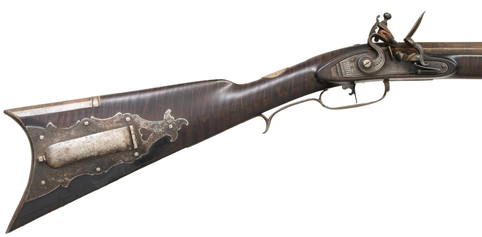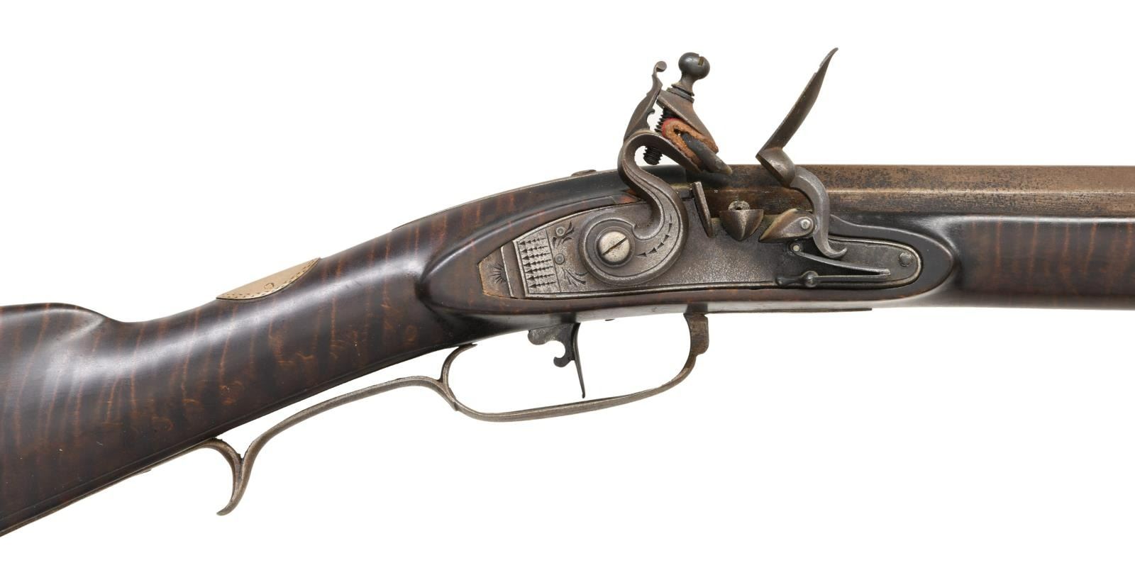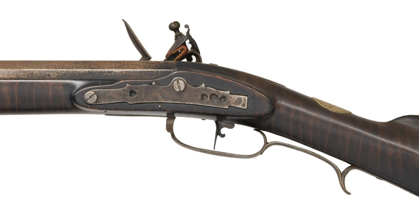 BY H. HOUSE. Cal. 45. S# NSN. Hershel House lives in the backwoods of Kentucky and the traditional rifles he produces are mostly handmade. This iron mounted rifle has 42" nicely swamped octagon barrel fitted with traditional sights. "H House" is engraved on inset silver rectangle on top flat. Flint lock appears to be sourced from the trade and has waterproof pan. Stock is of dense curly maple, extends to muzzle with pewter decoration and is pinned to barrel. Iron mounts include crescent buttplate, trigger guard with spur at rear, long sideplate and patchbox with latch on fancy plate are all handmade. Heart and floral decoration are stamped into trigger guard and sideplate where they surround a deeply struck "H". Hickory ramrod mounts through two faceted pipes and matching thimble. CONDITION: very fine as artificially aged. All iron with light brown to dark gray pitted patina. Stock is very fine with a few minor marks in its dark oil finish. Bore is shiny. Mechanically good. (01-21976/MGM). ANTIQUE. $2,500-4,500.