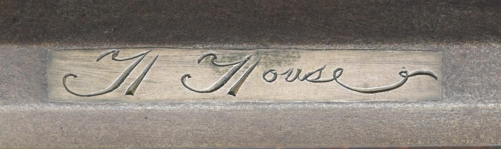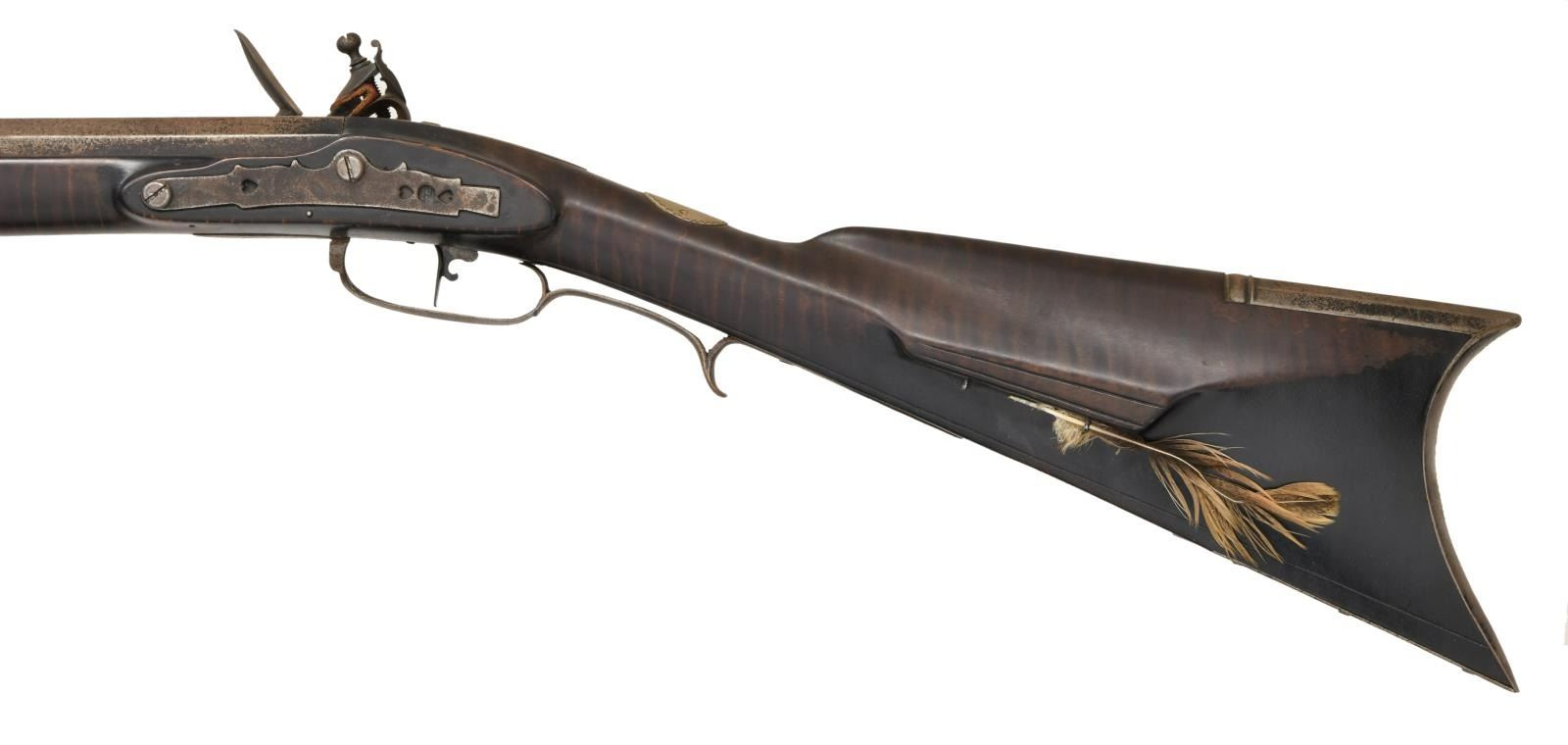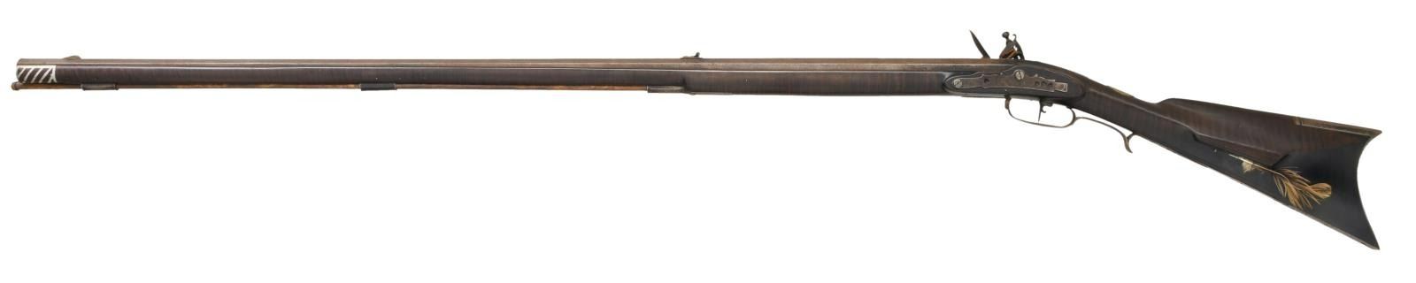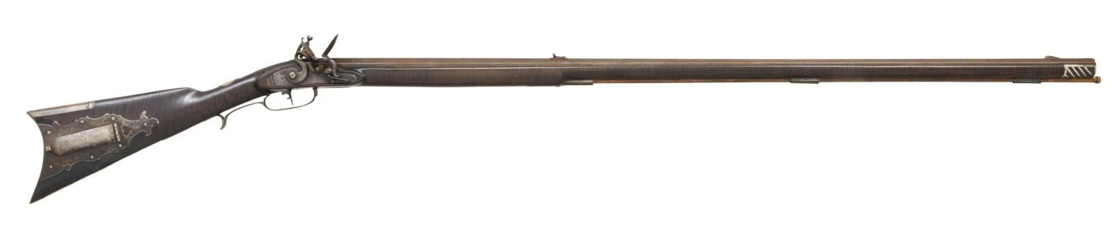 BY H. HOUSE. Cal. 45. S# NSN. Hershel House lives in the backwoods of Kentucky and the traditional rifles he produces are mostly handmade. This iron mounted rifle has 42" nicely swamped octagon barrel fitted with traditional sights. "H House" is engraved on inset silver rectangle on top flat. Flint lock appears to be sourced from the trade and has waterproof pan. Stock is of dense curly maple, extends to muzzle with pewter decoration and is pinned to barrel. Iron mounts include crescent buttplate, trigger guard with spur at rear, long sideplate and patchbox with latch on fancy plate are all handmade. Heart and floral decoration are stamped into trigger guard and sideplate where they surround a deeply struck "H". Hickory ramrod mounts through two faceted pipes and matching thimble. CONDITION: very fine as artificially aged. All iron with light brown to dark gray pitted patina. Stock is very fine with a few minor marks in its dark oil finish. Bore is shiny. Mechanically good. (01-21976/MGM). ANTIQUE. $2,500-4,500.