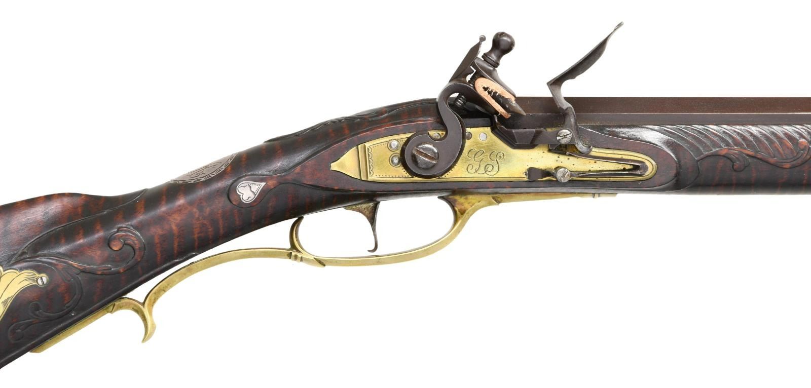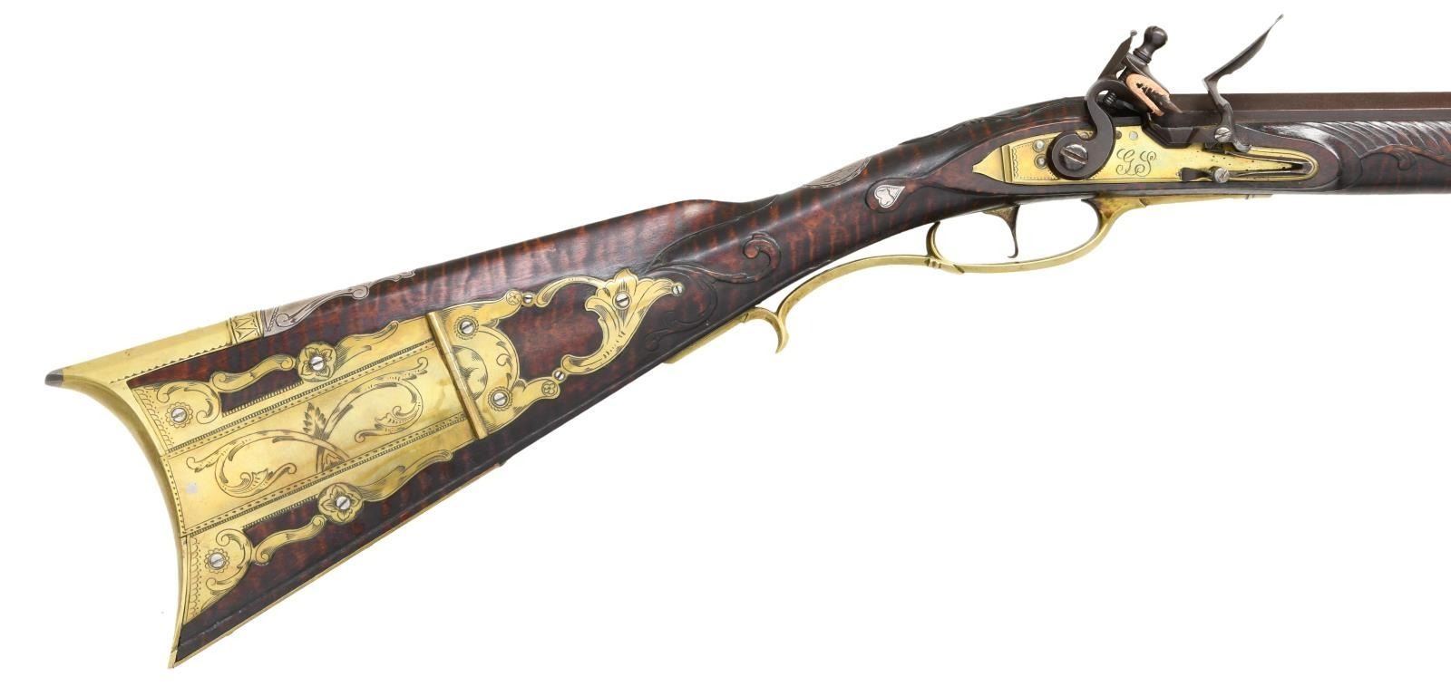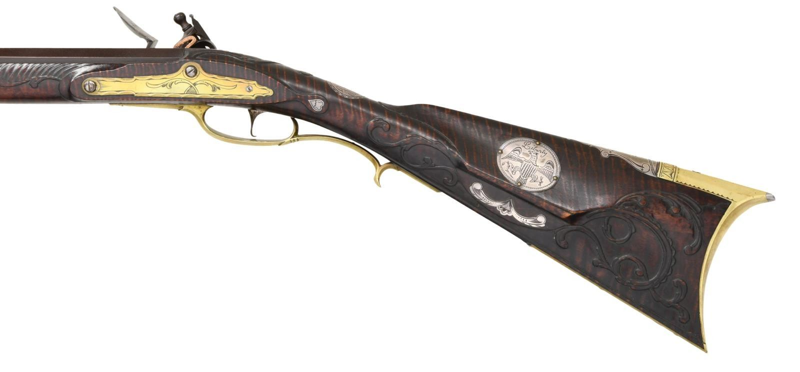 KENTUCKY RIFLE BY G. STANFORD. Cal. 40. S# NSN. The 44" swamped octagon barrel has standard sights, rear with silver inlaid scroll in front of dovetail. "G. Stanford" is engraved on brass rectangle inlet in top flat (George was a highly regarded riflesmith and part of the Blandensburg School). Lock with chamfered brass plate appears to be handmade using old internal parts and is fitted with serpentine cock, inset faceted pan, bridled friction frizzen and feather spring with flatted bulbous finial. Center of plate is engraved "GS". Stock of exceptional curly maple extends to muzzle with brass cap and attaches to barrel with four side bolts through nicely shaped and engraved silver escutcheons, rear in the form of an eight pointed star. Raised carved mouldings are around lock and sideplate and with raised carved scrolls around thimble, barrel tang and either side of traditional cheek rest. There is also some fluted and scroll carving at front of lock and sideplate. Brass mounts are nicely engraved and include heavy buttplate with steel tip at heel which has engraved silver finial. 5 1/2" buttplate return has two inlaid silver hearts and is engraved "R. A. Cole" "His Rifle". Other mounts include faceted trigger guard, long file decorated sideplate and very fancy patchbox with pierced scroll sideplates and matching finial. Patchbox cover opens by pushing rear heart on buttplate return. Other silver mounts include crestplate engraved "RAC" and silver circle on cheek piece face engraved with heraldic eagle under "Liberty". Curly hickory ramrod mounts through two turned and faceted brass pipes and matching thimble. CONDITION: exceptionally fine with only a very few marks in all fine finishes. Bore is bright and shiny. Mechanically fine. PROVENANCE STATEMENT: From the Harold Prucha Collection. (01-23225/MGM). ANTIQUE. $2,000-3,000.