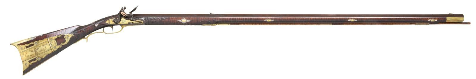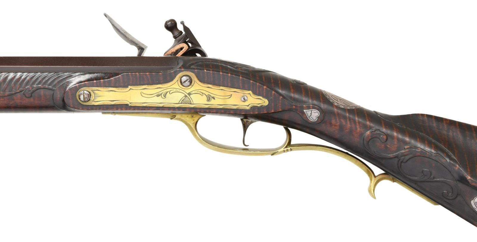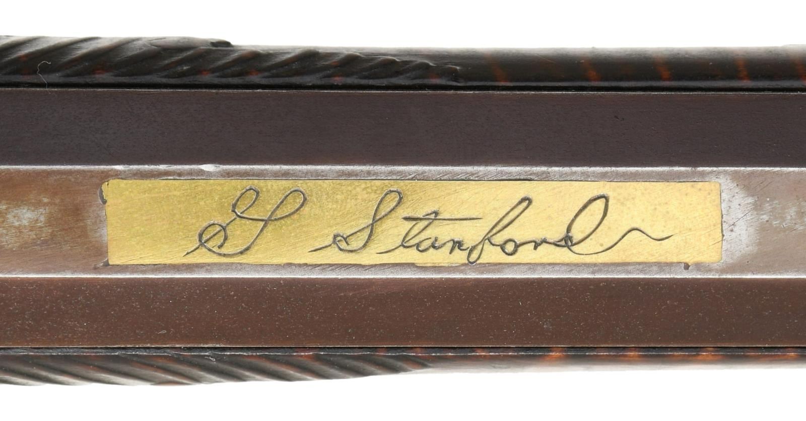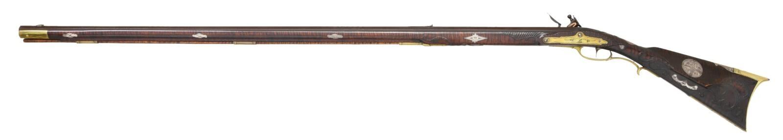 KENTUCKY RIFLE BY G. STANFORD. Cal. 40. S# NSN. The 44" swamped octagon barrel has standard sights, rear with silver inlaid scroll in front of dovetail. "G. Stanford" is engraved on brass rectangle inlet in top flat (George was a highly regarded riflesmith and part of the Blandensburg School). Lock with chamfered brass plate appears to be handmade using old internal parts and is fitted with serpentine cock, inset faceted pan, bridled friction frizzen and feather spring with flatted bulbous finial. Center of plate is engraved "GS". Stock of exceptional curly maple extends to muzzle with brass cap and attaches to barrel with four side bolts through nicely shaped and engraved silver escutcheons, rear in the form of an eight pointed star. Raised carved mouldings are around lock and sideplate and with raised carved scrolls around thimble, barrel tang and either side of traditional cheek rest. There is also some fluted and scroll carving at front of lock and sideplate. Brass mounts are nicely engraved and include heavy buttplate with steel tip at heel which has engraved silver finial. 5 1/2" buttplate return has two inlaid silver hearts and is engraved "R. A. Cole" "His Rifle". Other mounts include faceted trigger guard, long file decorated sideplate and very fancy patchbox with pierced scroll sideplates and matching finial. Patchbox cover opens by pushing rear heart on buttplate return. Other silver mounts include crestplate engraved "RAC" and silver circle on cheek piece face engraved with heraldic eagle under "Liberty". Curly hickory ramrod mounts through two turned and faceted brass pipes and matching thimble. CONDITION: exceptionally fine with only a very few marks in all fine finishes. Bore is bright and shiny. Mechanically fine. PROVENANCE STATEMENT: From the Harold Prucha Collection. (01-23225/MGM). ANTIQUE. $2,000-3,000.