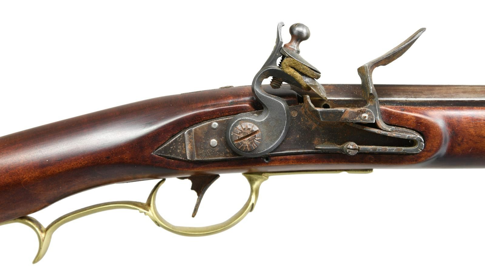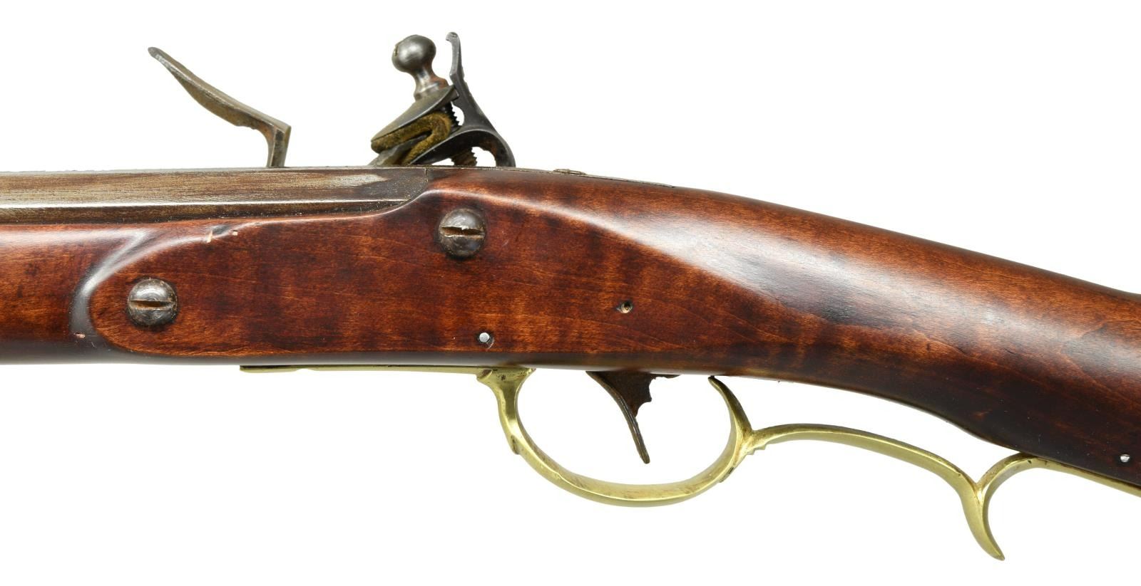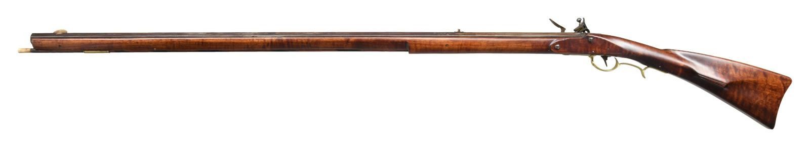 FLINTLOCK KENTUCKY RIFLE. Cal. 50. NSN (2011). A custom made rifle made at the Historical Henry Gun Works, in Jacobsburg, Pennsylvania. The rifle is engraved with the names of the 3 master gunsmiths who made this rifle "J. CORELL, R. HUJSA, C. LANDIS". Oct. 38" bbl. w/ brass blade front sight & U notch rear sight. Handmade single trigger. Lehigh style curly maple stock w/ reddish tone finish, scant cheekpiece, brass furniture, bare butt & artificially striped bone tipped hardwood ramrod. UNATTACHED ACCESSORIES: Letter signed by the three master gunsmiths detailing about the rifle. CONDITION: bbl. blue fading w/ large areas turning to gray & brown w/ oxidation around touch hole & trigger. near excellent wood finish. Bass is starting to acquire patina. Very good shiny bore w/ strong rifling & light frosting near muzzle. (01-23912/MD). ANTIQUE. $500-1,000.