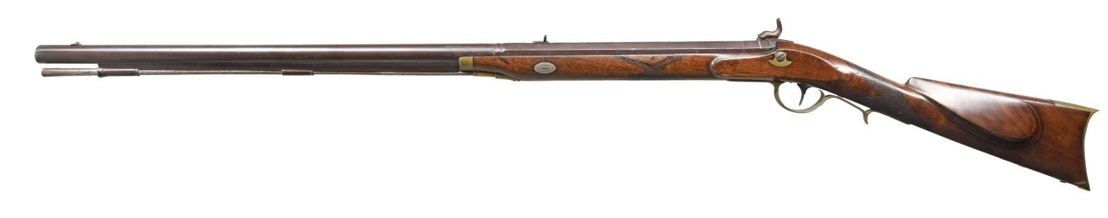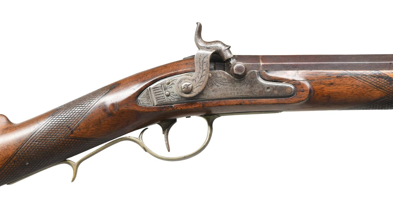 Cal. 54. NSN. Bbl. 33" half-rnd half-oct. Short blade front sight. Fixed rear sight. Converted to percussion likely during the 19th century. Lock marked "CE WERSON WARRANTED". Bbl. is recycled from a Harper's Ferry U.S. 1803 musket & bears faint proofs from that arsenal. Lock, hammer & upper tang have floral engraving. Checkered walnut half-stock w/ left side cheekpiece & key escutcheon. Brass finger curl trigger guard & curved buttplate. Iron ramrod secured by a brass thimble & two iron pipes. CONDITION: stock appears refinished long ago w/ a repaired 5" crack ahead of lock, an added splice of checkering on both sides of forend, scattered dings & handling wear. Brass parts are a dull yellow patina w/ scattered oxidation & light dings. Lock is a light gray patina w/ scattered oxidation & pitting. Bbl. is a dark patina w/ scattered oxidation, light pitting & dings. Bore has scattered oxidation & pitting but strong rifling. PROVENANCE: From the Collection of James B. Taylor. (01-23871/MJC). ANTIQUE. $1000-1500.