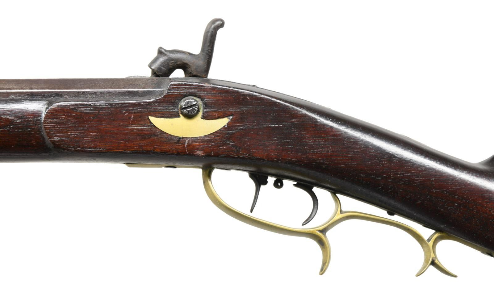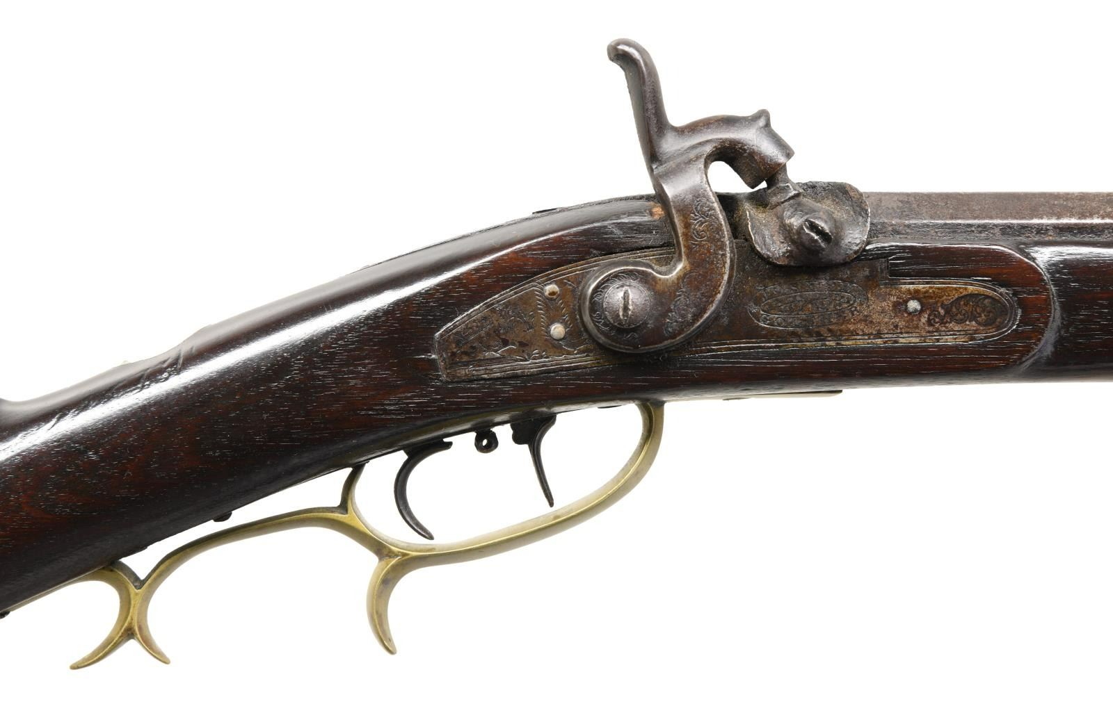 LOCK. Cal. 32. NSN. Oct. 44" bbl. measuring .85" across. German silver blade front sight & U notch rear sight. Joseph Golcher lock w/ light scroll & engraving that highlights fowl scene behind hammer. Dbl. set triggers; rear is set. Full length pinned walnut stock w/ brass furniture. Scant oval cheekpiece has German silver star. Hardwood ramrod. CONDITION: Dark brown patina appearance to bbl. & lock w/ deep pitting & area of cleaning around nipple shield. Very good wood finish showing scattered marks & sliver of wood missing from left side bbl. channel. Brass has a light mustard patina appearance. Bore has strong rifling w/ dark grooves. PROVENANCE: From the Lifelong Collection of Glen E. Mattox. (01-22548/MD). ANTIQUE. $600-800.