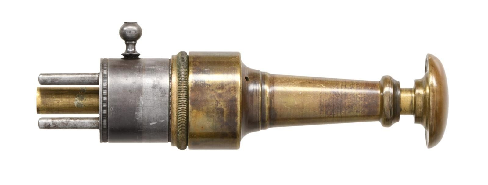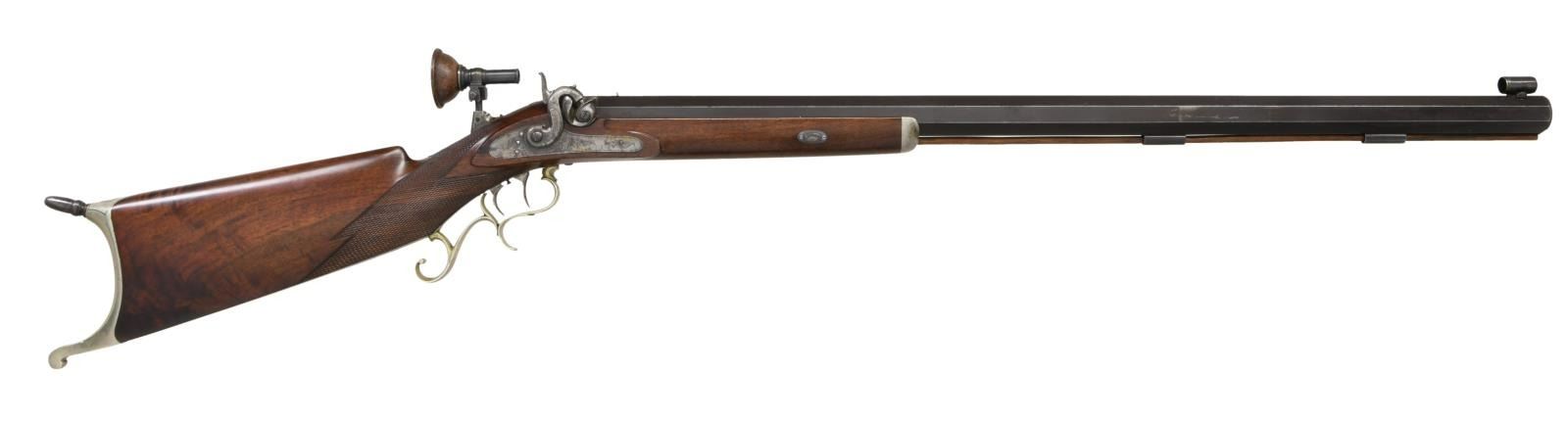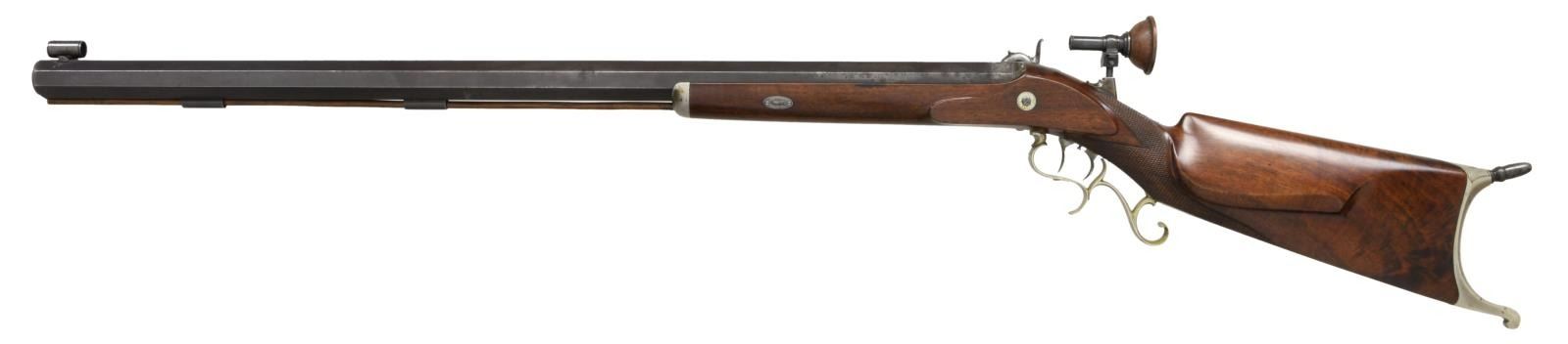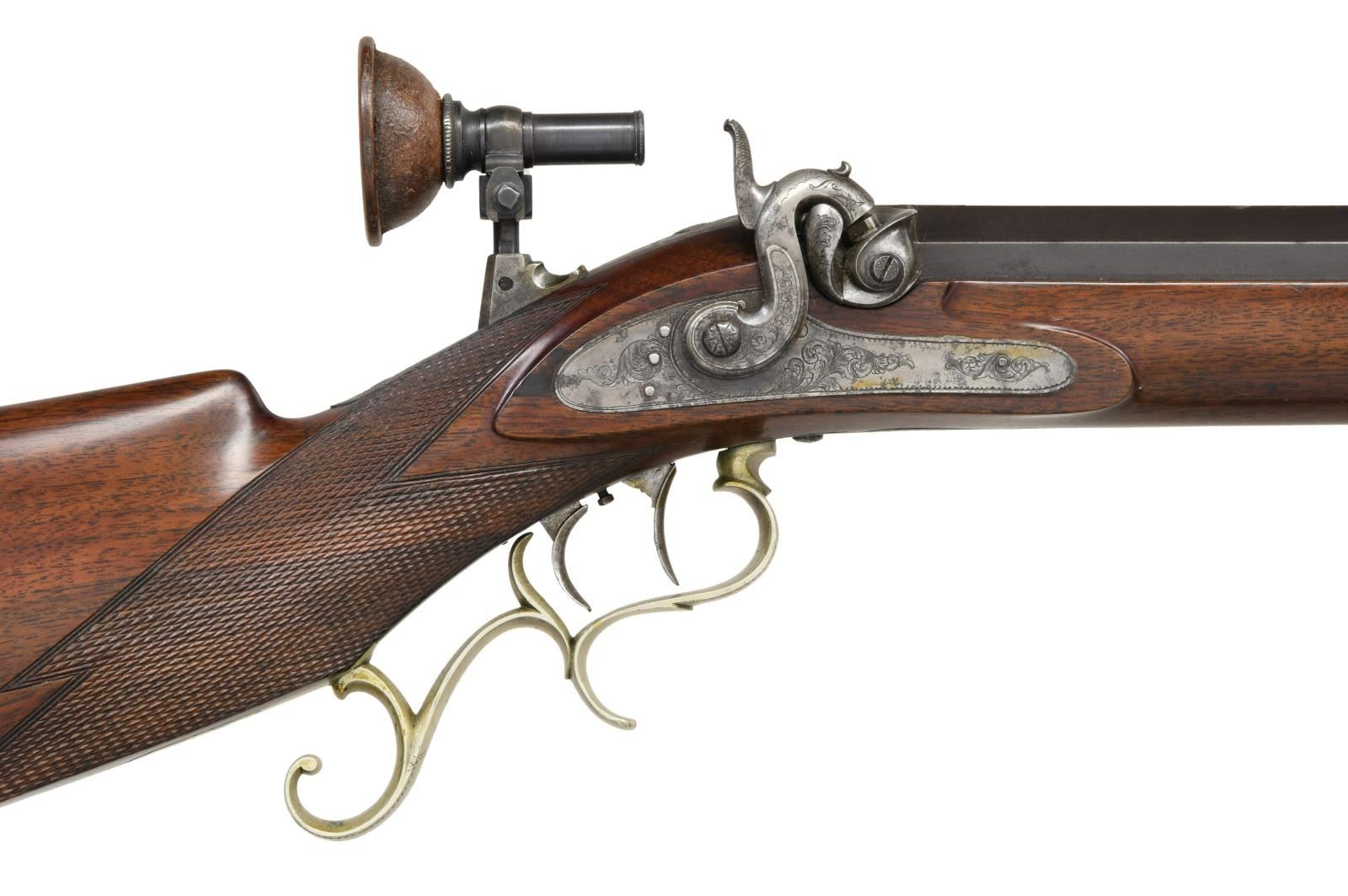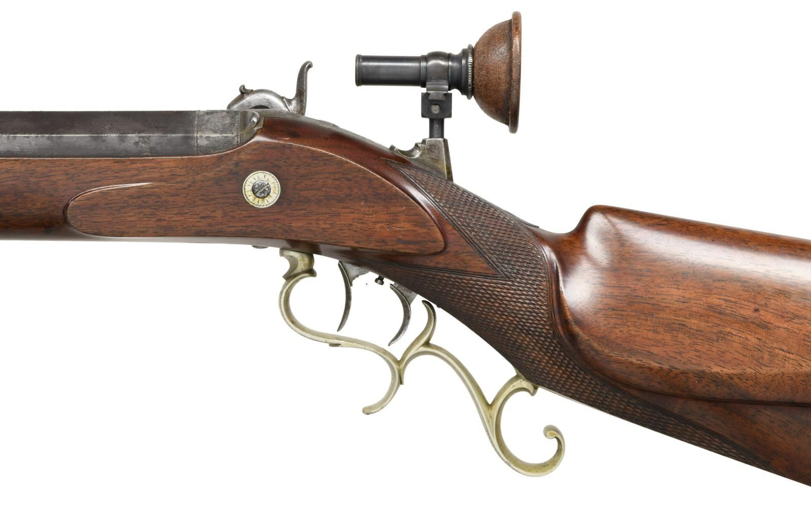 Cal. 40. NSN. American Gunsmiths by Frank M. Sellers gives the following listing, "SCHALCK, GEORGE, (1821-1893). Pottsville, Pennsylvania, 1854-. Patents #169,734, November 9, 1875, wad for rifles, guns, #226,555, April 13, 1880, trigger. Percussion rifles. (MB 3-42)". Bbl. 31 1/8" heavy octagon measuring 1 3/16" across flats is fitted w/ a false muzzle for loading. Globe front sight. Tang mounted extended tube windage adj. peep sight w/ rubber eyepiece. Case colored island style lock & hammer w/ scroll engraving that continues to the top tang, patented breech, trigger plate & trigger guard. Double set triggers. Key fastened half length fancy walnut target stock w/ checkered wrist & pewter forearm cap. LOP: 13 1/8" to engraved nickel finished Schuetzen buttplate. Engraved German silver finger curl trigger guard. Hardwood ramrod is held by two plain iron pipes. WEIGHT: 14 lbs, 2.7 ozs. UNATTACHED ACCESSORIES: false muzzle & brass bullet starter. Small iron wing screw. CONDITION: bbl. retains 70% fading blue showing edge & carry wear w/ scratches. Lock has faded to gray w/ spots of corrosion. Stock has very good finish & checkering showing small handling marks. Sound lock & triggers. Bore is bright w/ strong rifling. PROVENANCE STATEMENT: From the Harold Prucha Collection". (01-23253/DS). ANTIQUE. $3500-5000.