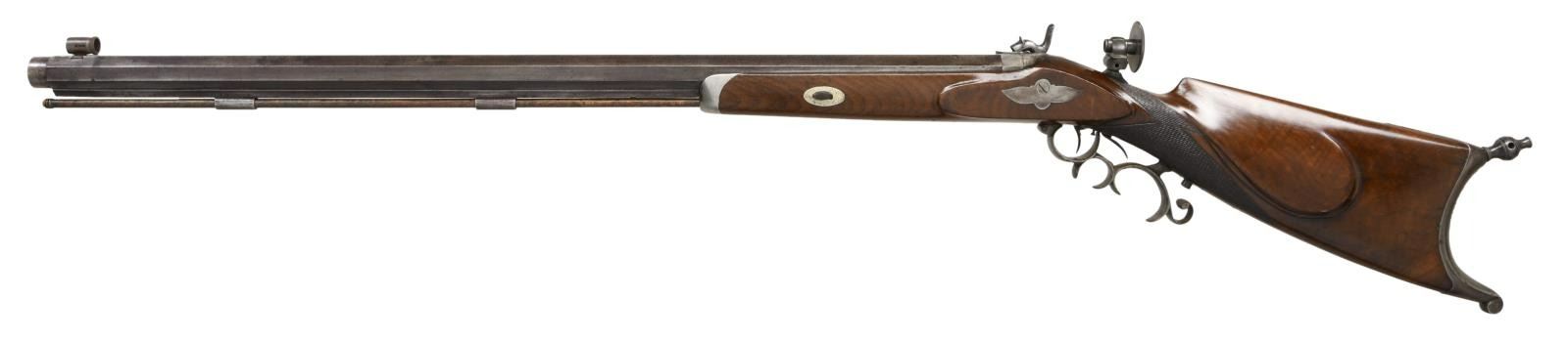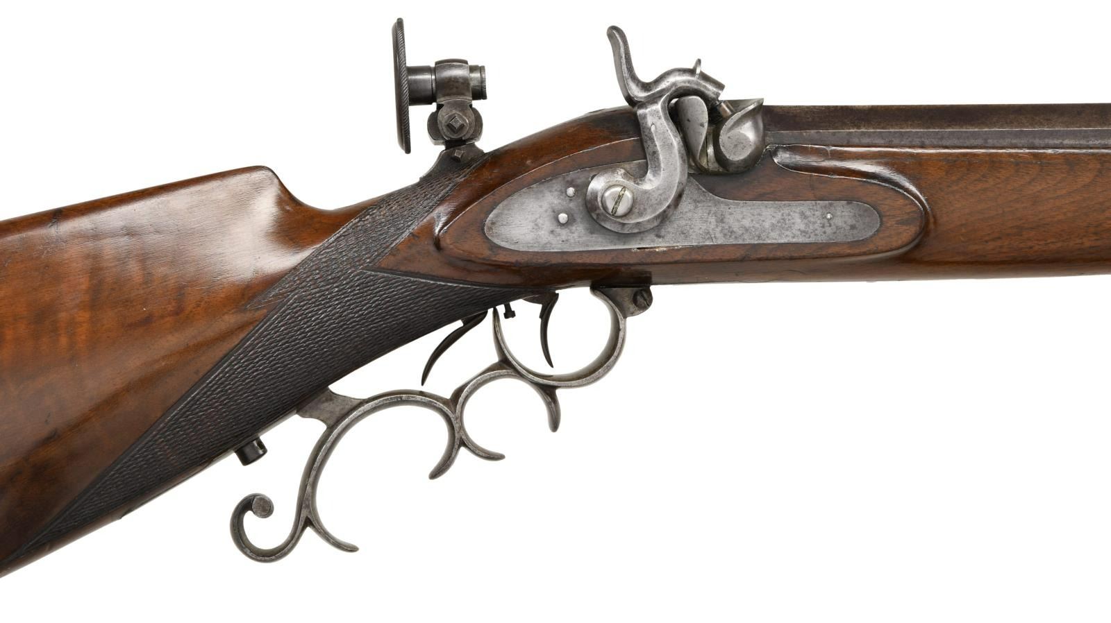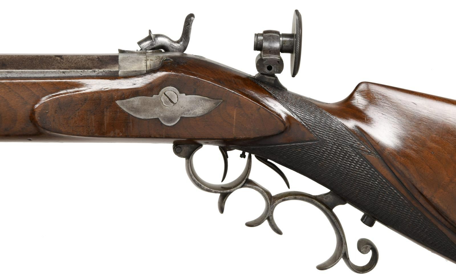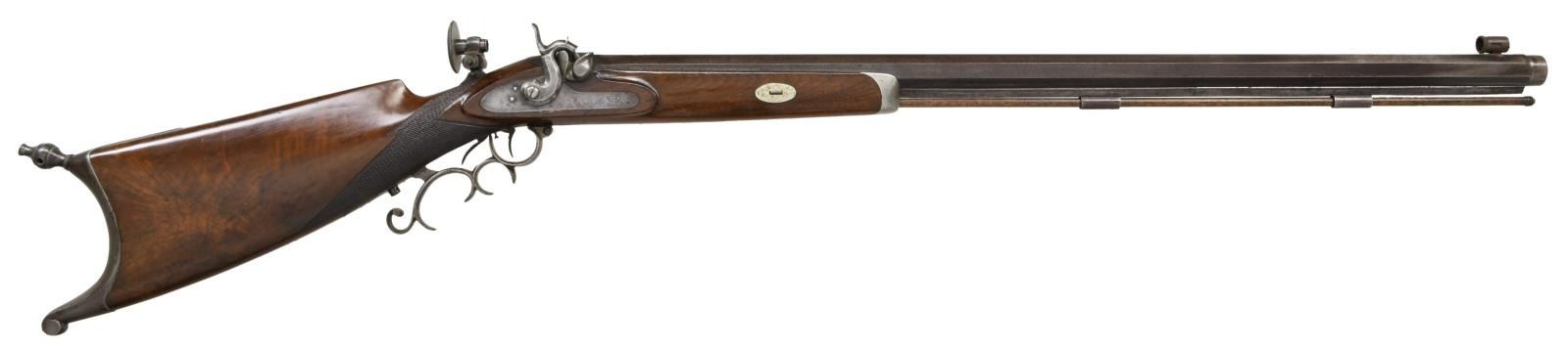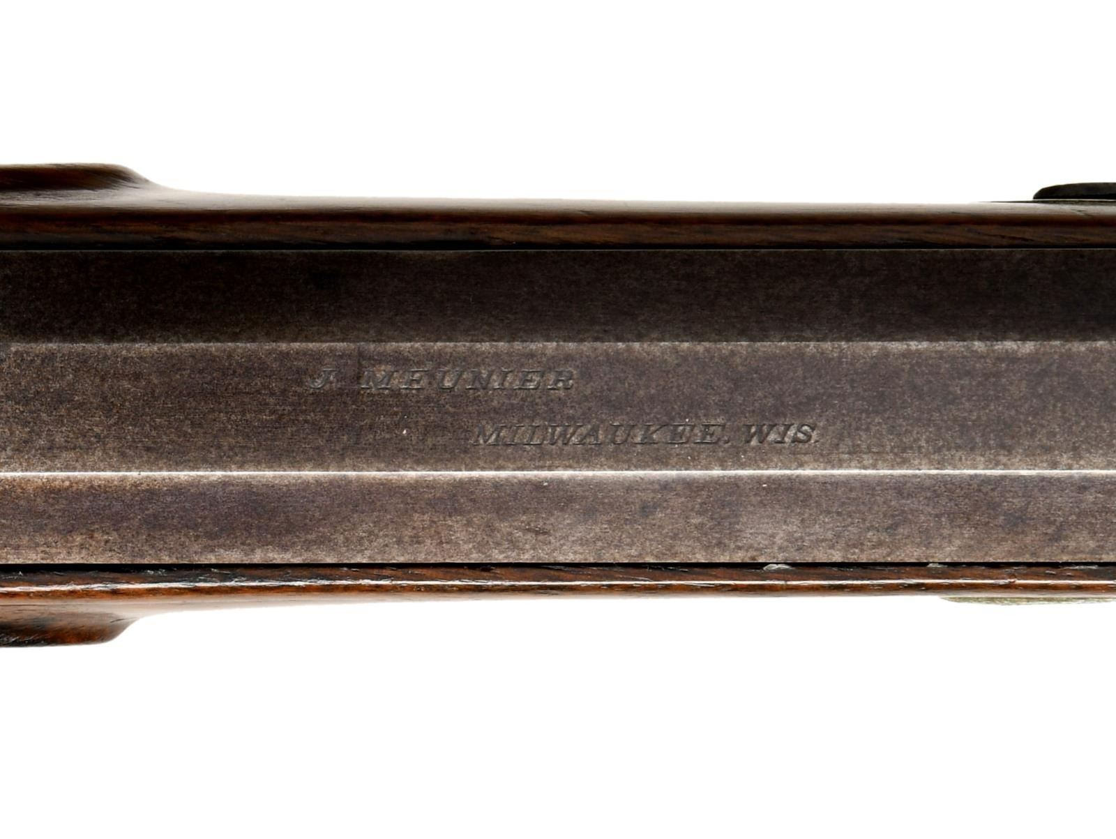 RIFLE BY J. MEUNIER. Cal. 38. S# NSN. The 31 1/4" heavy octagon barrel with muzzle turned for bullet starter is stamped "J. MEUNIER" "MILWAUKEE. WIS." on top flat. Breech plug has deep snail shell percussion bolster. Breech iron is fitted with raised base holding windage adjustable aperture sight with large disk. Front spring island lock with chamfered serpentine hammer is unmarked. Rifle is fitted with double set triggers. Steel trigger guard has many finger spurs. Crotch figured American walnut half stock with pewter cap features hook butt, swept right hand cheekpiece and point pattern checkering. Old hickory ramrod mounts through two plain pipes. CONDITION: good, as partially refinished. Barrel retaining most of what appears to be its original blue. Other metal parts show cleaning to gray with silver highlights. Stock retains what may be its original finish with added oil. Checkering lightly worn. Bore is fine with some scattered light pitting. Mechanically good. PROVENANCE STATEMENT: From the Harold Prucha Collection. (01-23254/MGM). ANTIQUE. $2,000-2,700.