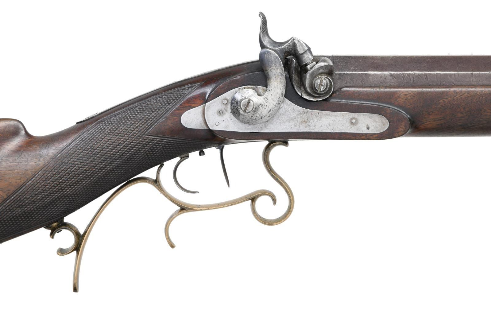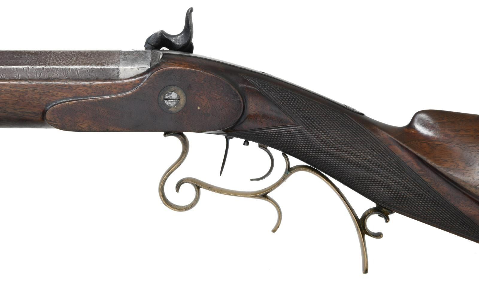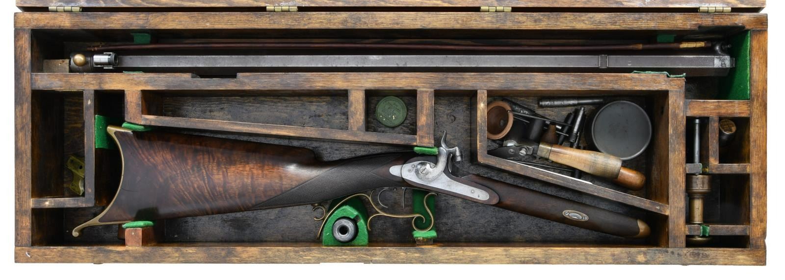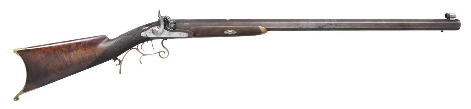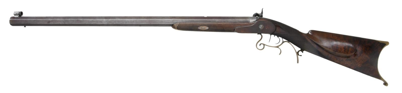 OF POTTSVILLE, PA. WITH FALSE MUZZLE MOLD, BULLET STARTERS, ETC., IN WOODEN BOX. Cal. 36. S# NSN. George Schalk worked in the mid 19th Century and died in 1892. He patented a wad for rifles, a trigger and a system of rifling that bares his name. This rifle has 30 1/2" heavy octagon barrel fitted with Lyman #17 type front sight. Maker's name and address is at rear of left top flat. Barrel is fitted with false muzzle. Breech plug has nicely carved bolster with clean out. Island type front spring lock with rebated tail has round bodied hammer and is unmarked. Triggers are double set, half stock of crotch figured American walnut is fitted with brass hooked butt, curled brass trigger guard with finger spur and forend tip without provision for ramrod. Stock has swept right hand cheekpiece and point pattern checkering at grip. UNATTACHED ACCESSORIES: gun is housed in homemade wooden box which contains: bullet starter, 2 Tisdale single cavity bullet moulds with plugs for different bullet noses, tin of various bullets, turn screw, wooden ramrod, brass plate for bench firing use and other wooden bits. CONDITION: good to very good. Barrel retaining about half its original brown. Lock and other iron cleaned to silver gray. Brass is well toned. Stock retains most of its original varnish finish. Bore is fine with some light frosting noted. Mechanically good. Lock does not have half cock notch. Accessories are generally good. Box is fine. PROVENANCE STATEMENT: From the Harold Prucha Collection. (01-23276/MGM). ANTIQUE. $2,000-3,000.