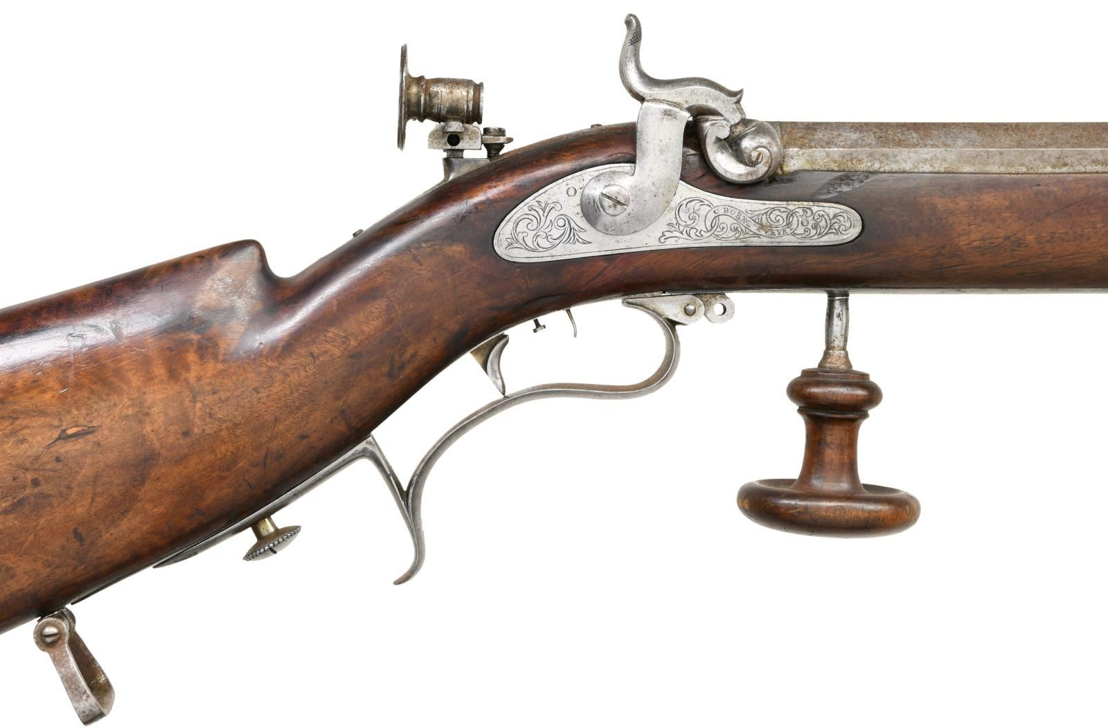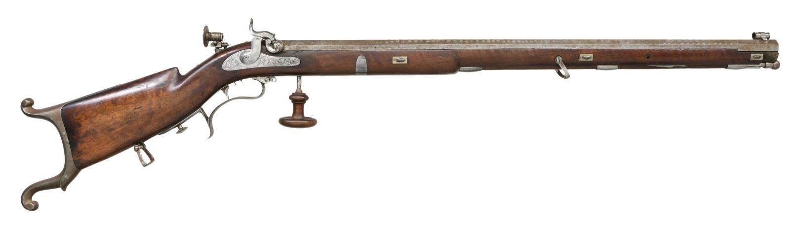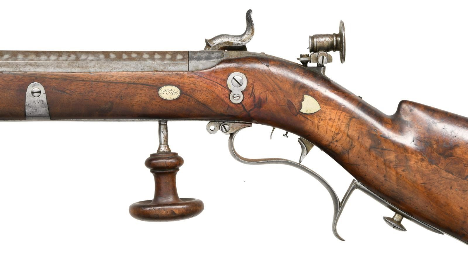 RIFLE BY C. BOREL. Cal. 45. S# NSN. 33 1/2" heavy octagon barrel measuring 1.24" across flats is unmarked. Breech plug is nicely filed with scroll decoration and has clean out. Island front spring lock with flat faced hammer is engraved with scroll. "C. BOREL A VAUD" (Charles Borel working in Vaud Switzerland Circa 1850) is on front part of lock. Trigger is double set with small hair as front trigger. Crotch figured walnut full length stock attaches to barrel with three captive side bolts and ends in heavy cast iron Swiss buttplate. Large sling swivels are present. Trigger guard with palm spur swivels to allow removal of trigger group. A palm rest screws into long steel extension of thimble. A silver oval on left side is engraved "L. Pilet". Top tang is fitted with windage and elevation adjustable rear sight. A wood encased steel ramrod mounts through two plain steel pipes. CONDITION: good. Barrel retaining moteled silver gray finish with some engine turning on side flats to approximate damascus finish. Otherwise iron parts show most of their bright finish. Stock retains most of its original varnish with noted cracks in fore piece and many scratches and marks. Bore is very good, strong rifling, dark in grooves. Mechanically good. (01-24195/MGM). ANTIQUE. $1,500-2,250.