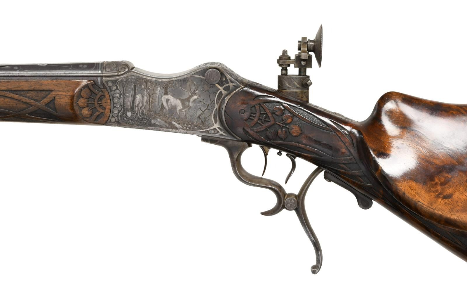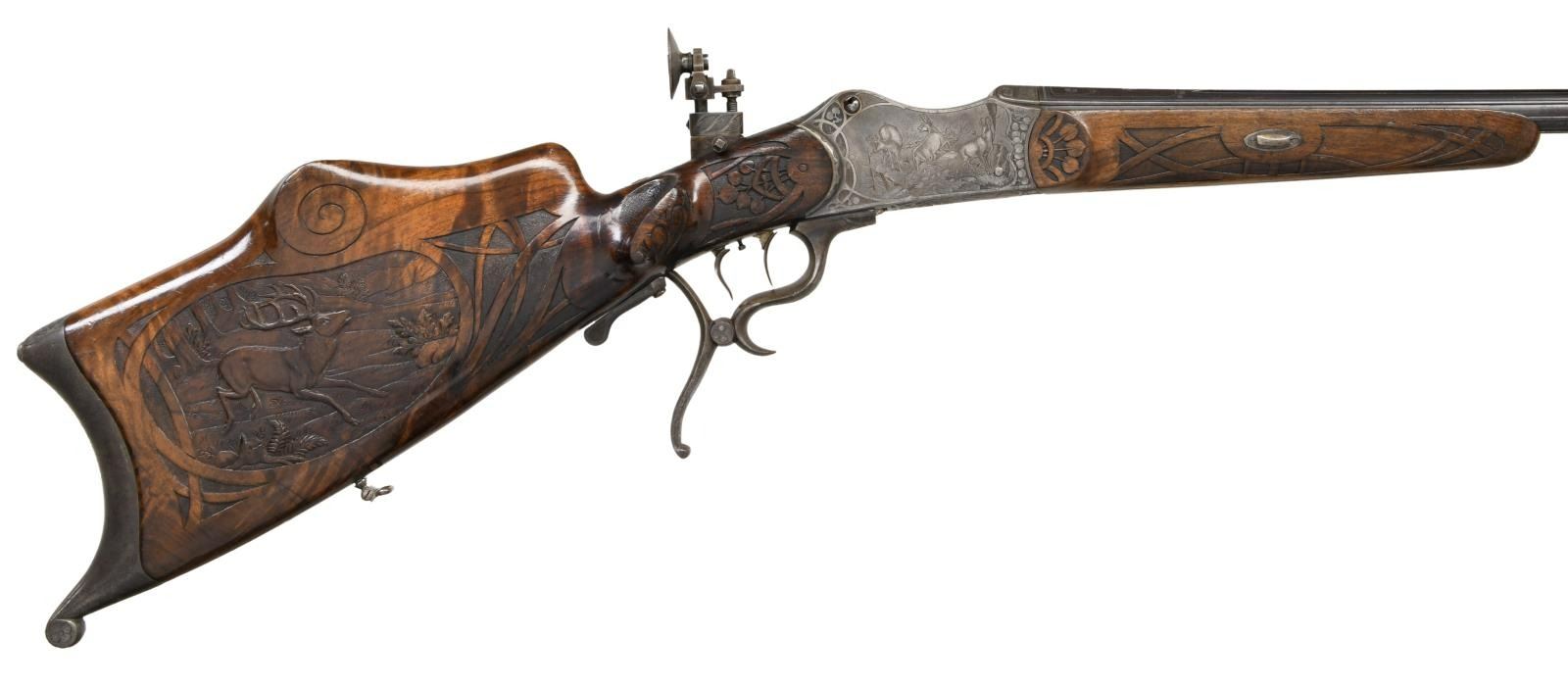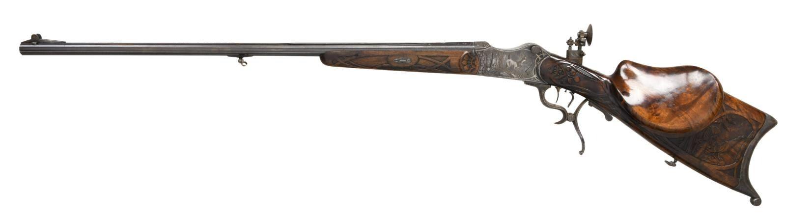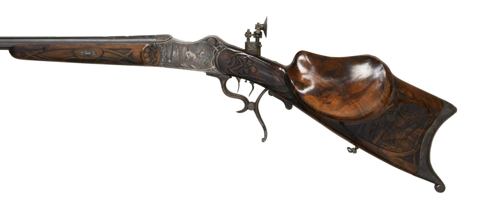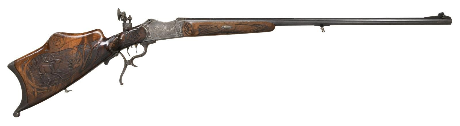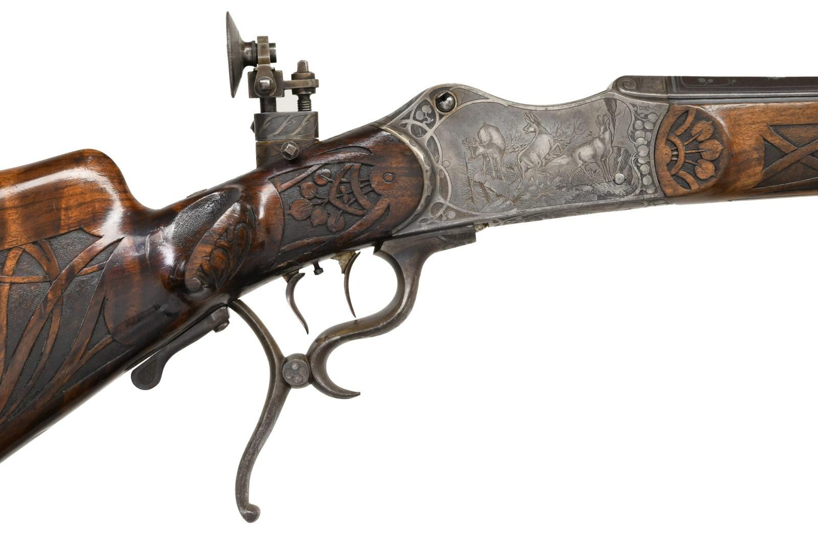 RIFLE BY H. TRIEBEL OF AUGSBURG. Cal. 8.15/46R. S# 20791 (on face of action forend removed). The 29 1/2" beautifully fluted octagon barrel has matted top rib, rear portion with swell for attachment of open sights. There is flush silver tree of life inlay at breech end surrounding semi relief silver inlay of the goddess Diana. Maker's name and address are also on top. Action is nicely filed with barrel flutes terminating in scrolls on receiver ring. Action also features removable trigger/firing group and breech block. Top tang is fitted with original windage and elevation adjustable aperture rear sight. Action is engraved with leaves matching barrel within a web of lines as border to nicely detailed game scenes. A stag and hind walking through open woodland are on left side and a trio of chamois on alpine crag are on right. Bodies of the animals have been selectively polished through original case hardening color to enhance the visual depth of these scenes. Bottom of action is engraved with a scene of an eagle grasping a rabbit in its talons. Tree of life fruit theme continues onto opening lever with finger spurs. These elements are also present on stocks where they are raised carved within bands at grip in place of checkering. Schutzen style stock with hook butt has large high right hand cheekpiece. Stock is relief carved with more game. A calling auerhahn is on left side behind cheekpiece and a running stag is on right. Matching forend attaches to barrel with side bolt through oval steel escutcheons. CONDITION: fine. Metal retaining most of its original finish with considerable silvering on high edges (some cleaning is evident on barrel). Stocks have oil rubbed into original finish. Bore is very good to fine, a bit frosted. Mechanically good. PROVENANCE: From the Harold Prucha Collection. (23-5086/MGM). CURIO. $2,000-3,000.