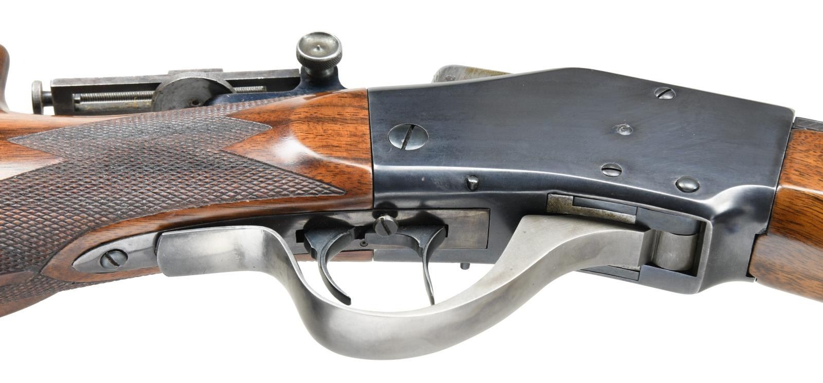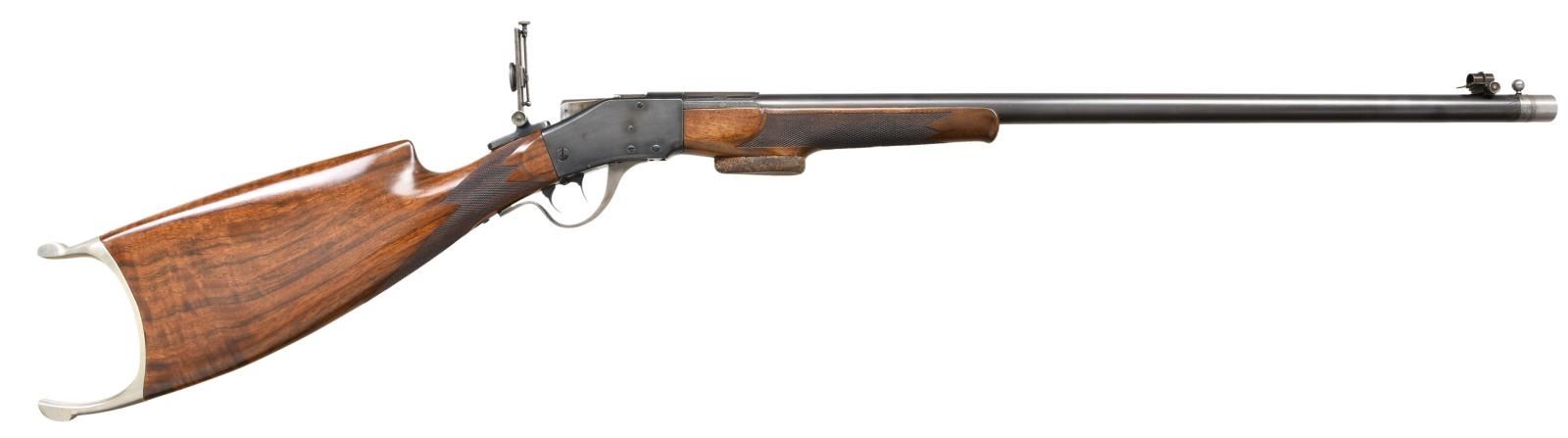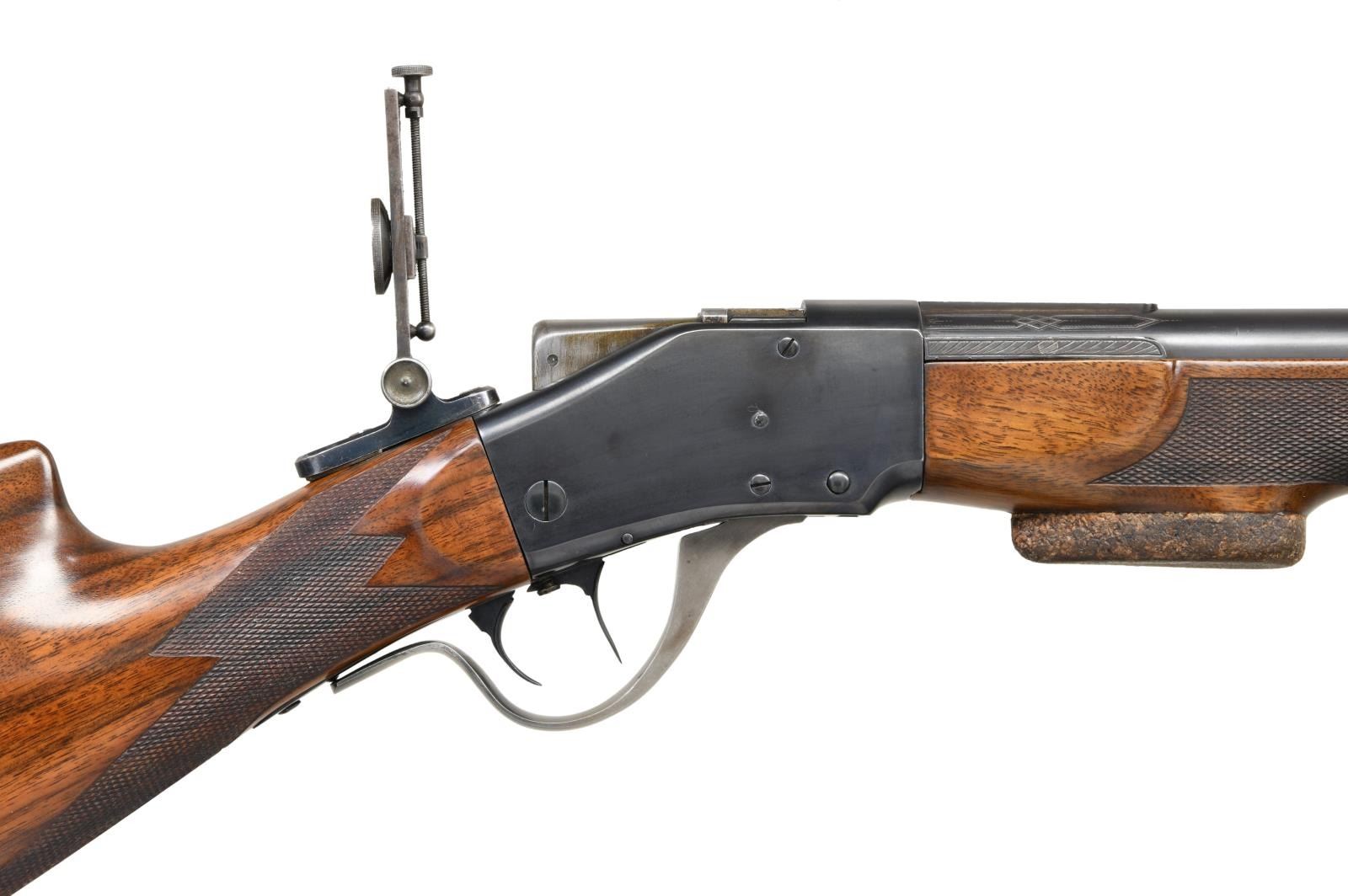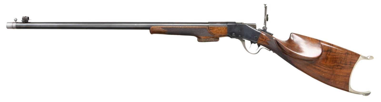OFFHAND TARGET RIFLE WITH FALSE MUZZLE, MOLDS, BULLET STARTERS, ETC. SOME BY POPE. Cal. 32-40. S# NSN. The 28" round barrel with Rigby flats is engraved "A.O. ZISCHANG SYRACUSE" on top rear. Flats have some geometric engraving. Barrel is fitted with false muzzle and windage adjustable Lyman front sight. Blued Borchardt action has had all markings removed and is fitted with double set triggers. A mid range micrometer adjustable folding rear sight is fitted to top tang. Offhand style perch bellied buttstock of figured American walnut features nickel plated double hook offhand buttplate, swept right hand cheekpiece and point pattern checkering. Matching forend has cork hand support. UNATTACHED ACCESSORIES: Wooden box with brass handle has brass plate engraved "August O. Zischang" and contains: spare straight grip buttstock of plain American walnut, brass single cavity bullet mold marked "H.M. Pope" along with Pope style bullet starter for false muzzle, starter for breech loading and lubricator. Also included are an O.A. Bremer capper/decapper, an unmarked steel three cavity mold, Ideal #2 powder drop tube and other assorted tools and cartridge cases. CONDITION: fine as refinished. Barrel and action with nearly all rust reblue over some light marks. Stocks with oil refinish have some heavy marks. Checkering recut. Bore is fine with strong rifling throughout but shows a hint of frosting. Mechanically good. Accessories are generally good. Zischang rifles are highly sought after. He was one of the big names of the late 19th, early 20th Century. PROVENANCE STATEMENT: From the Harold Prucha Collection. (01-23228/MGM). ANTIQUE. $3,500-5,500.