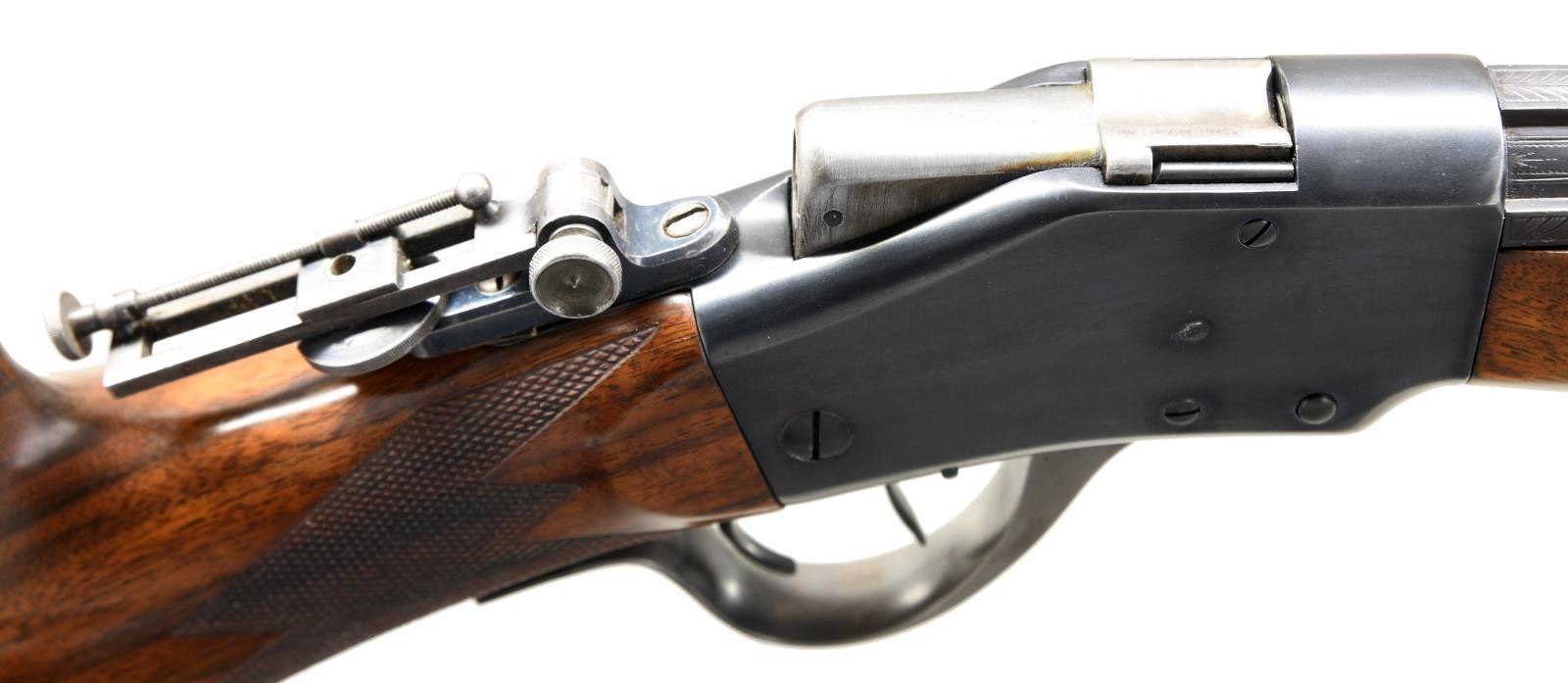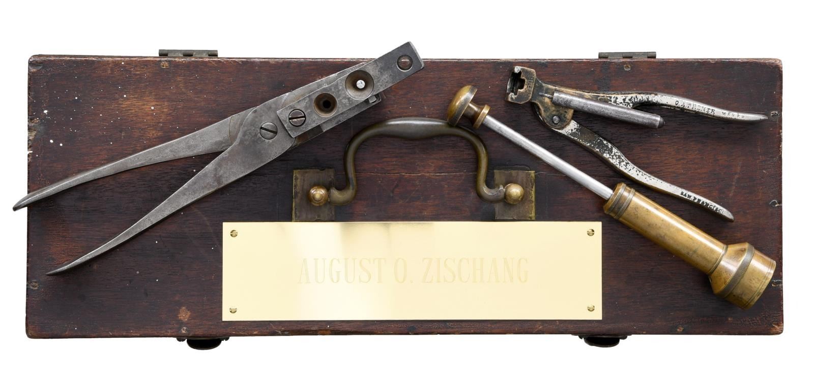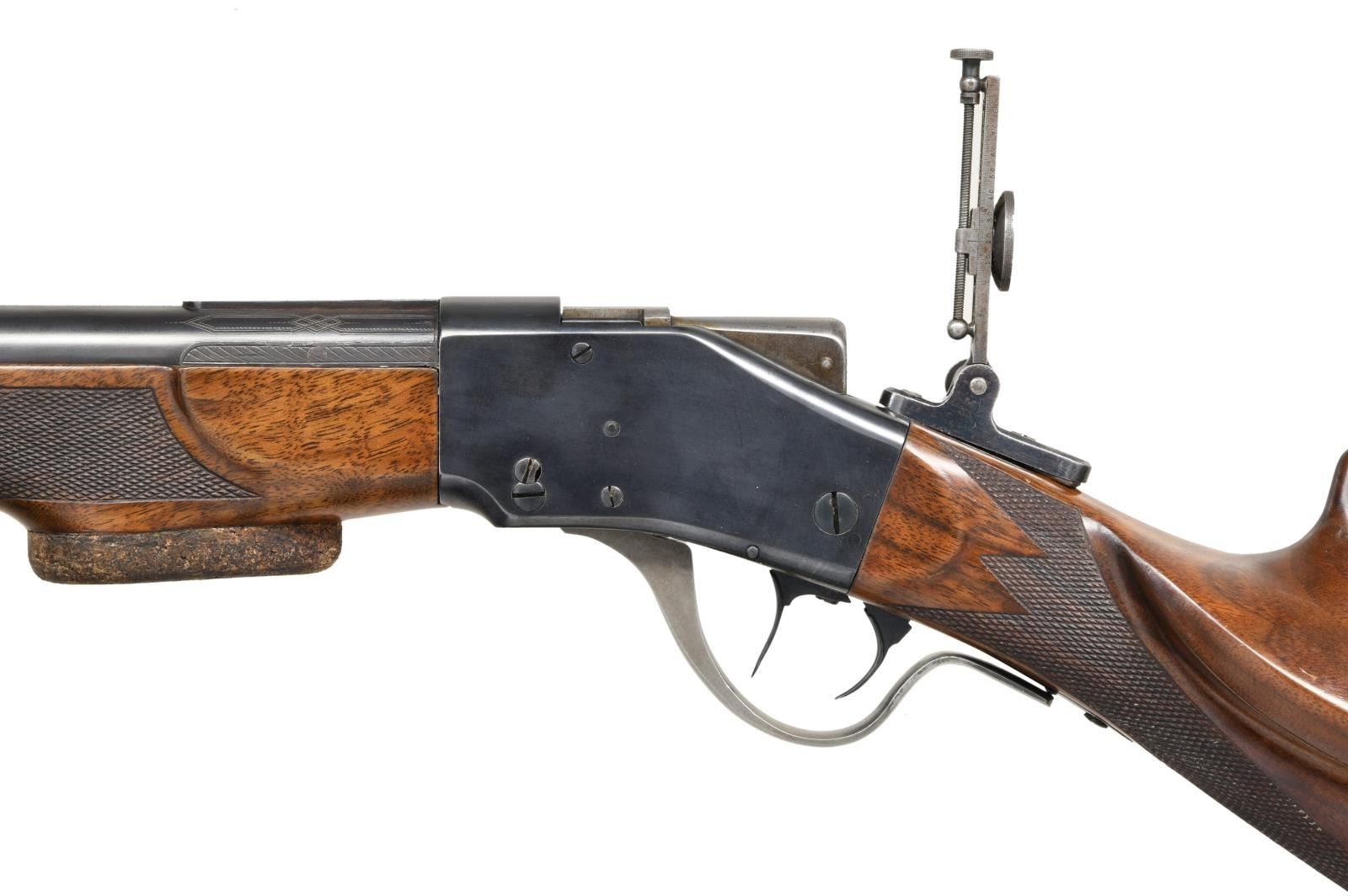 OFFHAND TARGET RIFLE WITH FALSE MUZZLE, MOLDS, BULLET STARTERS, ETC. SOME BY POPE. Cal. 32-40. S# NSN. The 28" round barrel with Rigby flats is engraved "A.O. ZISCHANG SYRACUSE" on top rear. Flats have some geometric engraving. Barrel is fitted with false muzzle and windage adjustable Lyman front sight. Blued Borchardt action has had all markings removed and is fitted with double set triggers. A mid range micrometer adjustable folding rear sight is fitted to top tang. Offhand style perch bellied buttstock of figured American walnut features nickel plated double hook offhand buttplate, swept right hand cheekpiece and point pattern checkering. Matching forend has cork hand support. UNATTACHED ACCESSORIES: Wooden box with brass handle has brass plate engraved "August O. Zischang" and contains: spare straight grip buttstock of plain American walnut, brass single cavity bullet mold marked "H.M. Pope" along with Pope style bullet starter for false muzzle, starter for breech loading and lubricator. Also included are an O.A. Bremer capper/decapper, an unmarked steel three cavity mold, Ideal #2 powder drop tube and other assorted tools and cartridge cases. CONDITION: fine as refinished. Barrel and action with nearly all rust reblue over some light marks. Stocks with oil refinish have some heavy marks. Checkering recut. Bore is fine with strong rifling throughout but shows a hint of frosting. Mechanically good. Accessories are generally good. Zischang rifles are highly sought after. He was one of the big names of the late 19th, early 20th Century. PROVENANCE STATEMENT: From the Harold Prucha Collection. (01-23228/MGM). ANTIQUE. $3,500-5,500.