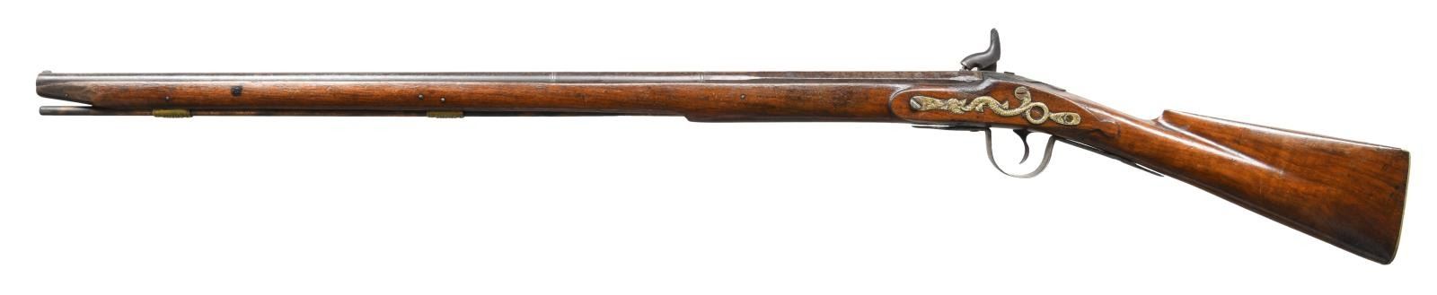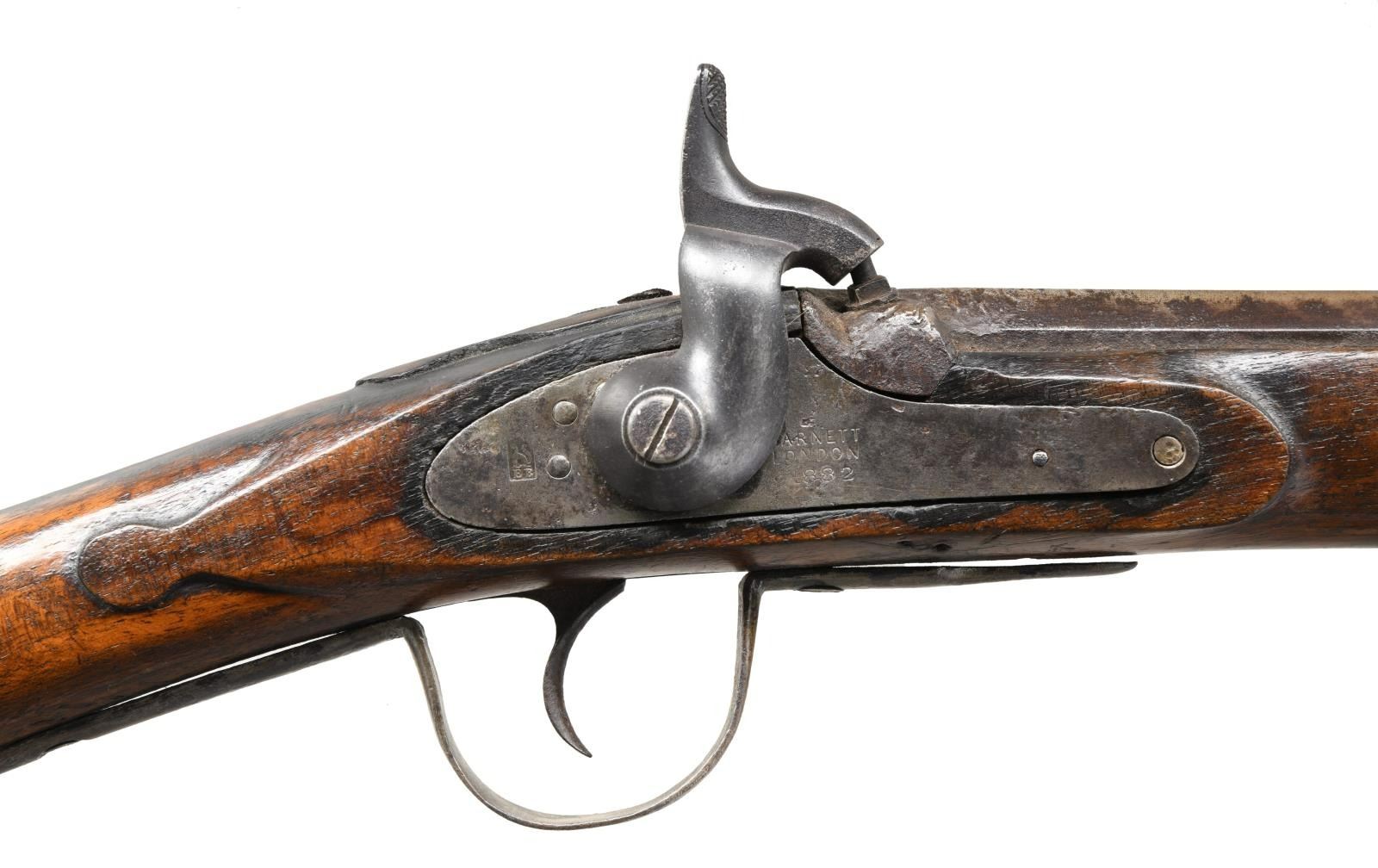 BARNETT. Cal. 56. NSN. Bbl. 34" part oct. part rnd. Bbl. has British proofs. Rear of lock has Hudson Bay Tombstone Fox over the letters "EB". Center of lock marked "BARNETT LONDON 1882". Brass buttplate w/ five screws. Sea monster sideplate w/ three screws. Oversized trigger & trigger guard. Walnut stock. Hickory ramrod present. CONDITION: stock has older added varnish w/ a 3 1/2" crack at front of right side, scattered flaking, dings & handling wear. Metal is overall a dull gray patina w/ some tool marks at rear of bbl., scattered pitting & oxidation. Oxidized bore. PROVENANCE: From the Lifelong Collection of Glen E. Mattox. (01-22549/MJC). ANTIQUE. $1500-2000.