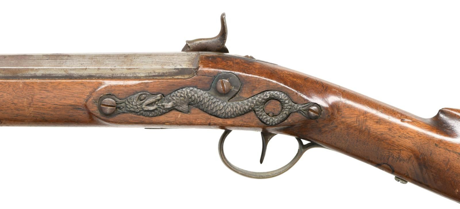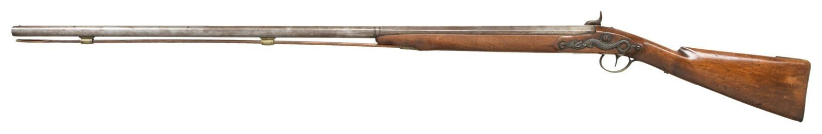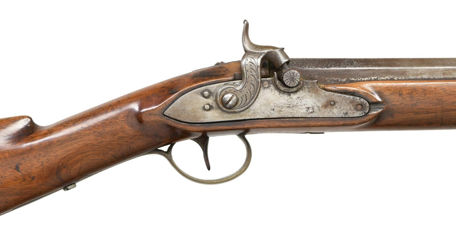 FOWLER. Cal. 70. NSN. Bbl. 40 1/2". This musket has been converted from flint to percussion. The barrel is octagon to round with a ringed embellishment 15" up from the bolster. Barrel has a Belgian proof on the right facet. It is possible that this gun is part of a Belgian 200-gun order through Messrs. Rochussen Heintzmann of London. The barrel has a drum conversion to percussion. The percussion lock is unmarked and has an engraved hammer. Brass trigger guard, butt plate, dragon side plate, entry thimble, and ramrod thimbles. 30 1/2" half stock with a wooden ramrod. SUPPORTING DOCUMENTATION: copied information about Hudson Bay trade guns. CONDITION: barrel has a medium gray patina, as does the lock. Lock holds both full & half cock. Brass has a mellow mustard patina. Wood has been pleasingly refinished and has a minor loss at the front of the lock plate. Fair bore. (01-23396/BF). ANTIQUE. $1,000-1,400.