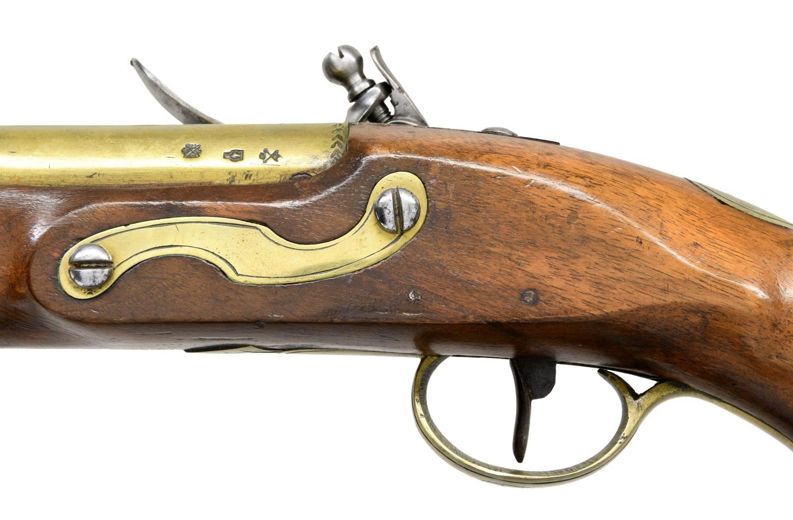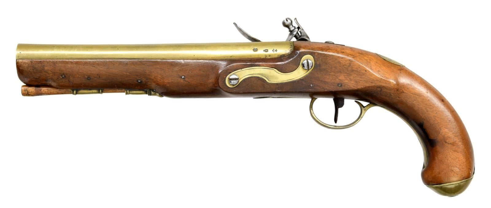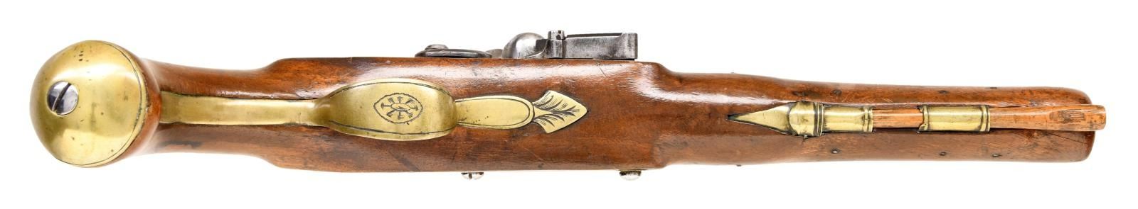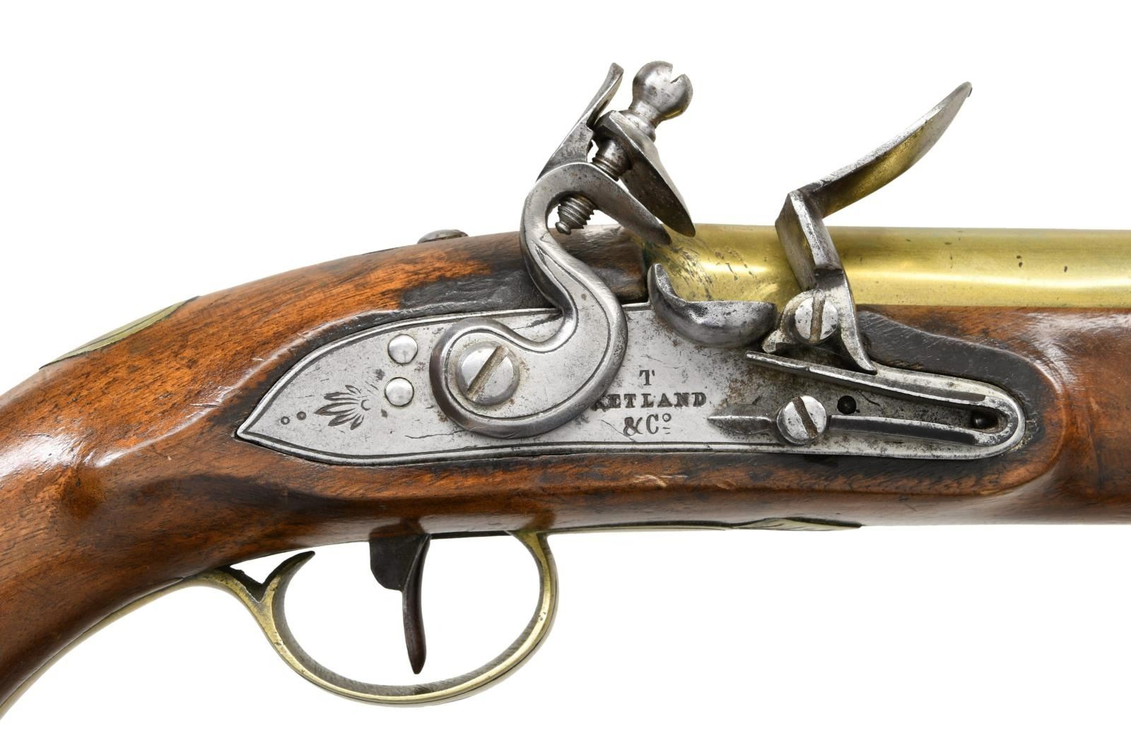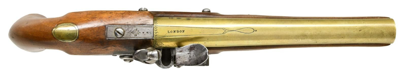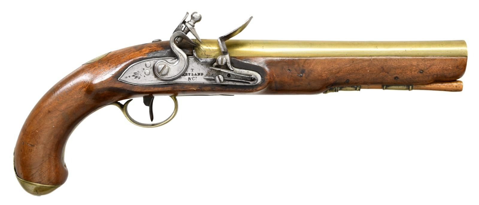 PISTOL. Cal. 69. NSN. Brass smoothbore 8 3/4" bbl. Top flat marked "LONDON" w/ left side of bbl. having Birmingham proofs. Bbl. tang has fern frond proof. Lock has fern frond behind hammer & marked "T / KETLAND & Co". Walnut stock w/ brass furniture & hardwood ramrod. CONDITION: brass is acquiring a pleasing mustard patina w/ light marks. Sideplate screws appear cleaned. Lock shows light patina w/ a few deep scratches. Stock has wood inletted repair diagonally from rear of sideplate to behind trigger; wood shows light sanding & refinish. Stock mostly intact w/ sm. cracks & handling marks. Dark pitted bore. PROVENANCE: From the Lifelong Collection of Glen E. Mattox. (01-22408/MD). ANTIQUE. $800-1,200.