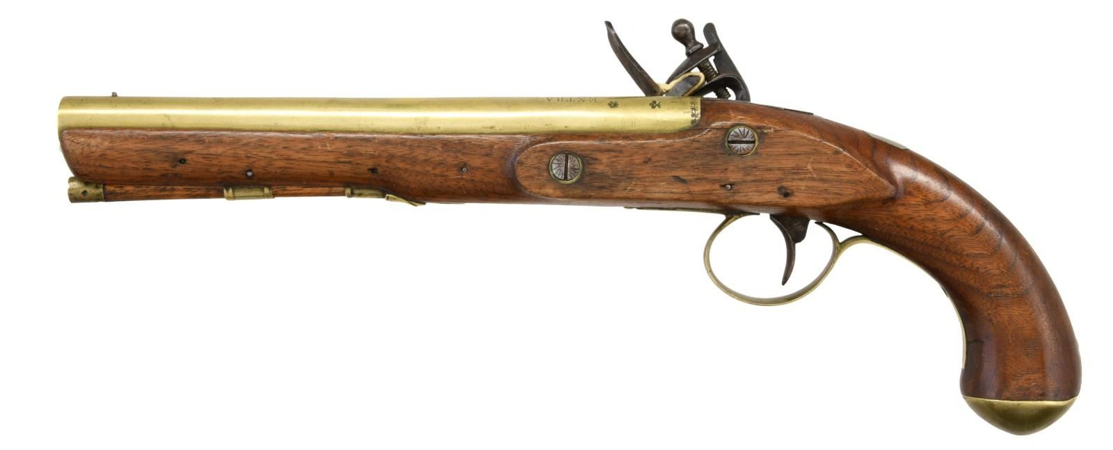Cal. 54. NSN. Bbl. 9" brass. Sharpe was in the gun making business from 1800 until 1840. Sharpe had a contract w/ the Hudson Bay Company to supply flintlock pistols to native tribes in exchange for fur pelts. Top of bbl. marked "EXTRA SHARPE PROOF". Bbl. also marked w/ Birmingham proofs. Rear of lock has tulip flower. Center of lock marked "SHARPE". Hammer operates stiffly & may require attention to fix. Walnut stock w/ brass furniture. Top of stock has German silver plaque. Wooden ramrod w/ brass tip. CONDITION: stock has a notable chip forming above lock, a few smaller chips, a couple cracks, scattered dings & handling wear. Brass parts remain partially bright w/ scattered oxidation & some dings. Lock assembly is turning gray w/ scattered oxidation. Oxidized smoothbore. PROVENANCE: From the Lifelong Collection of Glen E. Mattox. (01-22409/MJC). ANTIQUE. $800-1200.