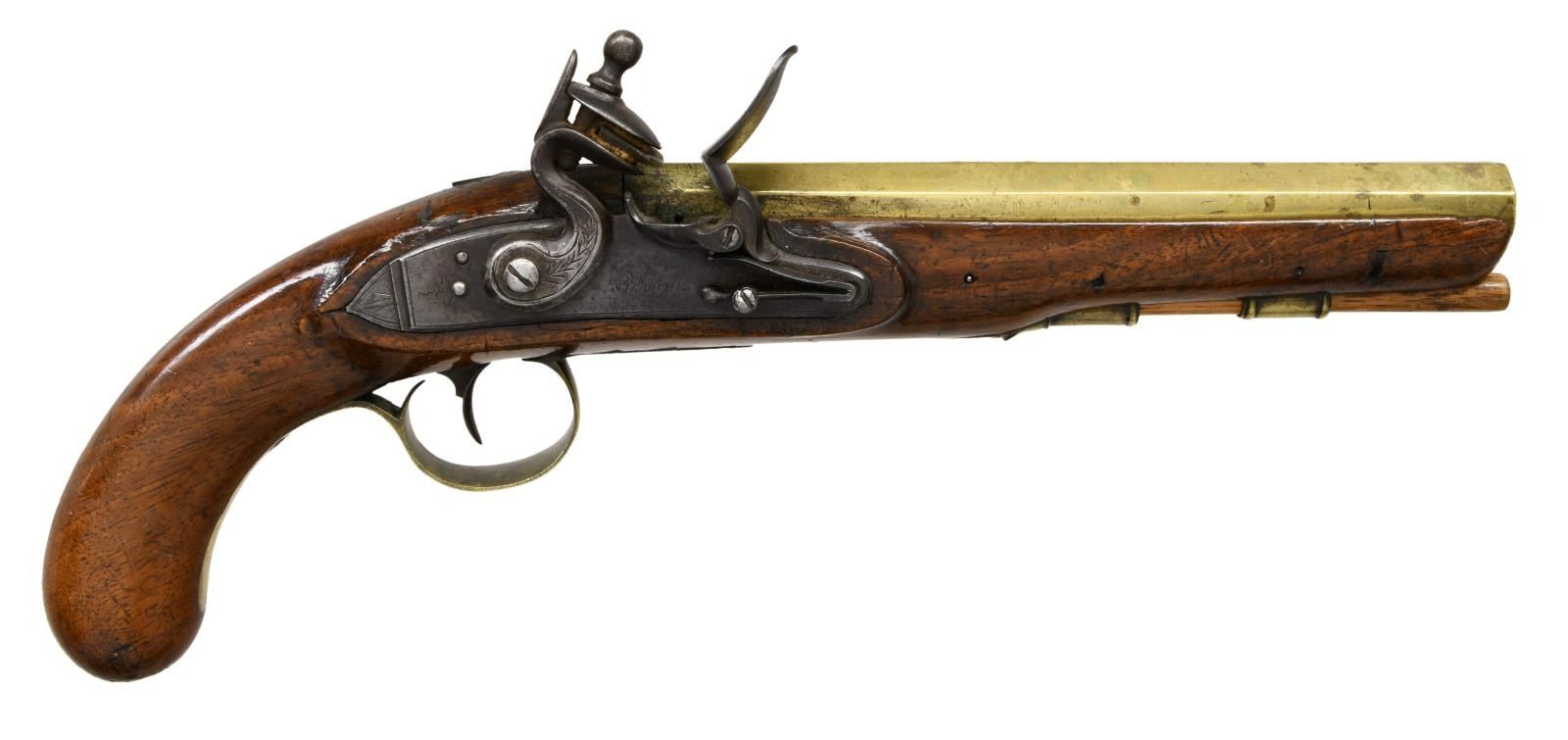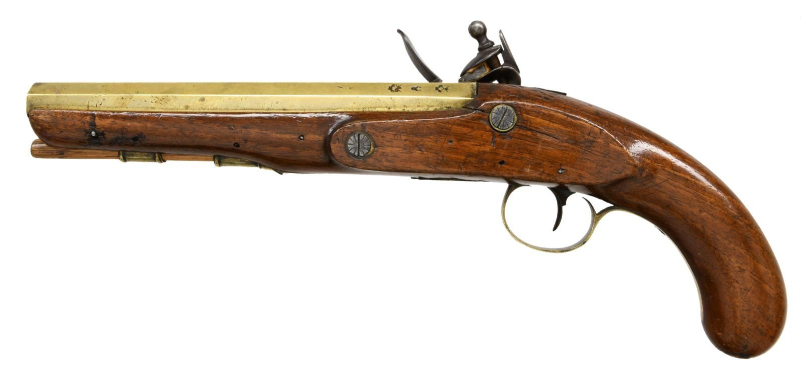 PISTOL. Cal. 55. NSN. Bbl. 8" brass oct. Pistol is devoid of sights. Top bbl. flat marked "LONDON". Left side of bbl. has Birmingham proofs. Center of lock marked "SHARPE". Hardwood stock w/ brass furniture. Hickory ramrod present. CONDITION: stock has added finish w/ a few glue repaired cracks most notably above the lock, scattered dings & handling wear. Lock parts are a dull gray patina w/ some light pitting, dings & scattered oxidation. Brass parts appear cleaned w/ scattered oxidation & dings. Oxidized bore. PROVENANCE: From the Lifelong Collection of Glen E. Mattox. (01-22413/MJC). ANTIQUE. $800-1200.